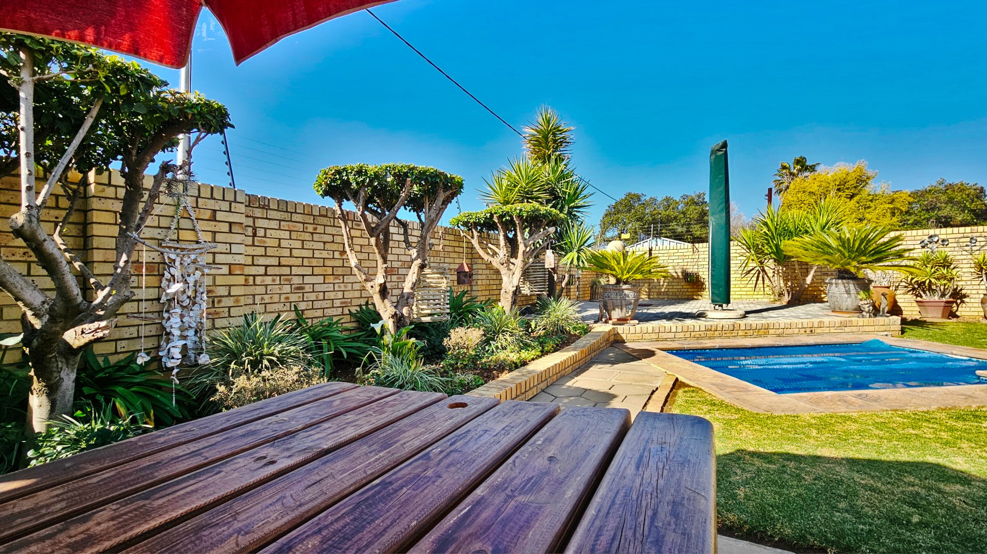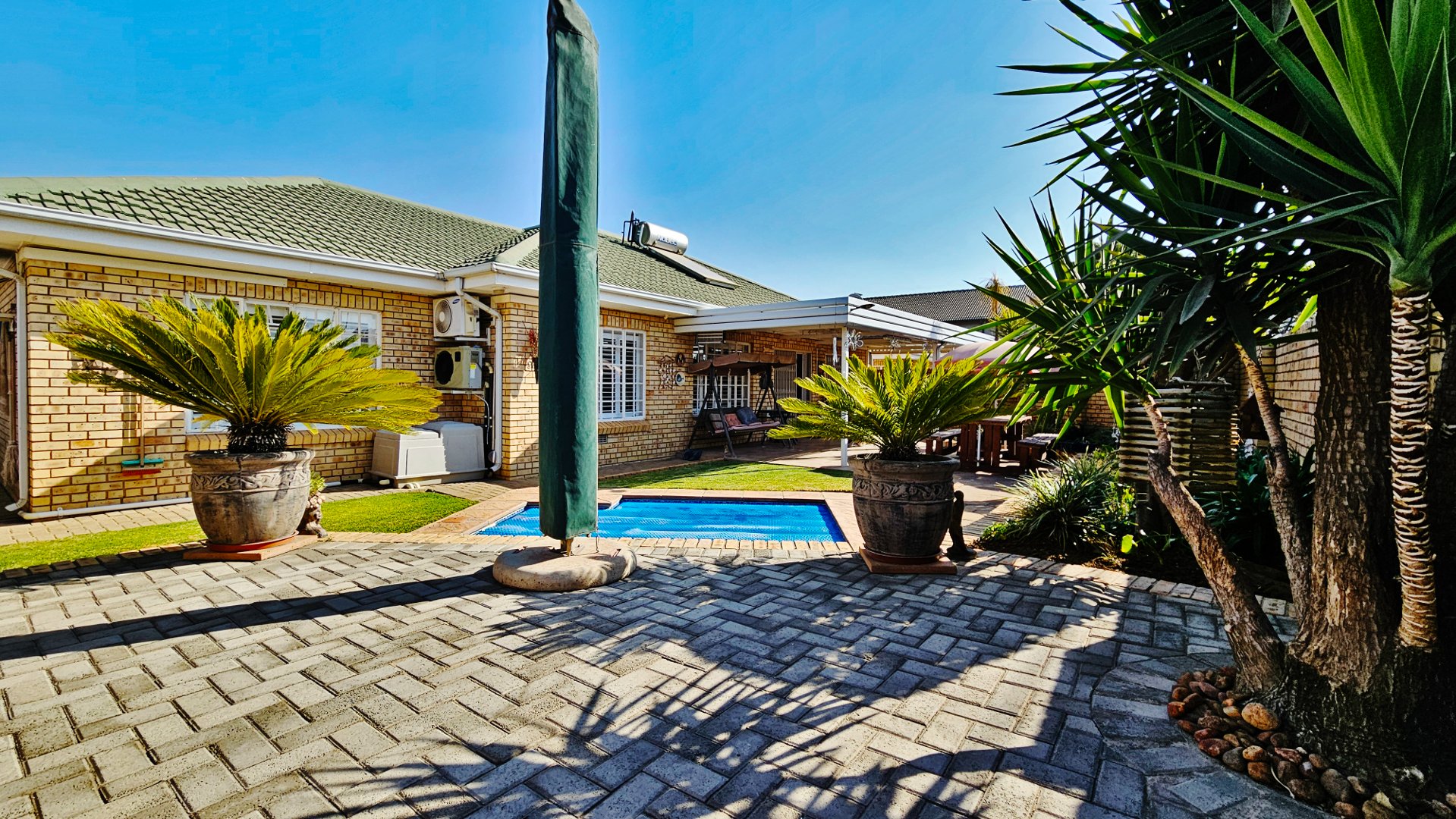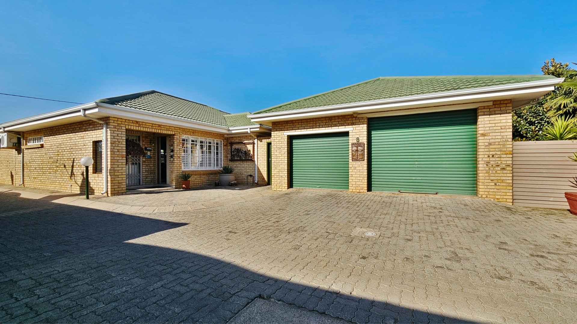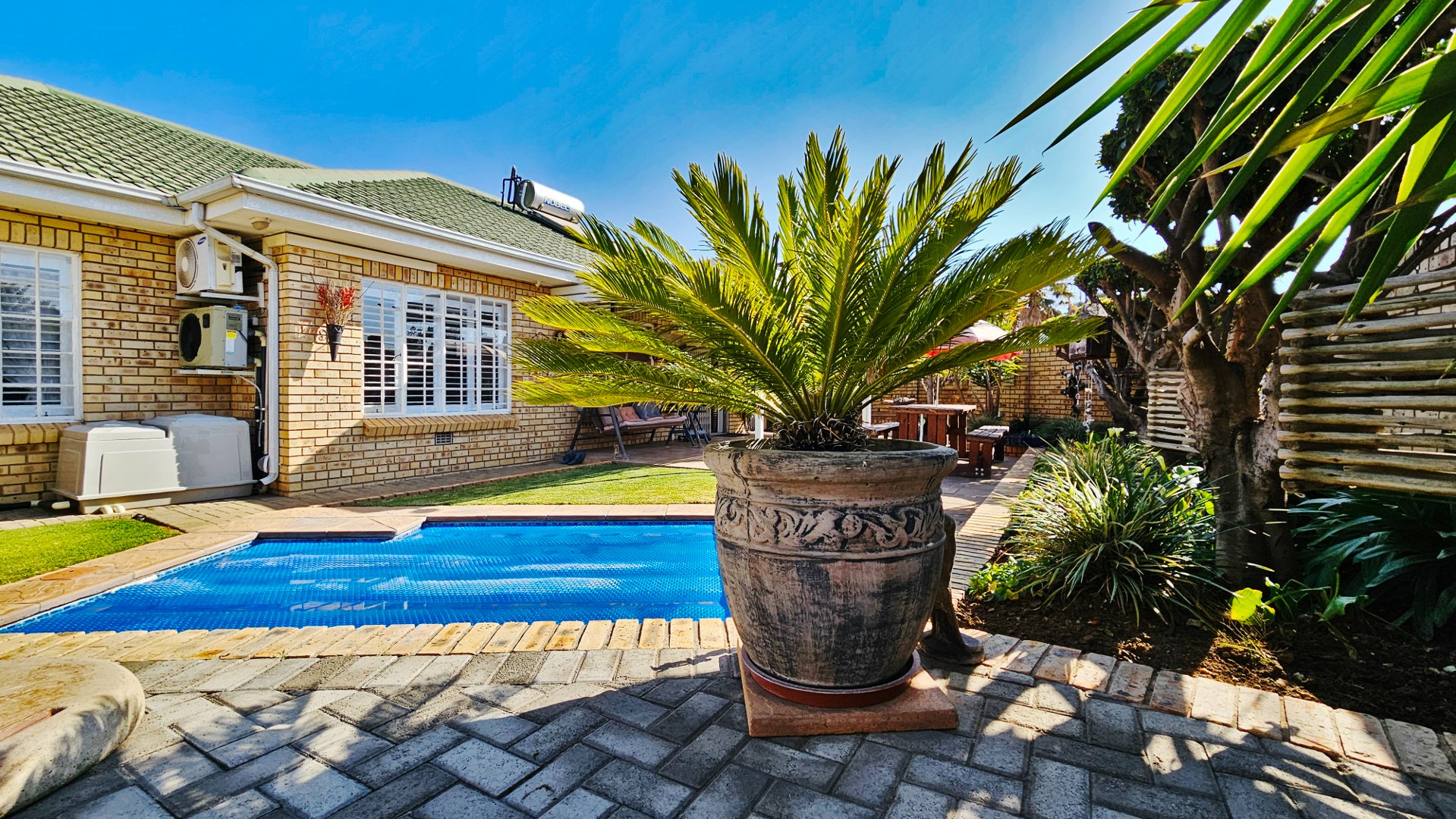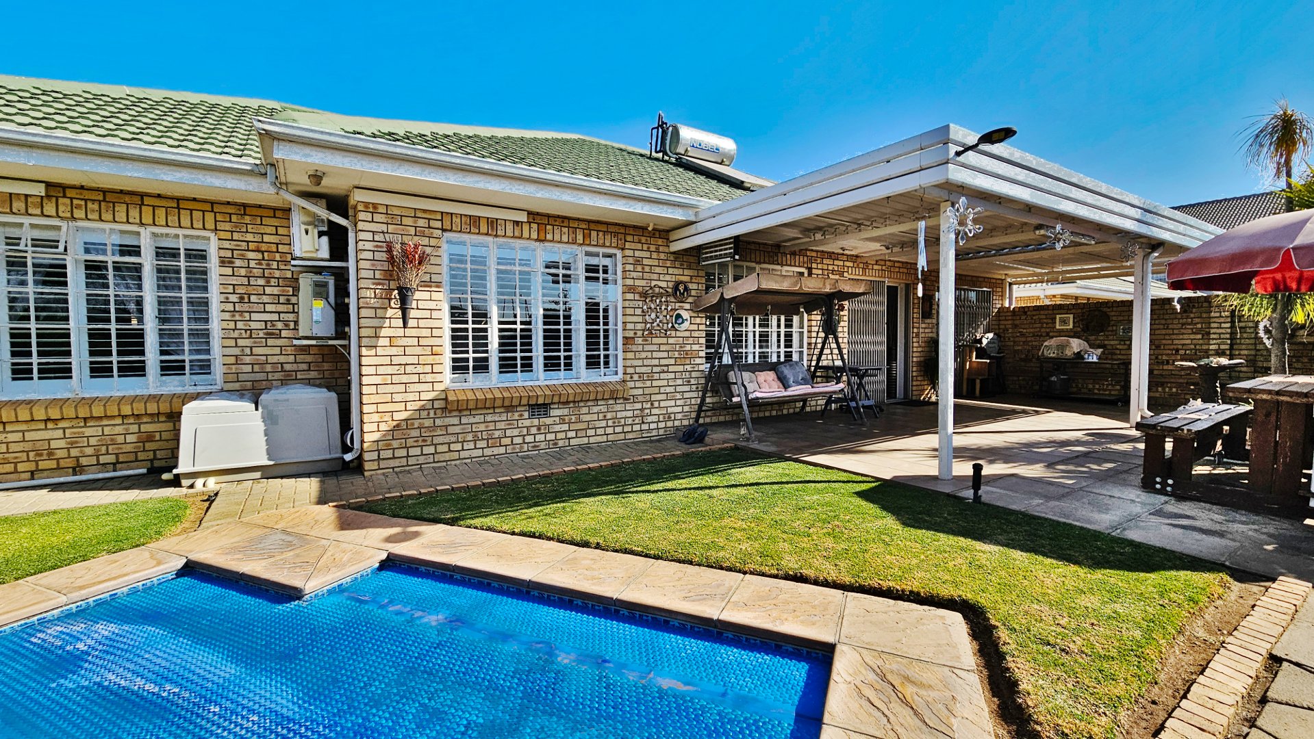 The sun-drenched unit offers beautiful outside space with a heated pool, a pleasant louvered patio, its own borehole with irrigation, a JoJo tank with pressure pump, and a water-purifier system connected to the home (all professionally installed). A double tandem garage (one side suitable to accommodate a caravan) also offers a large study / home office.