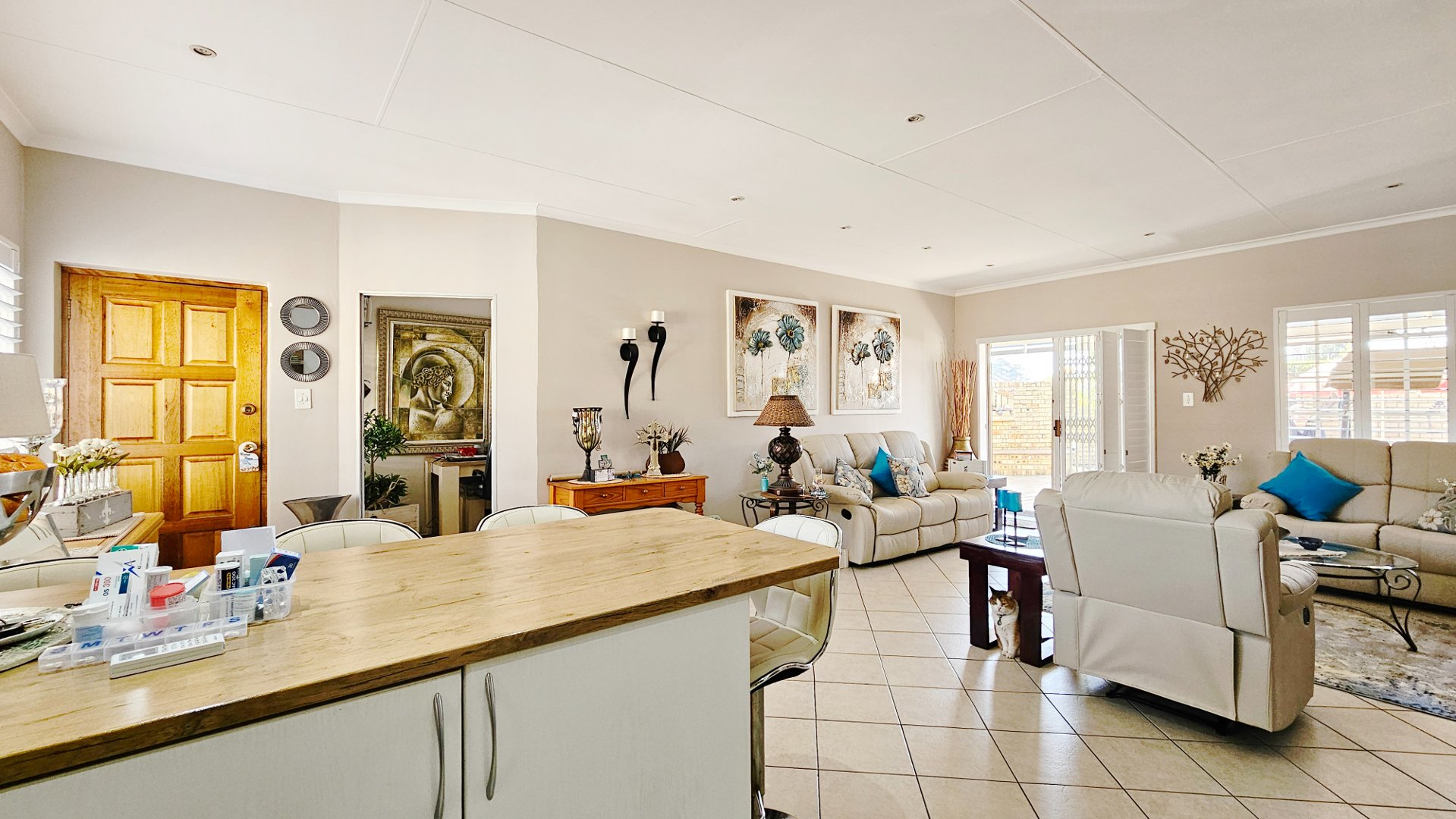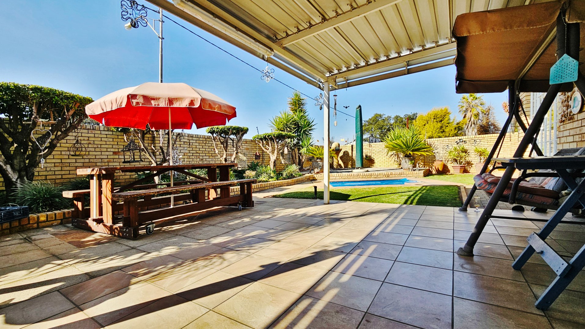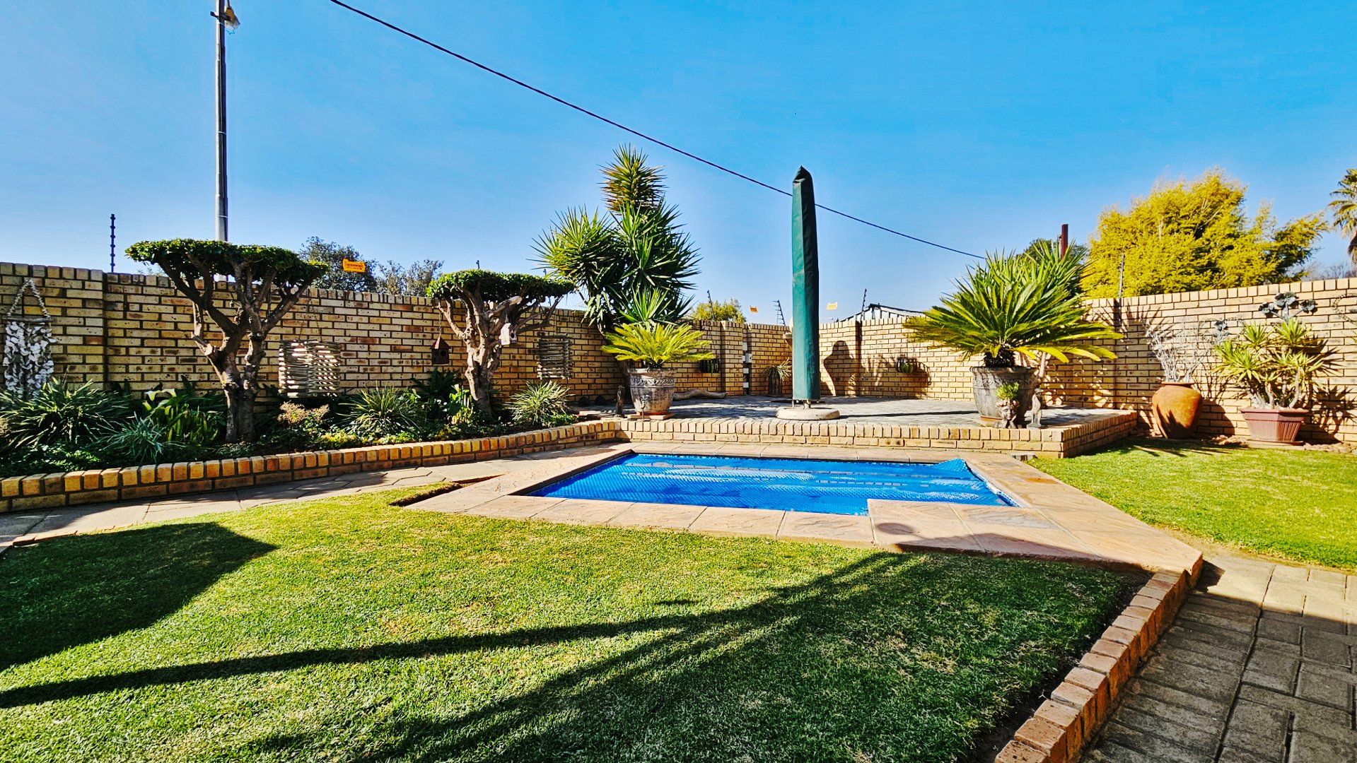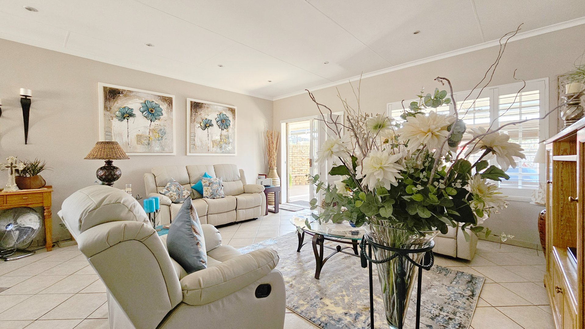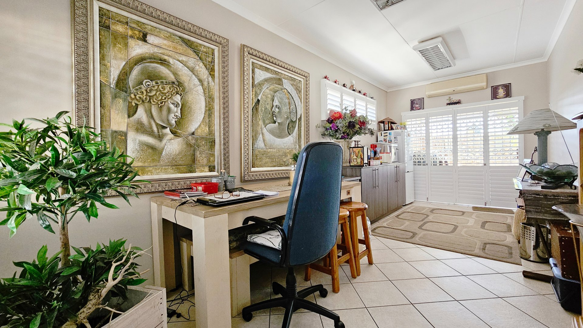 The sun-drenched unit offers beautiful outside space with a heated pool, a pleasant louvered patio, its own borehole with irrigation, a JoJo tank with pressure pump, and a water-purifier system connected to the home (all professionally installed). A double tandem garage (one side suitable to accommodate a caravan) also offers a large study / home office.