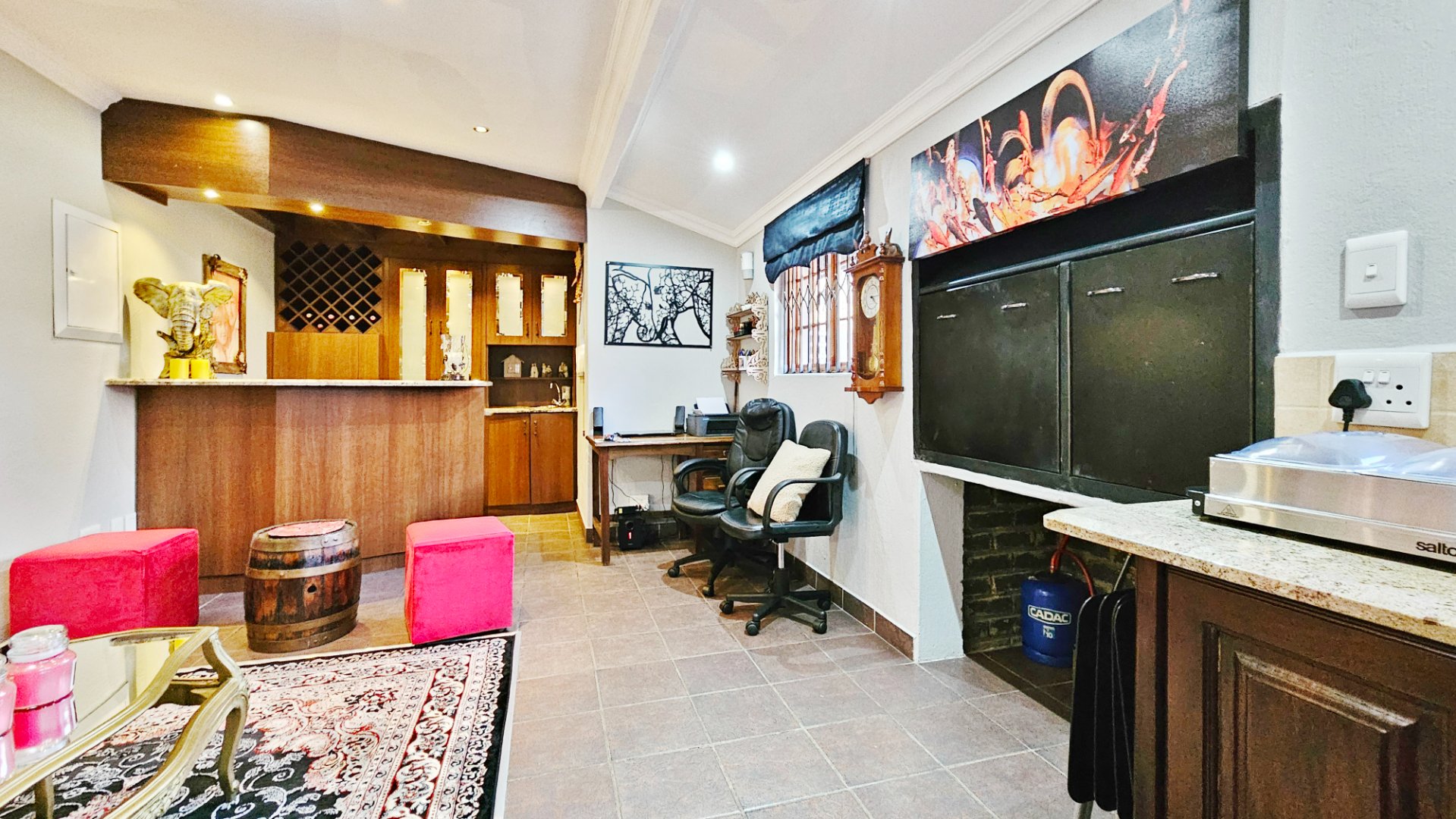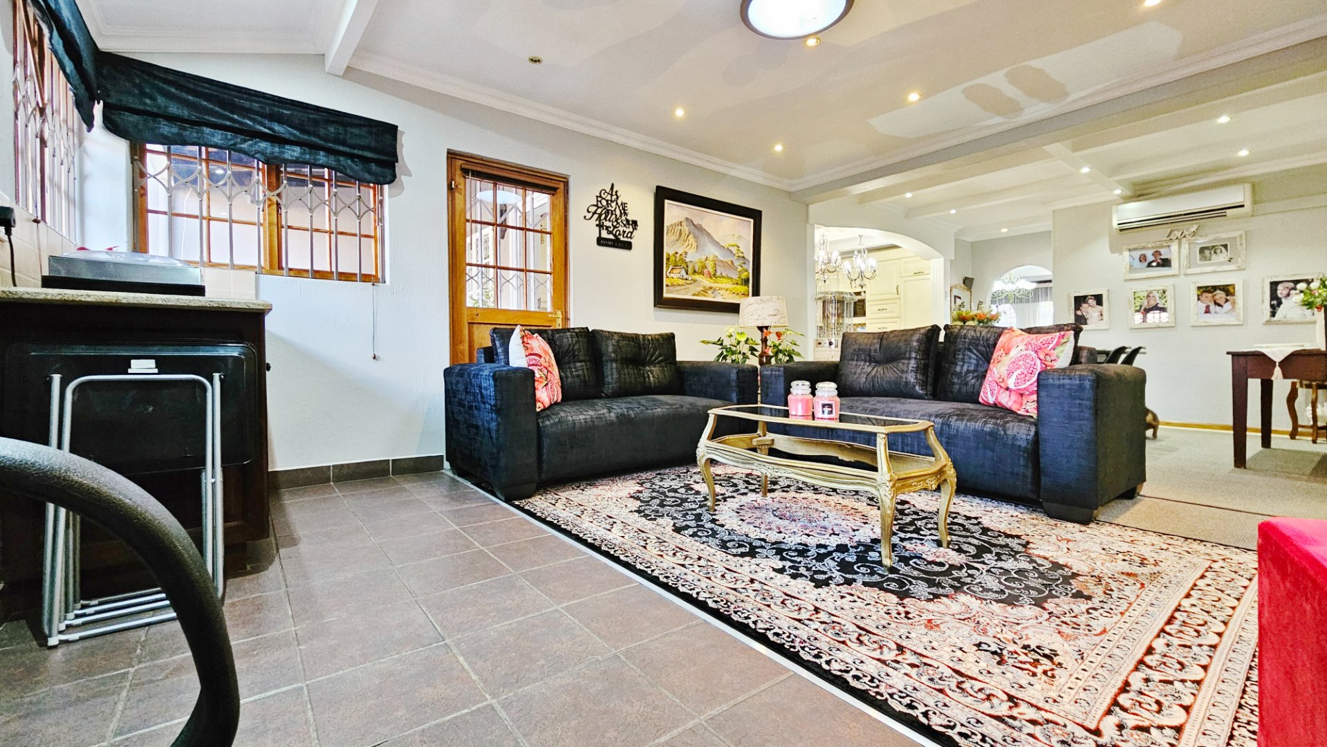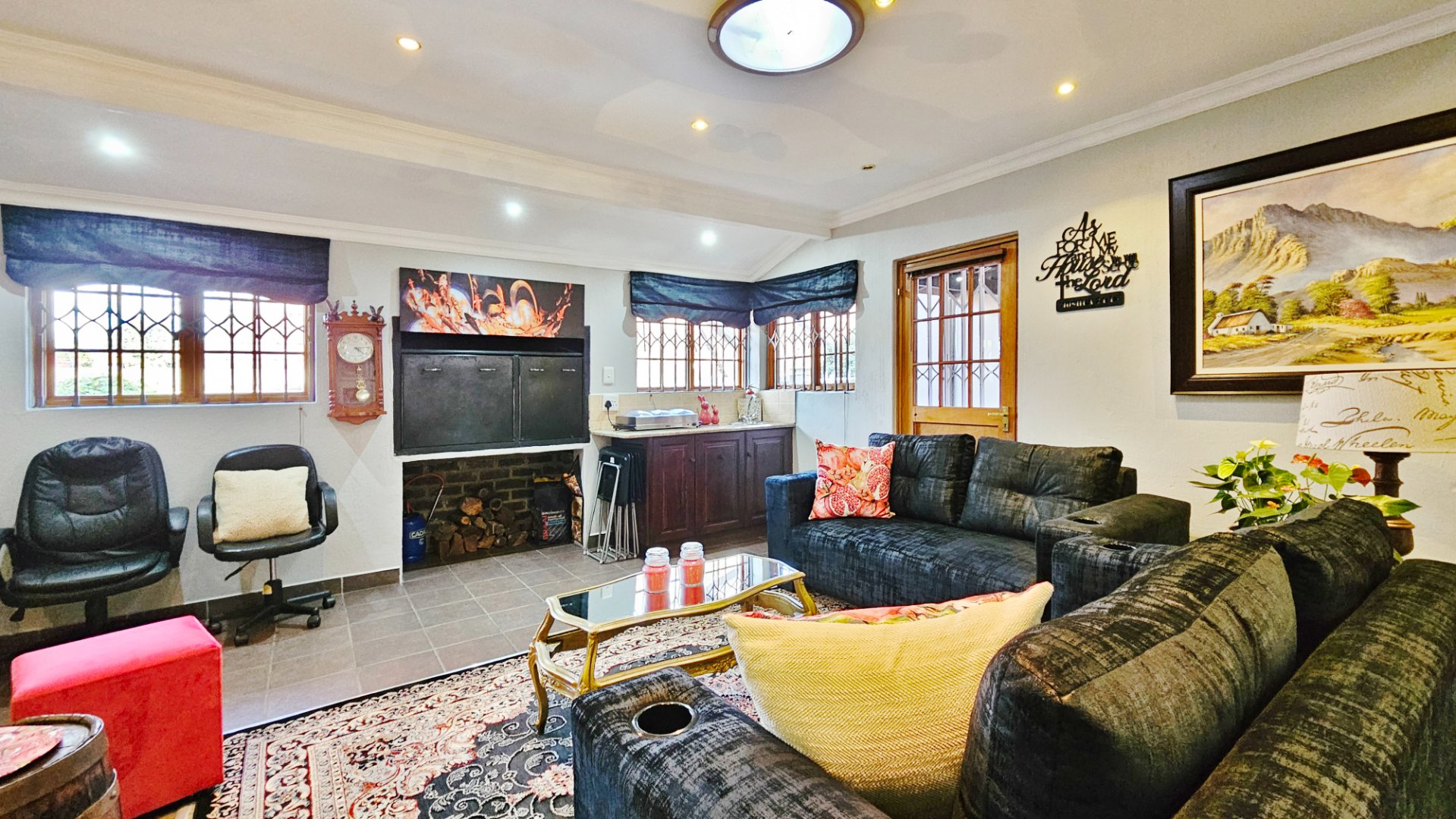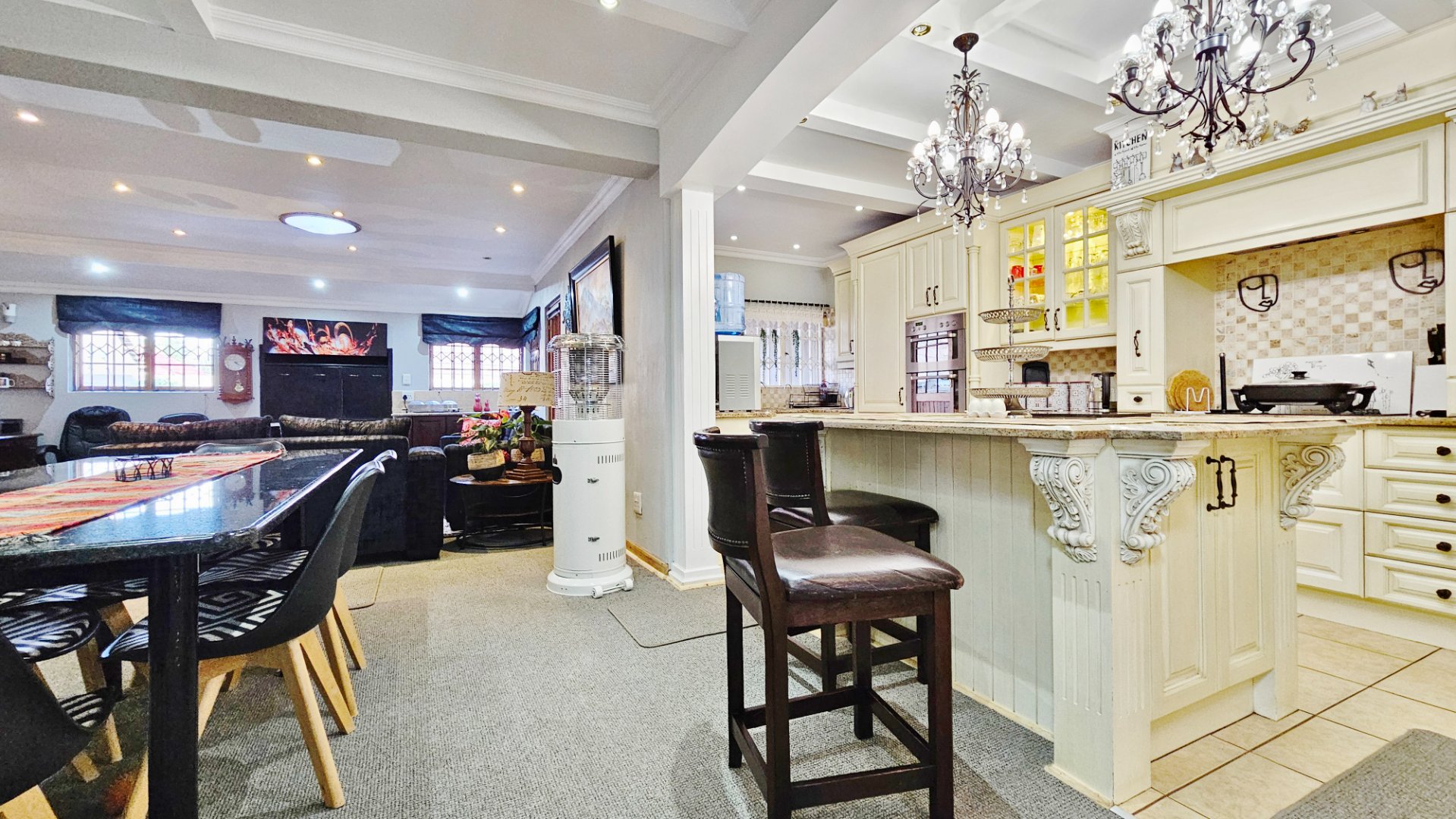 This home boasts several additional features, including four air-conditioning units, a solar geyser, and an 11KVA inverter system. Parking arrangements are a single garage and a carport. The whole complex is protected by electric fencing all around.