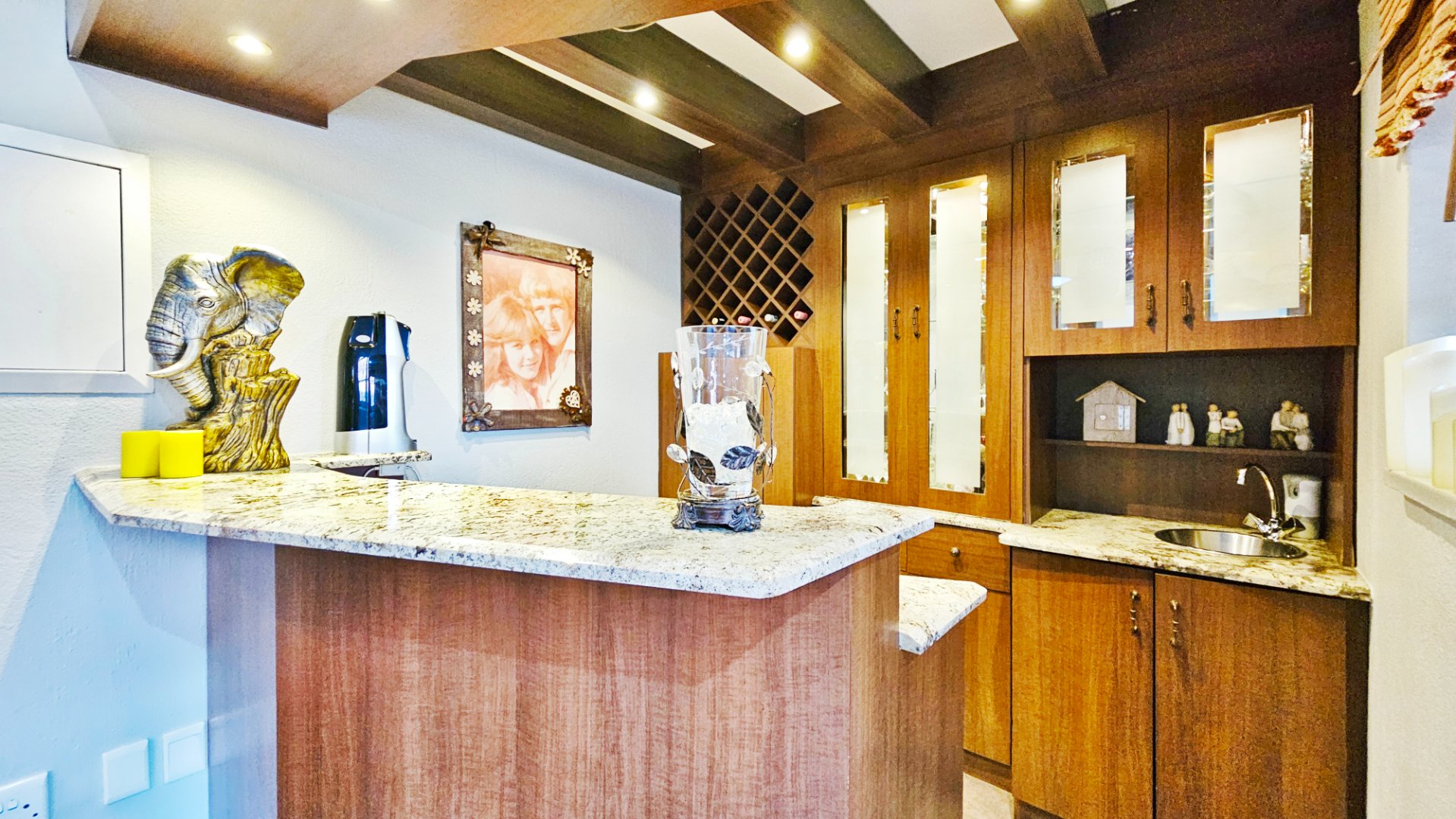 Accommodation is arranged over two floors. Downstairs offers surprisingly spacious living areas with access to the garden, a guest WC, a stunning open-plan kitchen with integrated appliances (a fridge / freezer and a dishwasher) and beautiful granite worktops, a braai room with both gas – and fire braai’s as well as a fitted bar, also with an integrated fridge.
