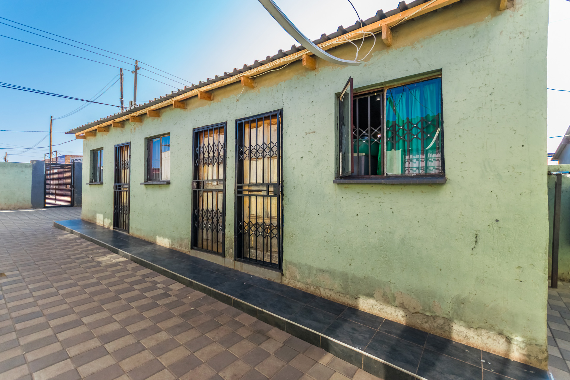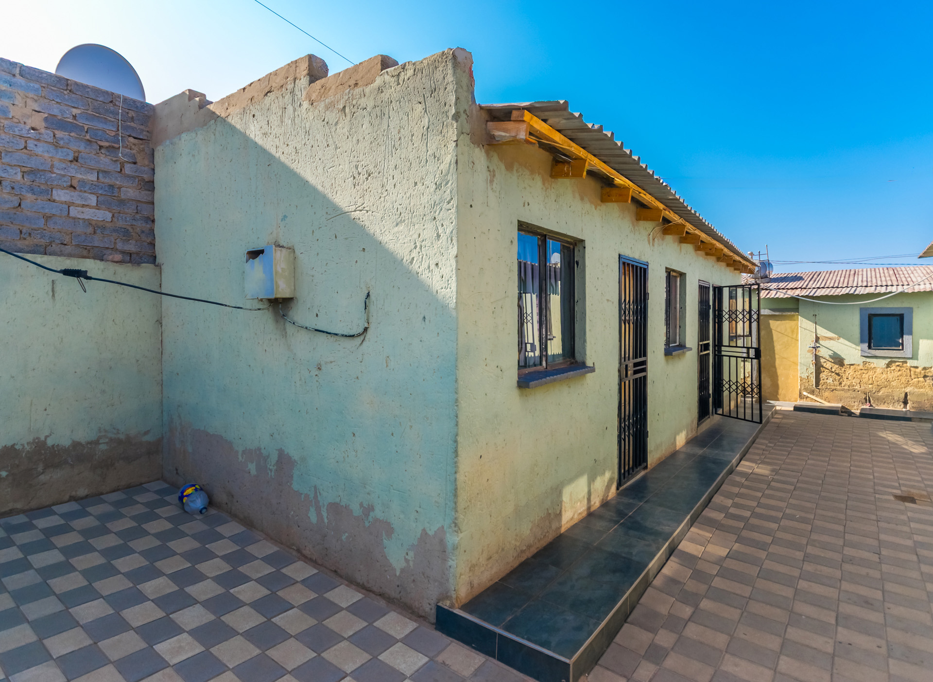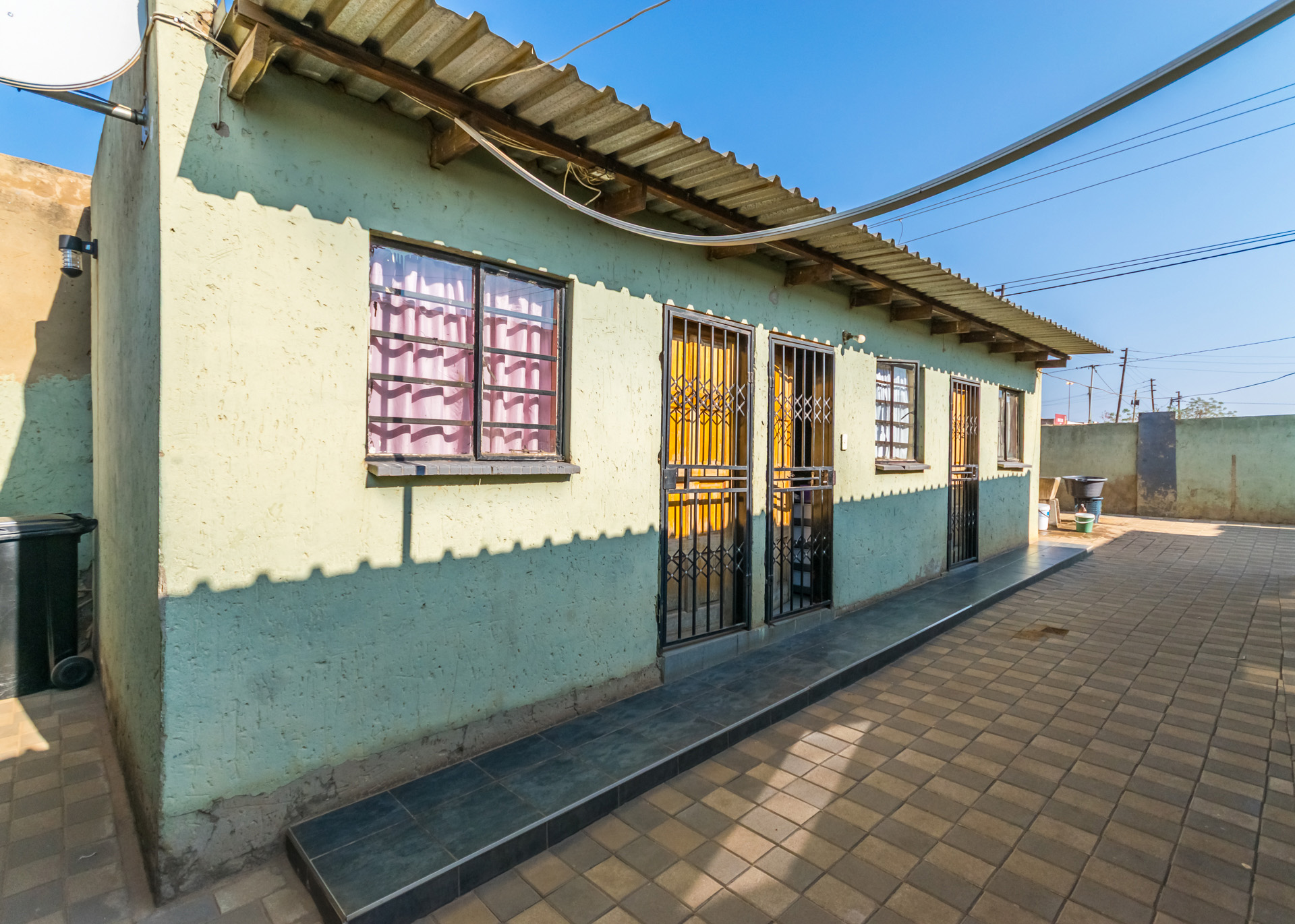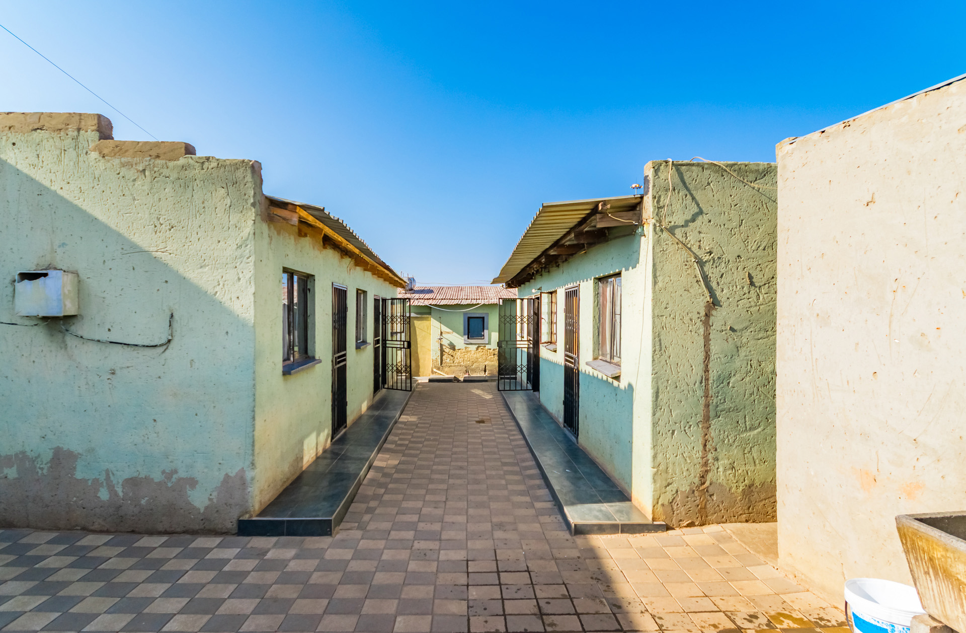 An investment home at Thulani. This home gives you a very neat yard as you enter. As you enter your standard open-plan kitchen and lounge. Facing a small passage, you enter your first bedroom with wall cupboards and your second bedroom with wall cupboards. As an investor or a large family, you will love this, as it includes 6 neat flatlets as extra space. The yard is comfortable with two car parking spaces.