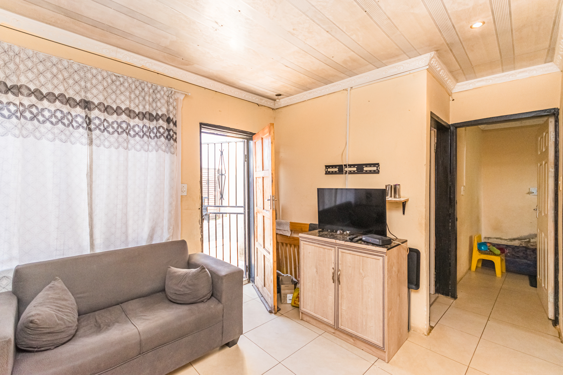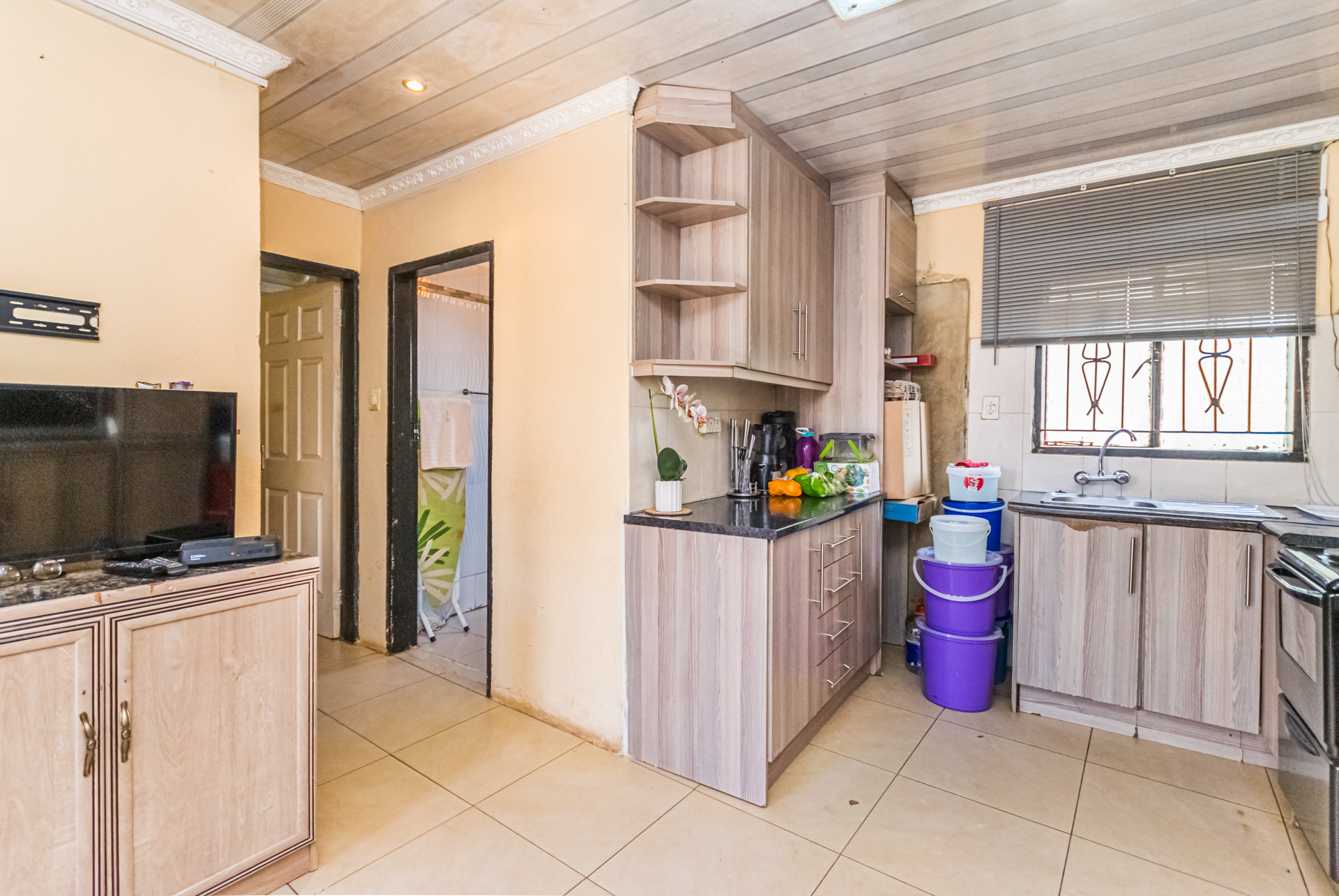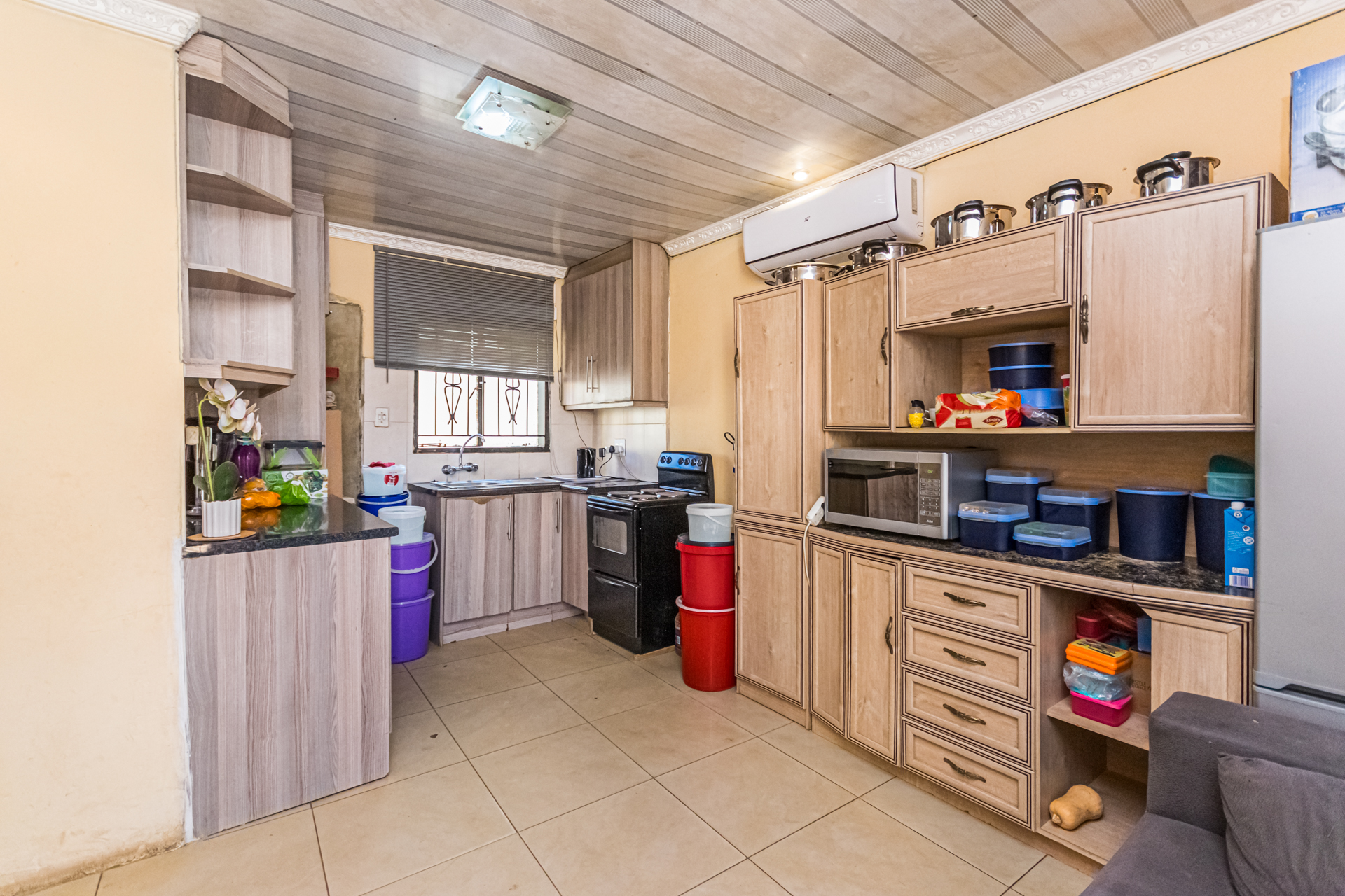 An investment home at Thulani. This home gives you a very neat yard as you enter. As you enter your standard open-plan kitchen and lounge. Facing a small passage, you enter your first bedroom with wall cupboards and your second bedroom with wall cupboards. As an investor or a large family, you will love this, as it includes 6 neat flatlets as extra space. The yard is comfortable with two car parking spaces.