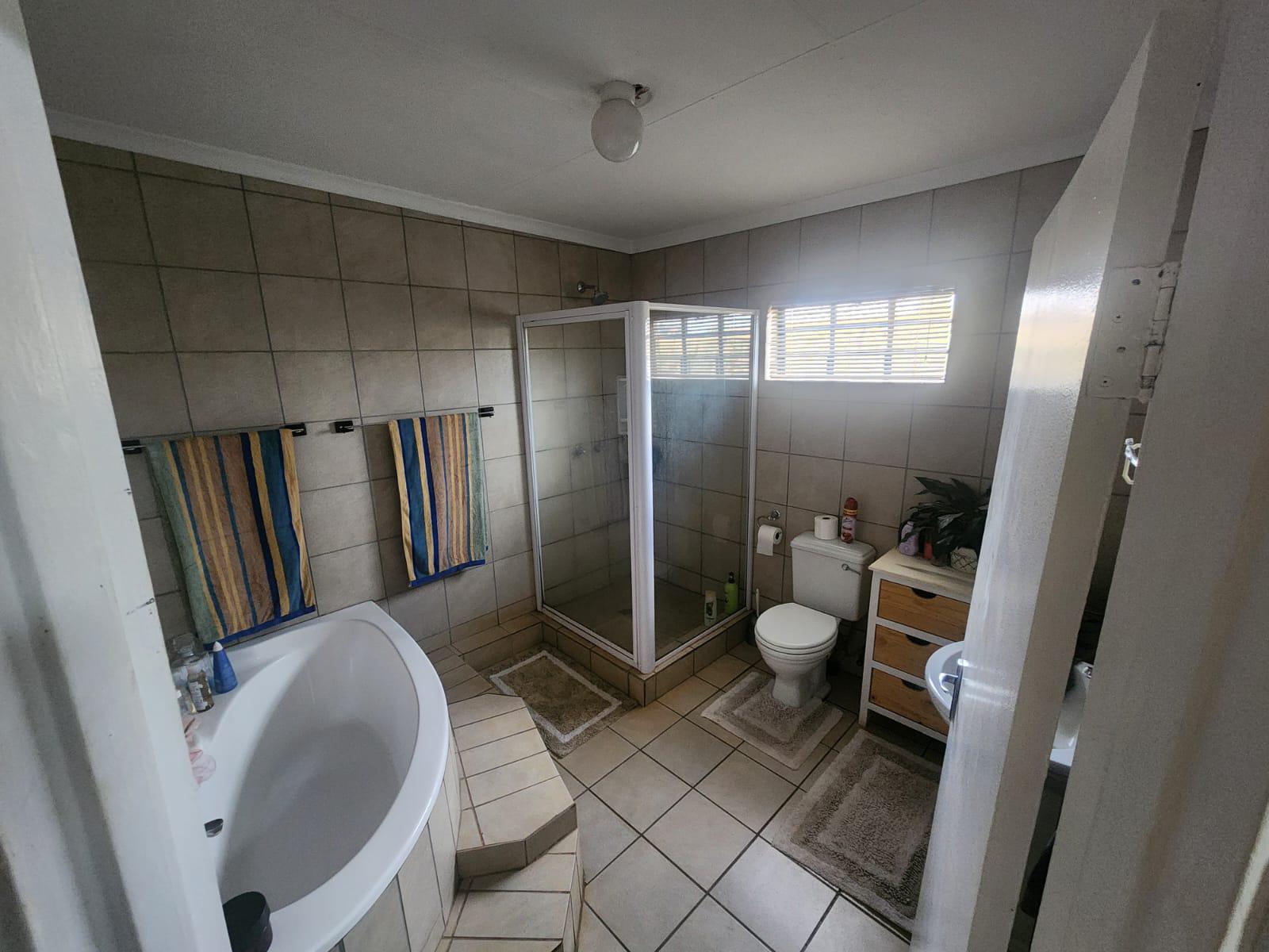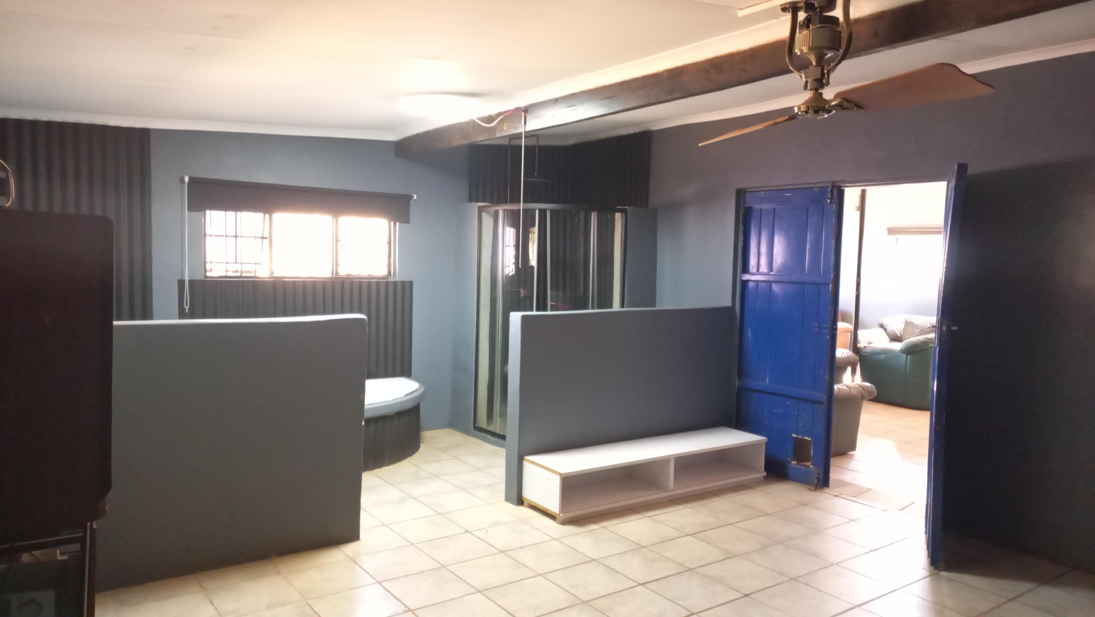 A large open-plan lounge, dining room, and kitchen. One huge bedroom with full en-suite bathroom equipped with a gas geyser.