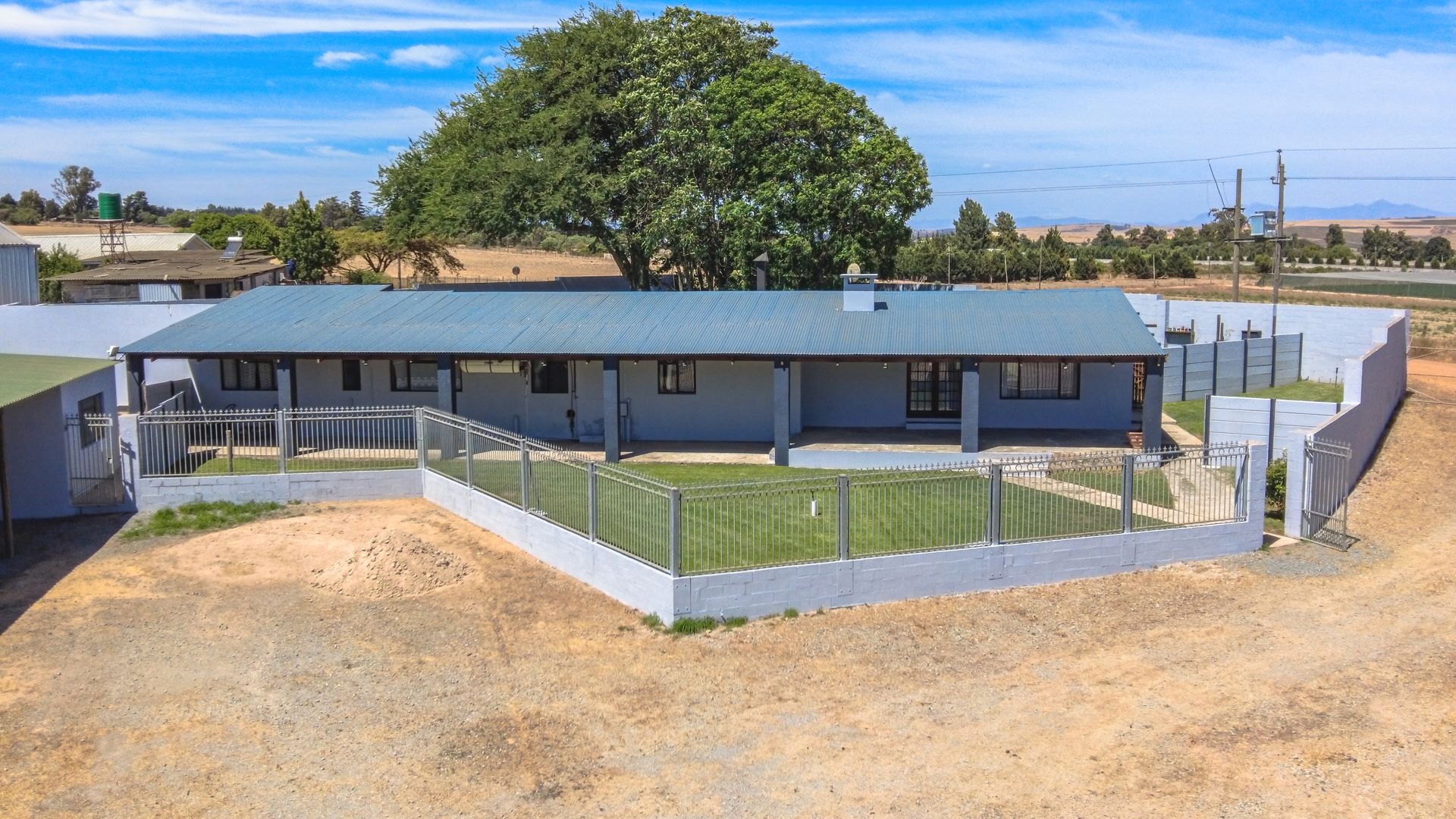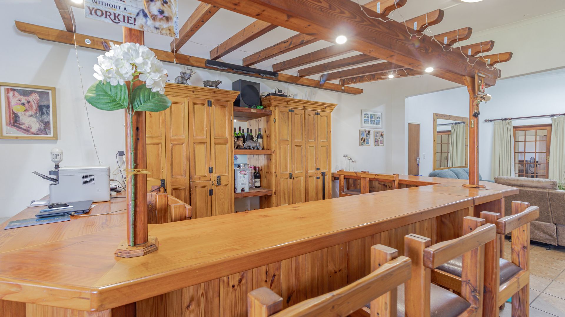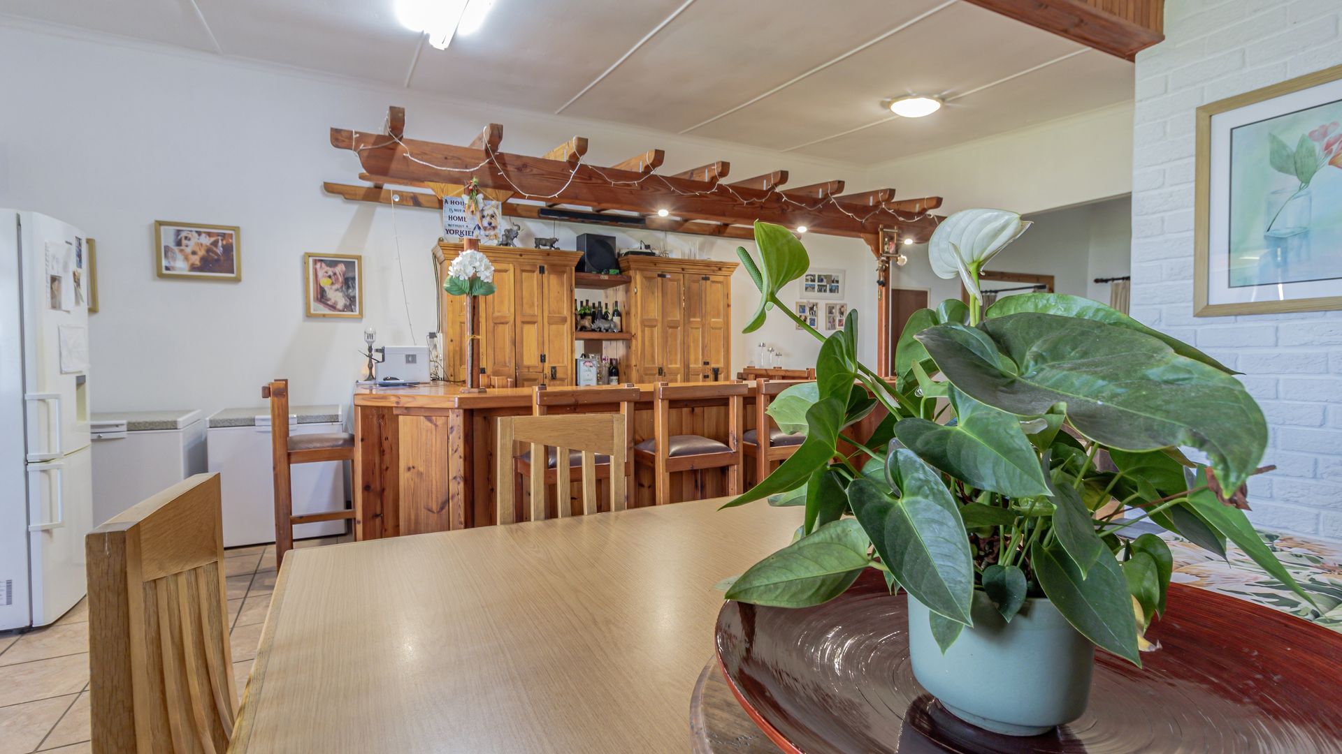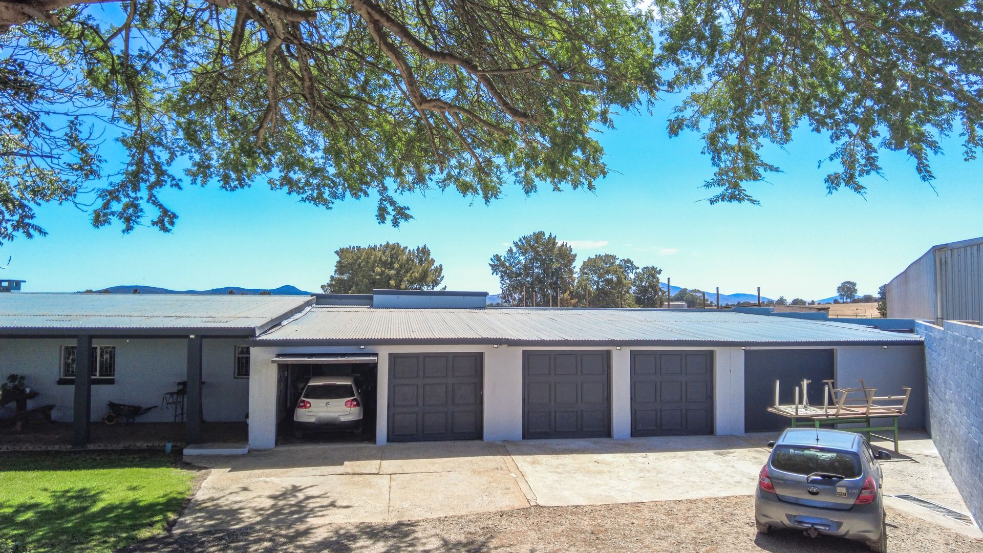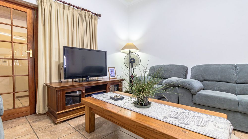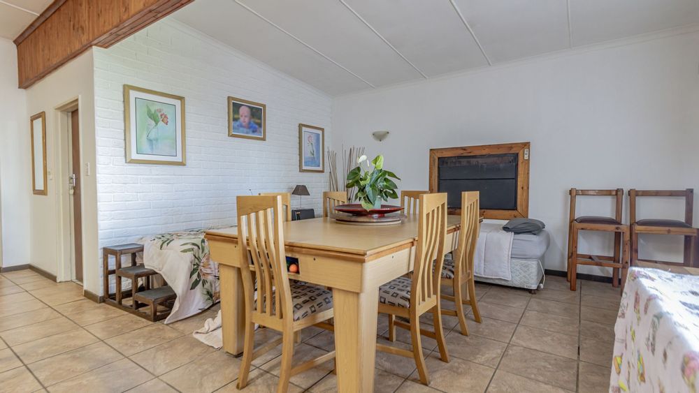 The main house is spacious and well designed, featuring three bedrooms with the potential to add a fourth. Two bedrooms include en-suite bathrooms, complemented by an additional third bathroom. The home offers a comfortable kitchen, dining room, and lounge, as well as a small office for work-from-home convenience. A standout feature is the large entertainment area, complete with a built-in bar and two built-in braais, perfect for hosting. Practical extras include five garages and storage rooms adjacent to the house.