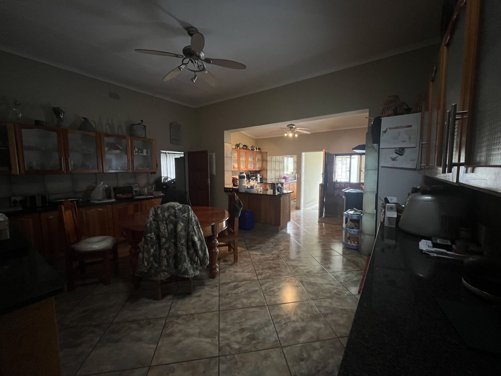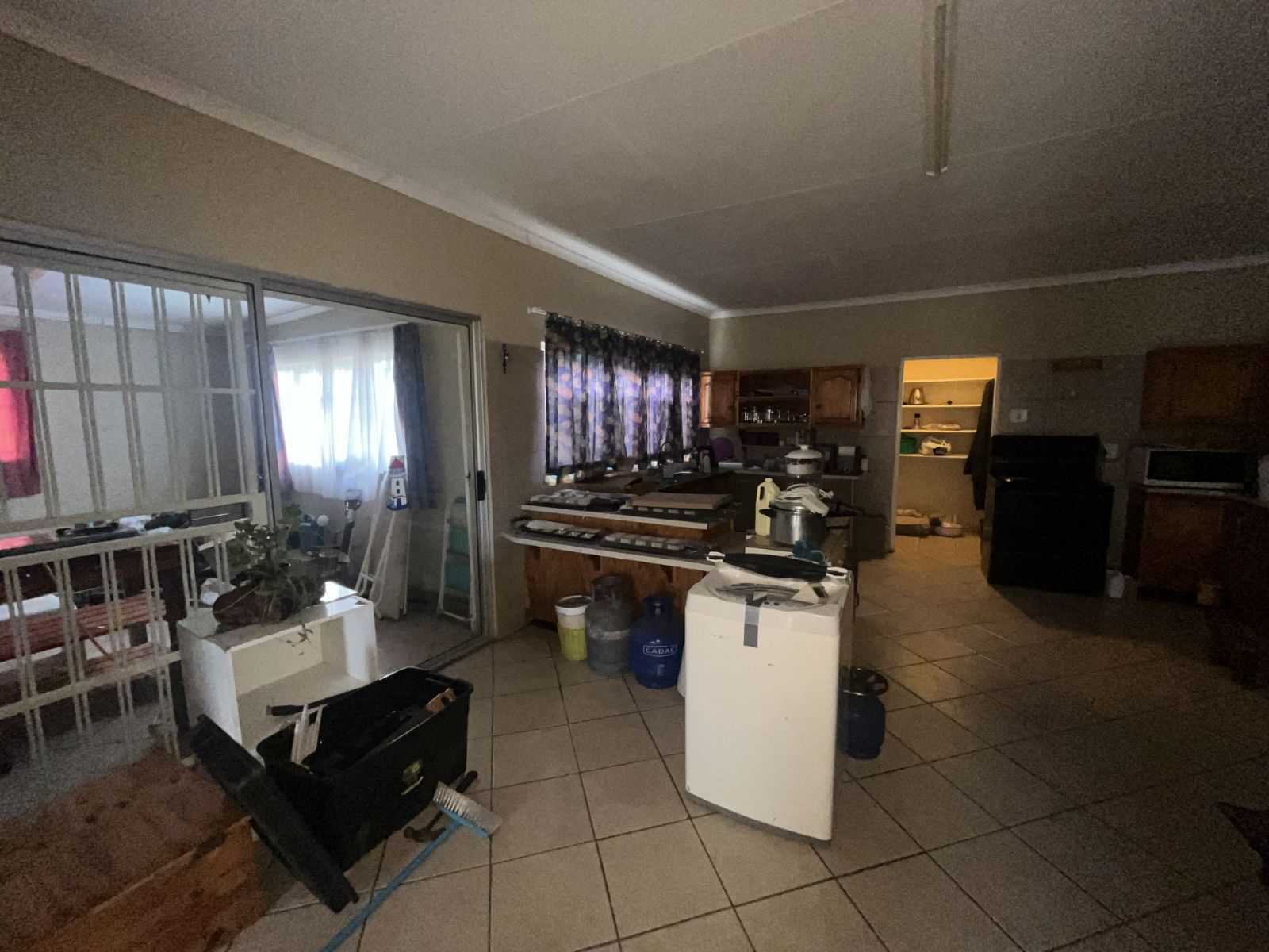 Open-plan kitchen and dining area with a laundry space and scullery
