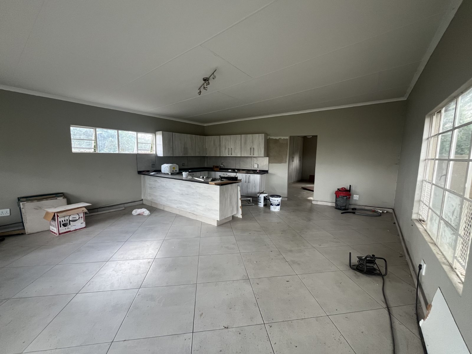 Open-plan kitchen, dining, and TV room