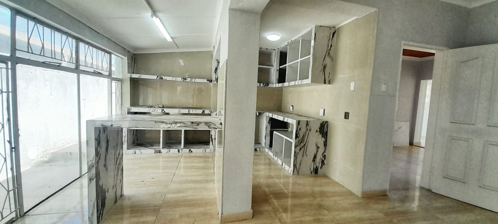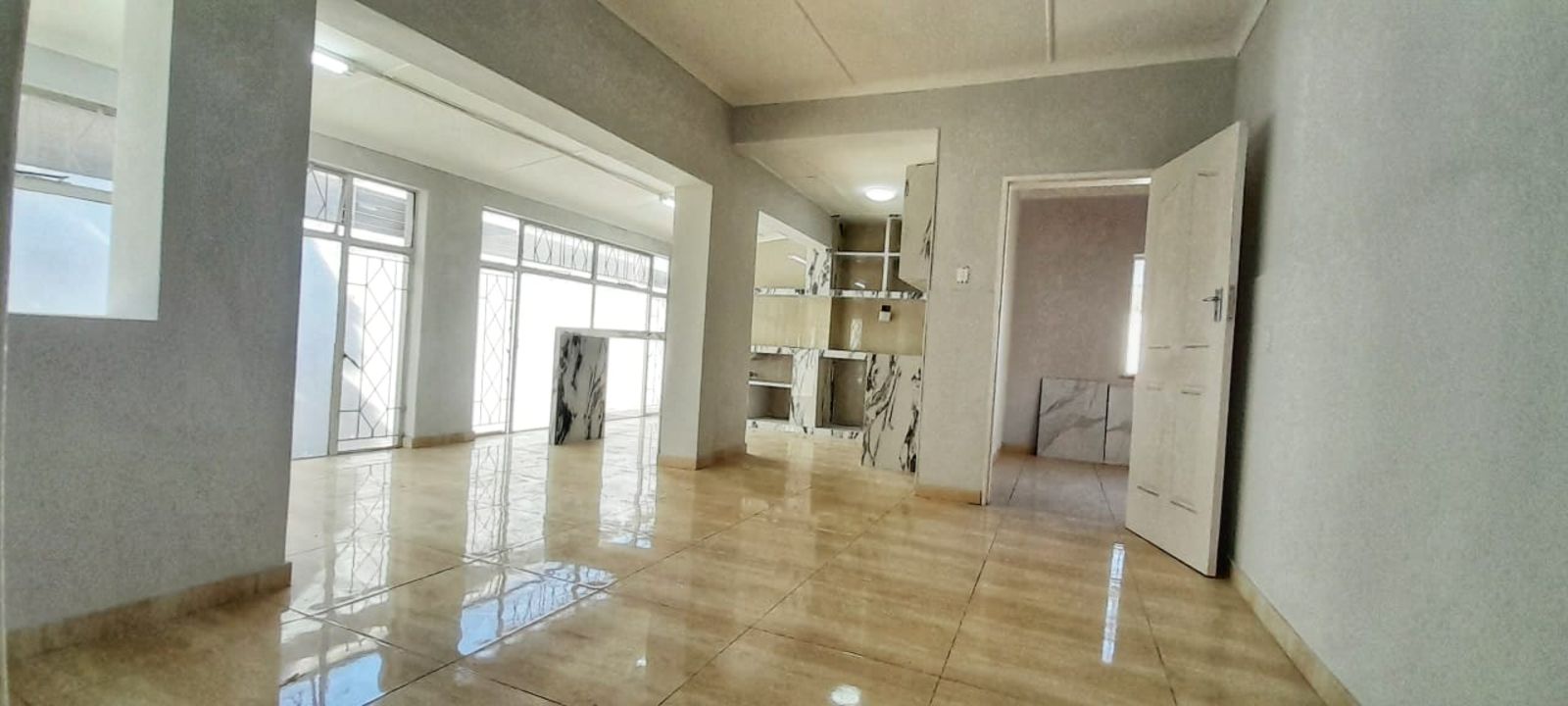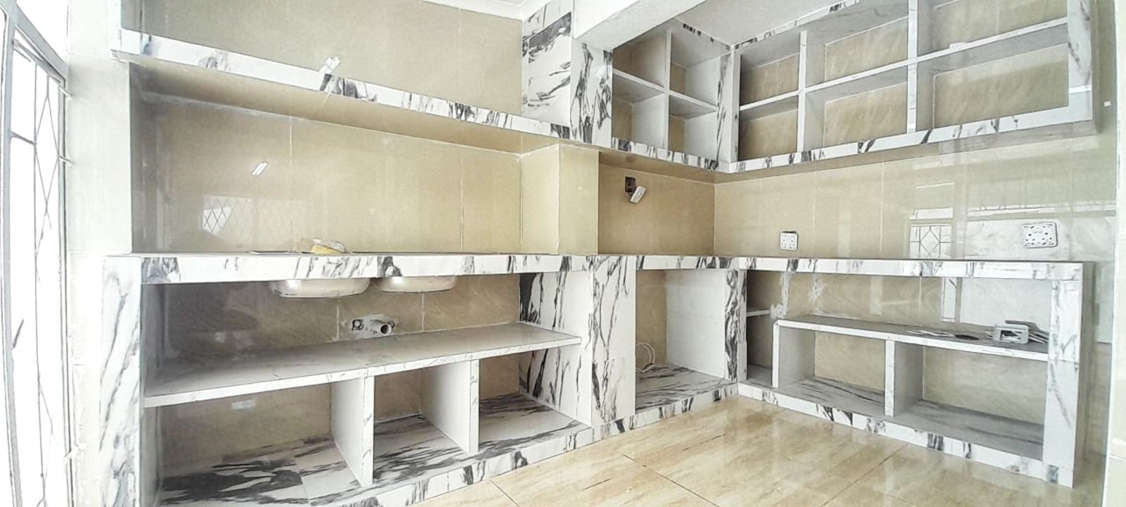 The home boasts a stylish kitchen with sleek stone countertops, four versatile living areas, and a cozy fireplace—perfect for family gatherings or entertaining guests. Ceramic tiles are laid throughout the entire house, offering a clean, contemporary look.