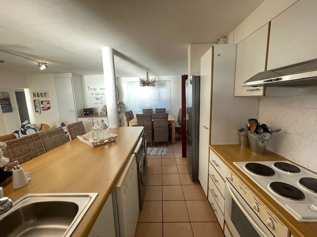 The open-plan layout features a well-equipped kitchen with ample cupboard space, leading into a comfortable dining area and a tastefully furnished lounge that flows out to a private balcony with views of the beautifully landscaped garden and lush palm trees. The main bedroom includes an en-suite bathroom with a shower, while the two additional bedrooms are generously sized, serviced by a neat second bathroom.