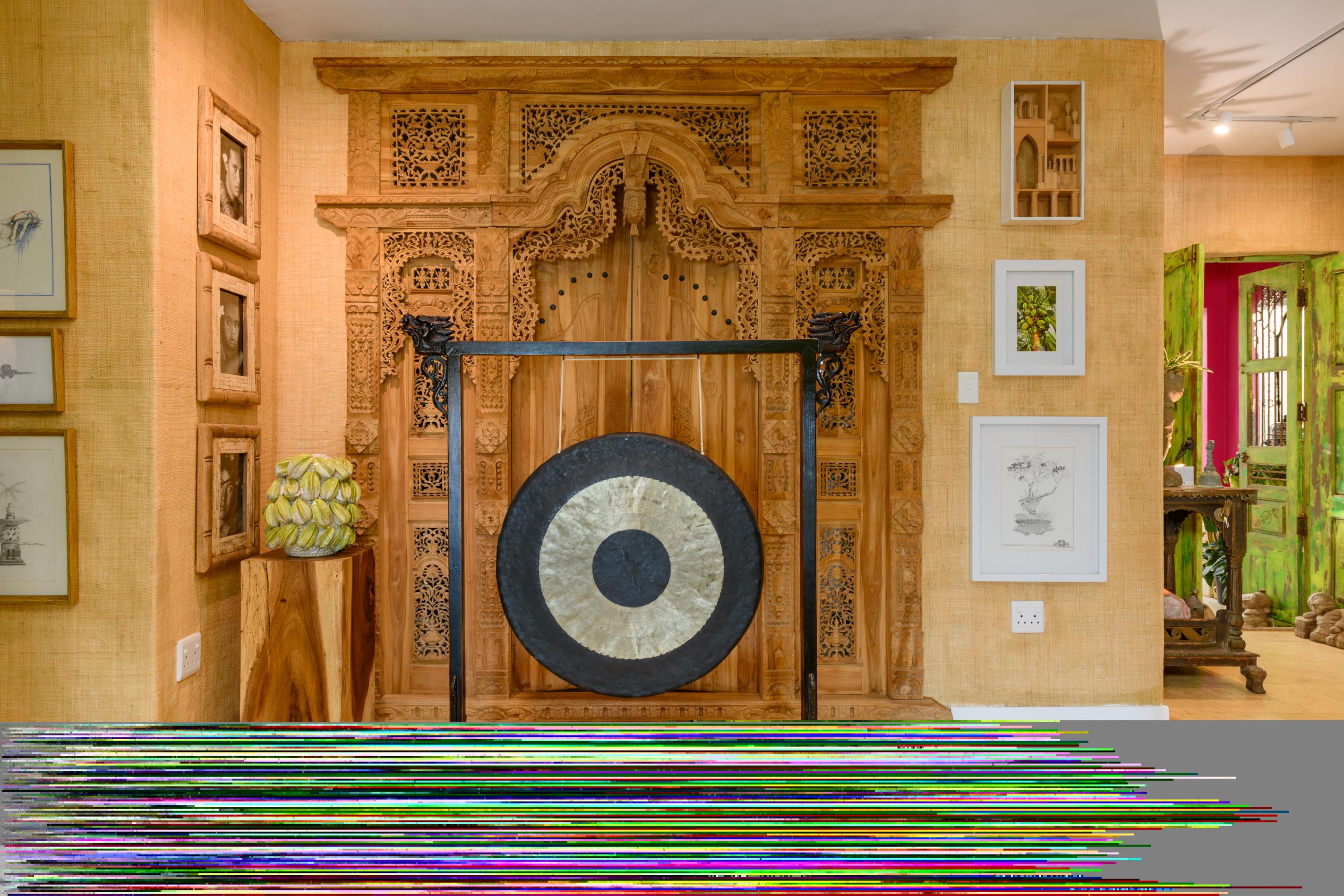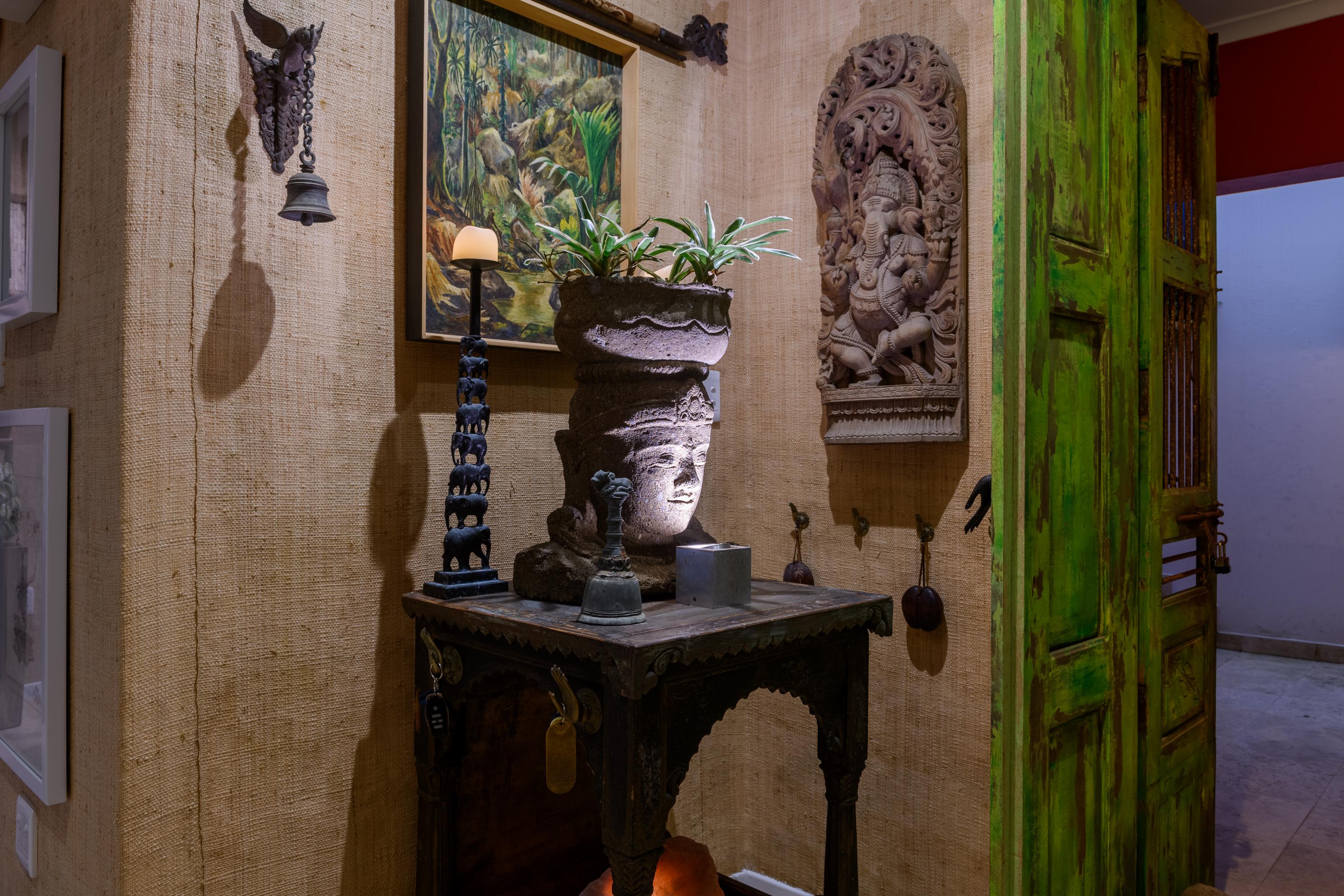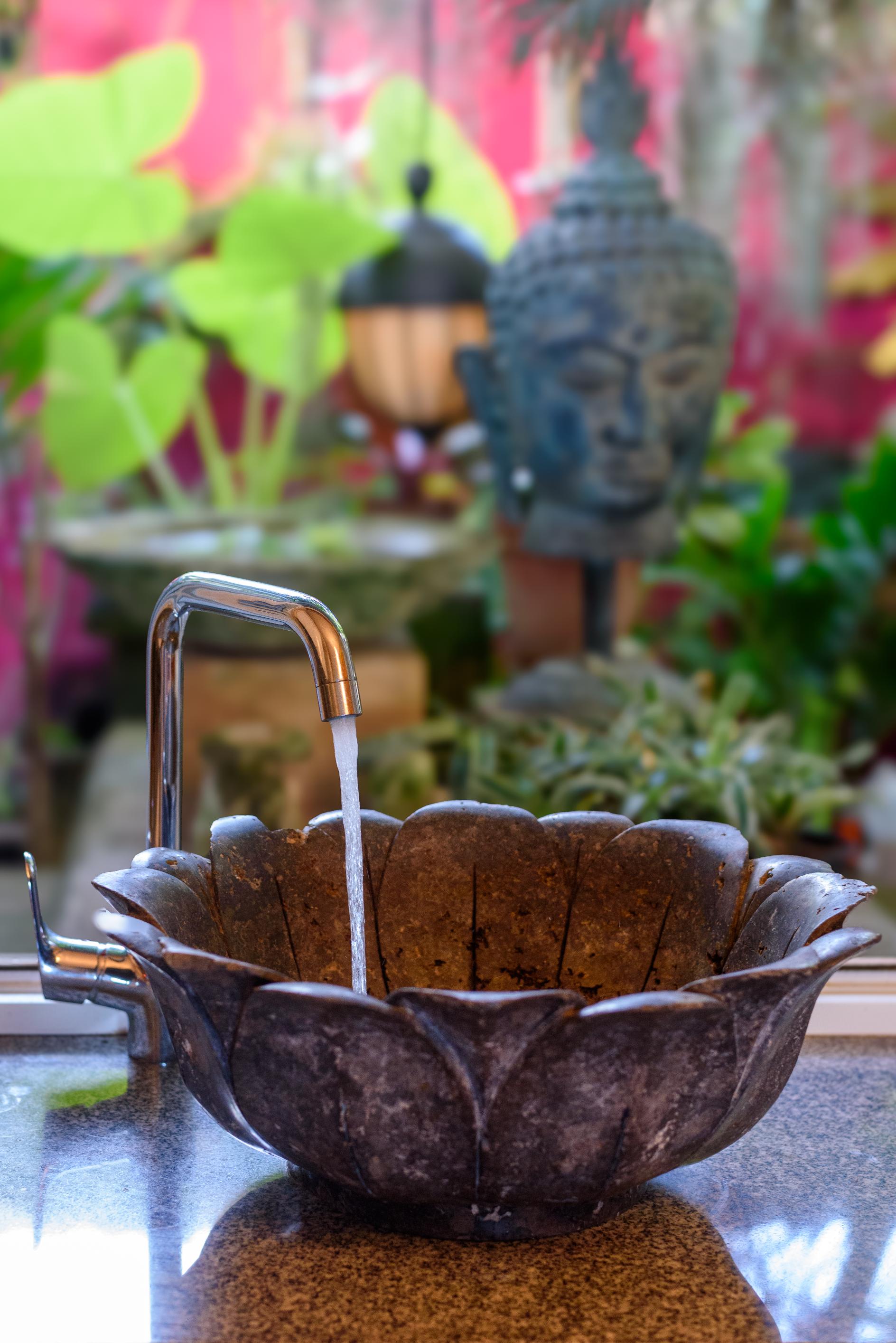 - A guest toilet featuring an antique Indian vanity and a carved lotus marble basin.