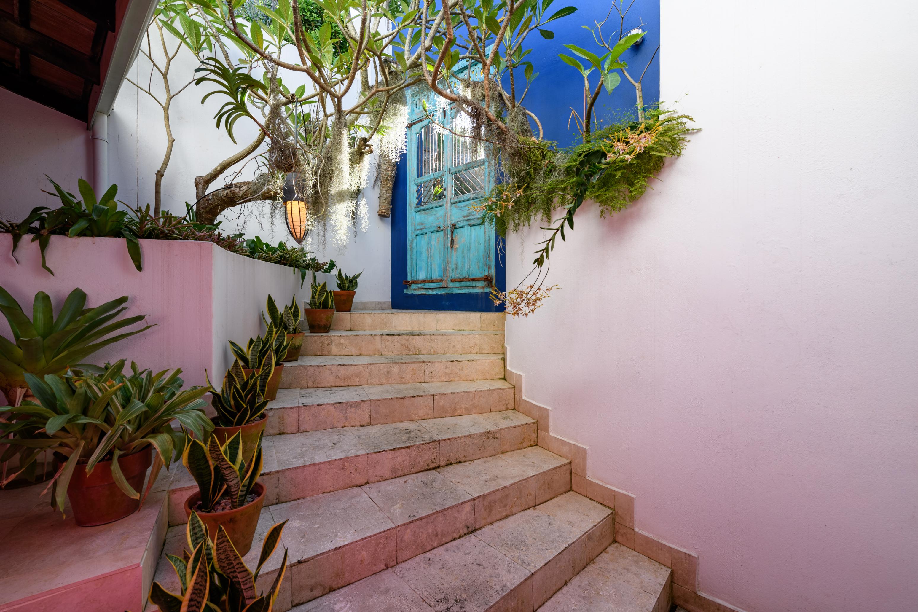 Enter the villa through a private, stair-lined Mexican-style courtyard featuring a serene frangipani-carved wall fountain, leading to a grand chartreuse hand-carved Indian door from Rajasthan. The villa's floors are finished in beautiful aged beach-sand Turkish travertine. A brief stroll through the reception and breakfast rooms leads to a spectacular deck with a large rim-flow infinity pool, offering 180-degree views of the Indian Ocean. A short private path from the deck takes you directly to the sandy beach, washed by the warm Indian waters.