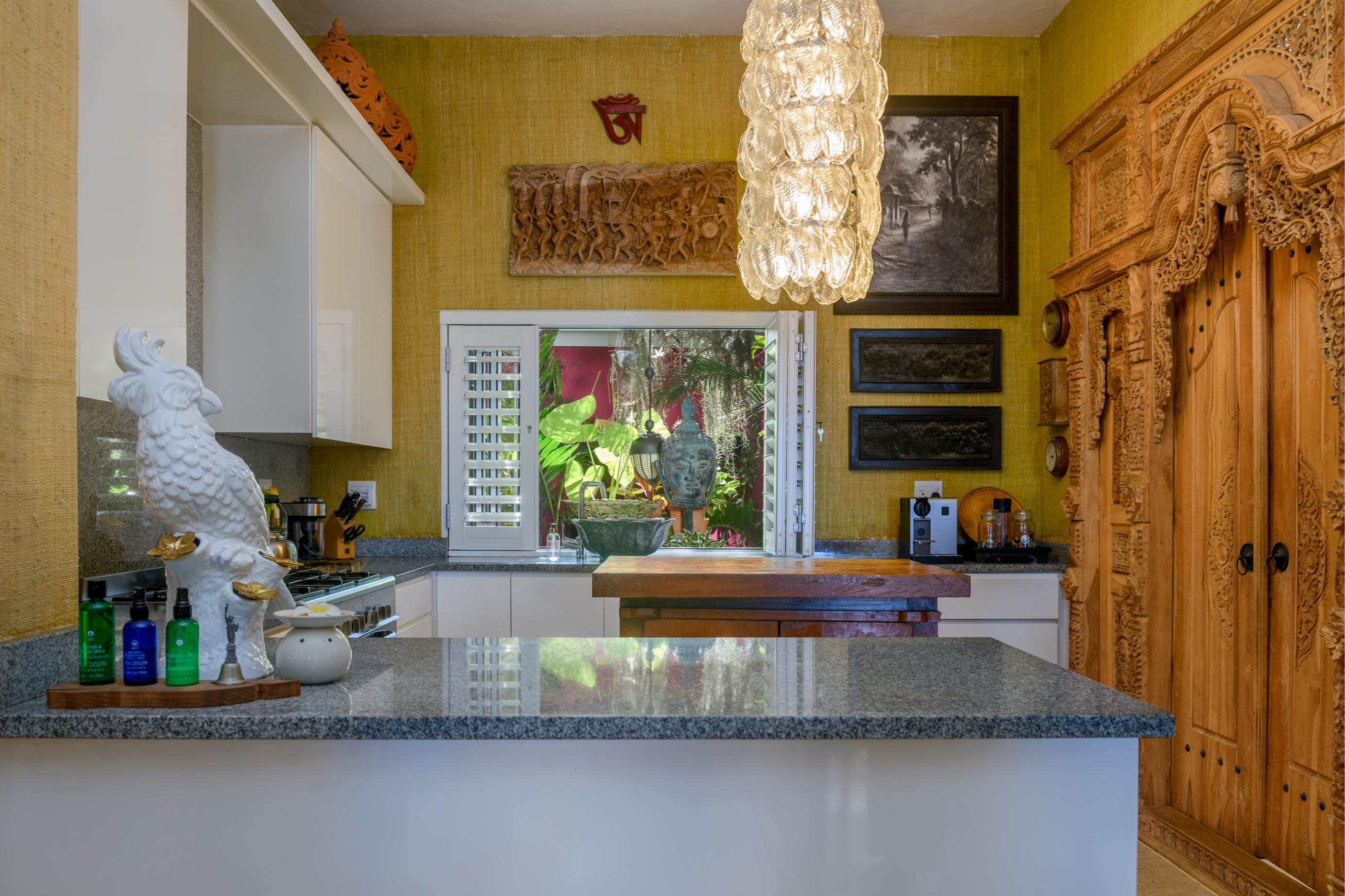 - A fully equipped kitchen with a walk-in pantry and a crystal leaf chandelier, offering a picturesque view of a tropical courtyard garden.