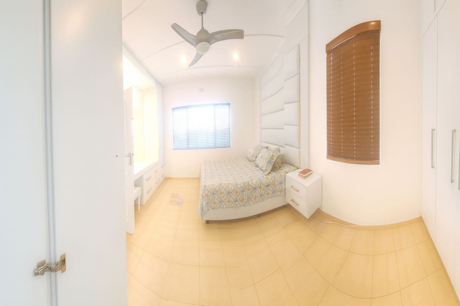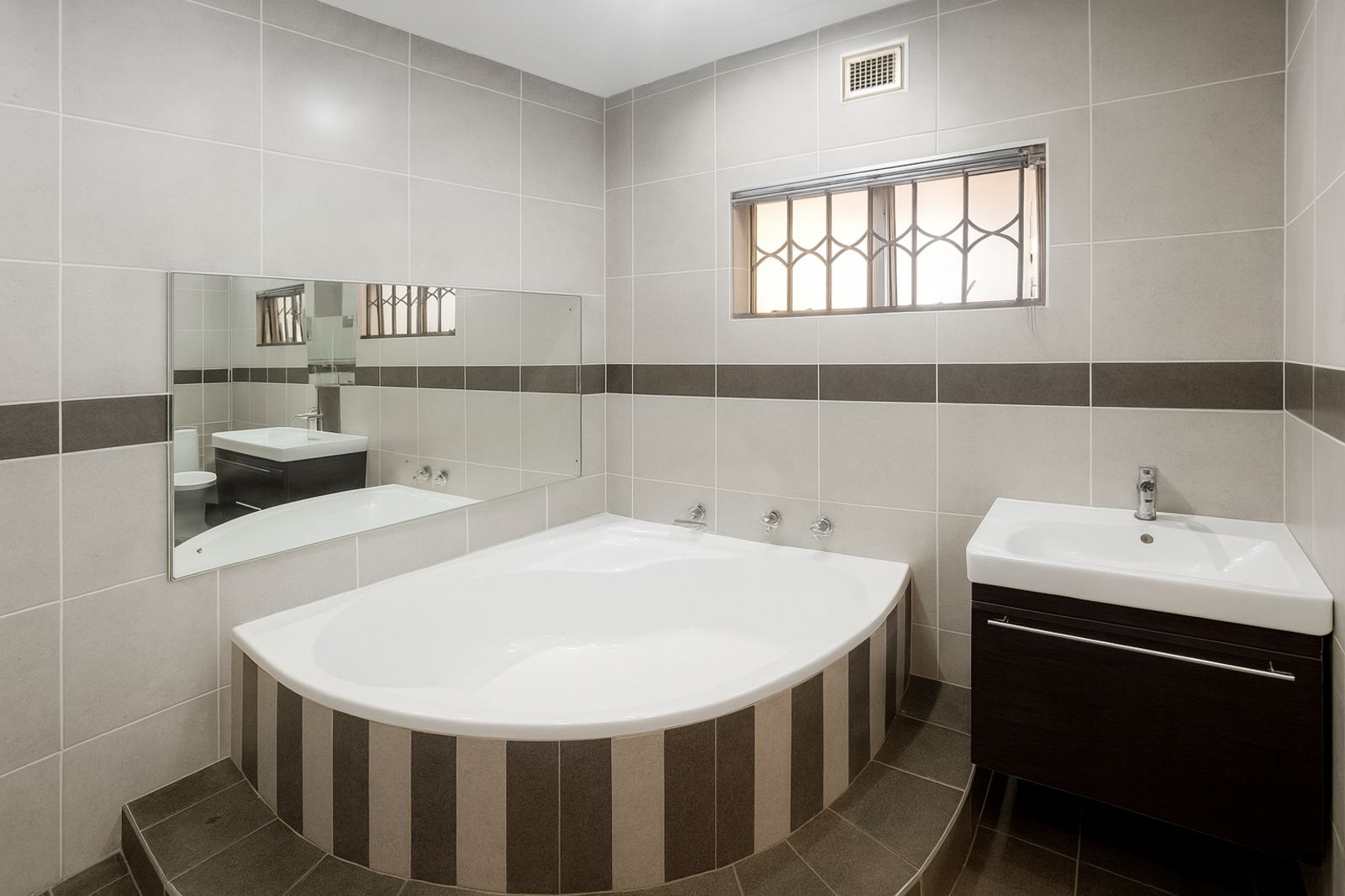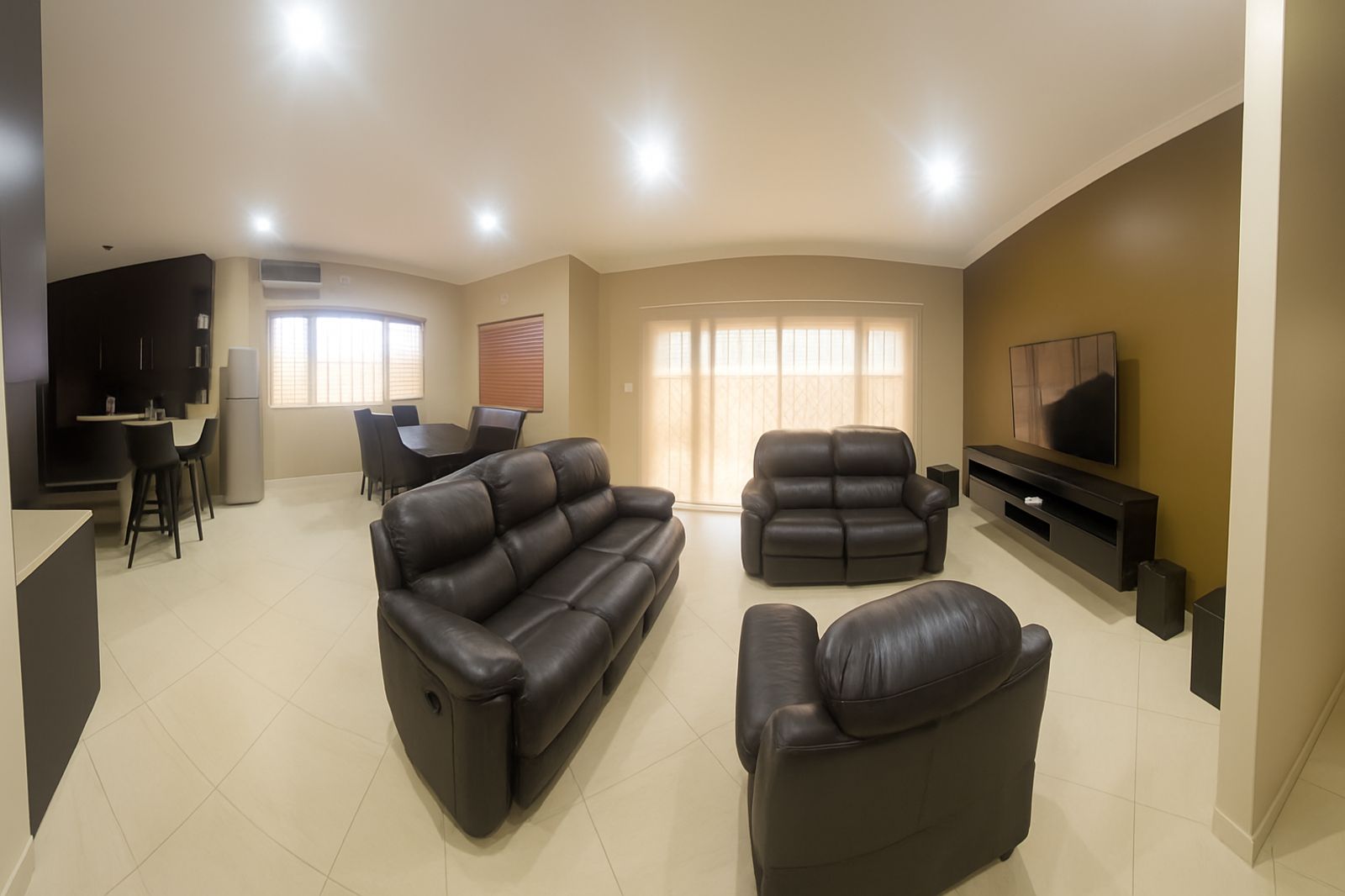 The accommodation comprises three spacious bedrooms and two modern bathrooms designed for relaxation. The master bedroom is a true retreat featuring a custom floor-to-ceiling upholstered headboard and a dedicated dressing area with a large vanity and mirror. The bathrooms have been beautifully renovated to include premium fixtures such as a deep corner bathtub, a separate glass shower, and stylish floating vanities. Every detail in these private quarters has been finished to a high standard to ensure a luxurious living experience.