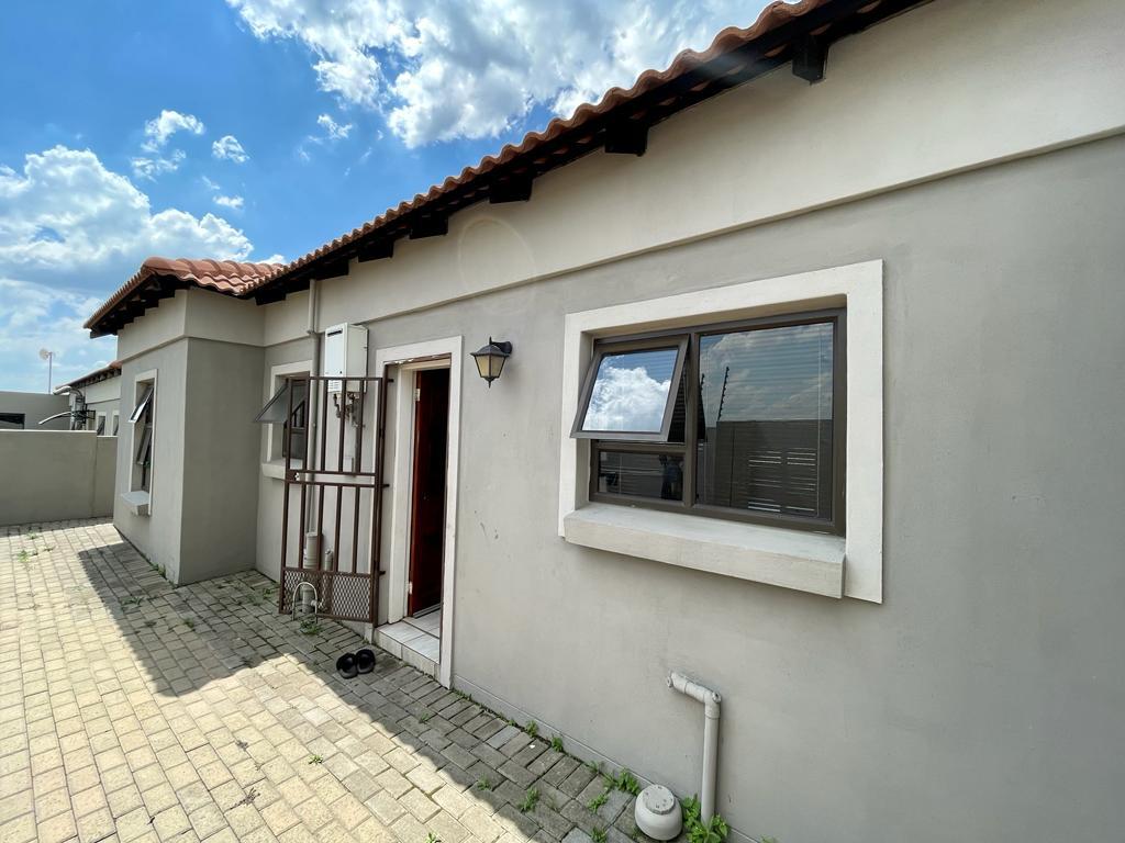 The townhouse encompasses three bedrooms, each adorned with modern melamine built-in cupboards, combining form and function effortlessly. The two bathrooms within the residence include a main ensuite bathroom, reflecting a commitment to contemporary living. The bathrooms are equipped with a gas geyser, ensuring a continuous supply of warm water to both the kitchen and bathing spaces.