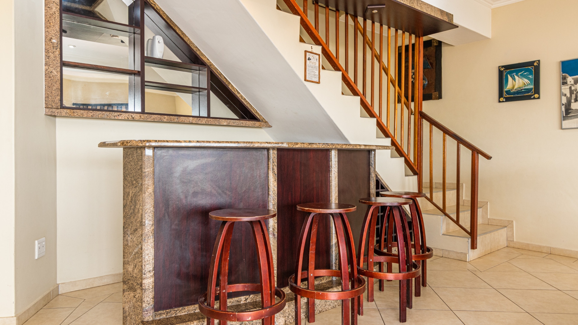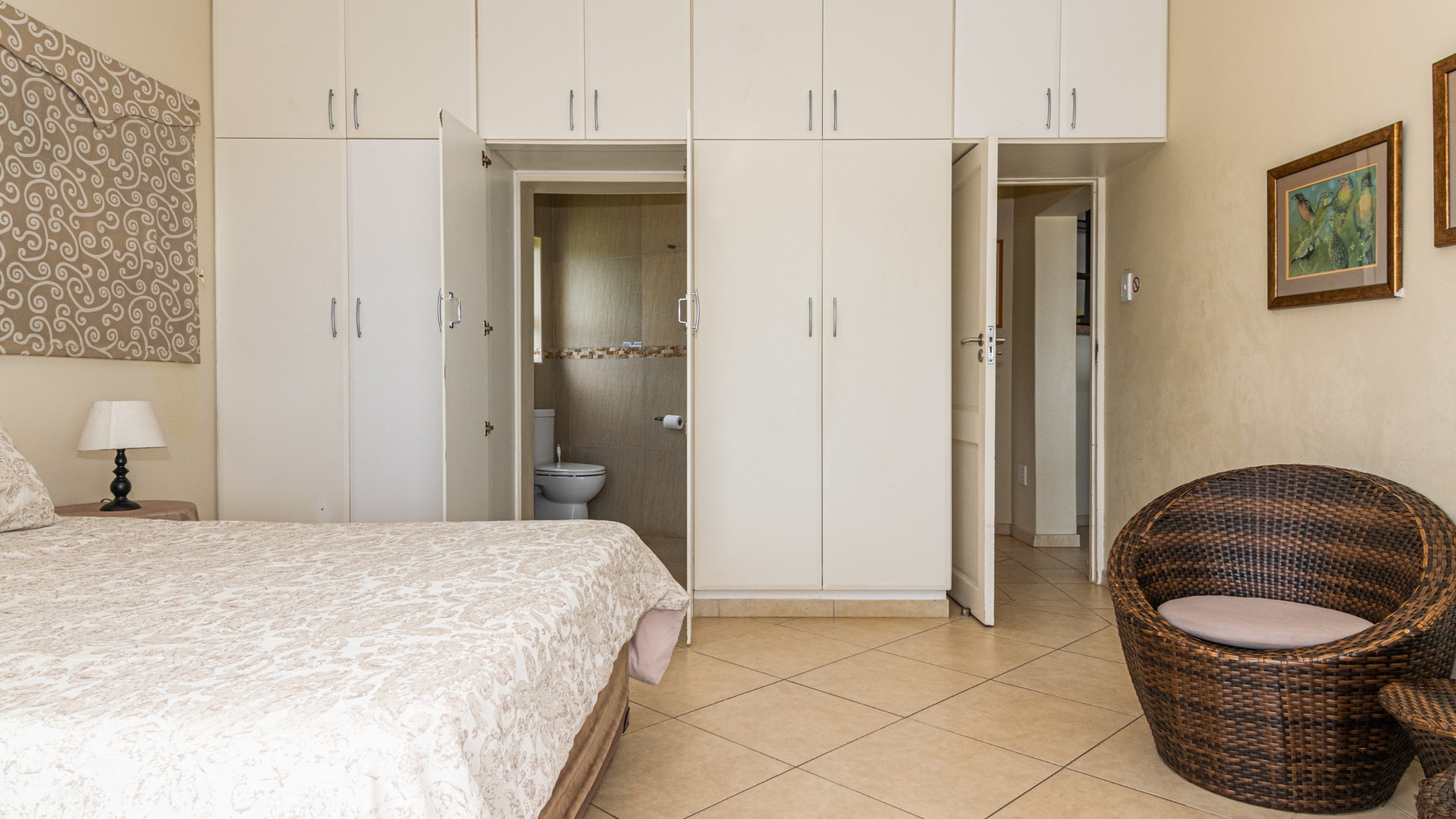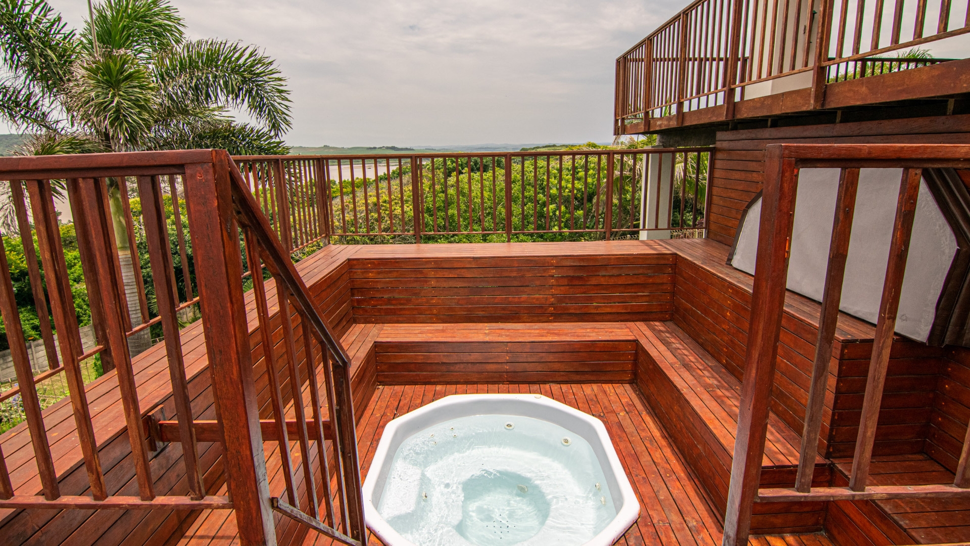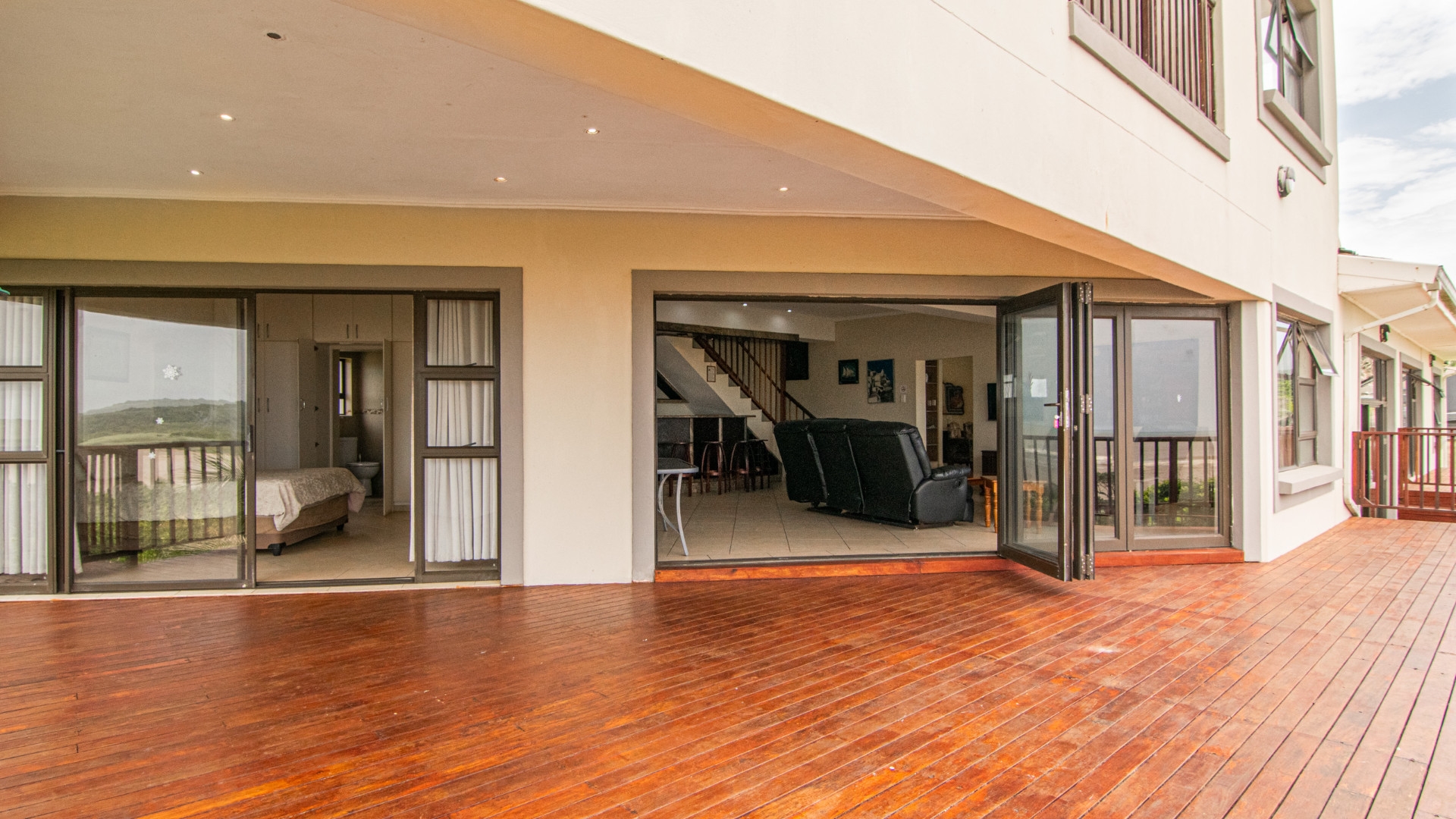 The main house has a big open plan kitchen fitted with black Granite tops and the dining room is perfect for family events. There is a large separate scullery and laundry area. Below the dining there is a separate game room with a pool table. The Lounge has a neat little bar position under the stairs and a guest toilet. The stacking doors allow for an amazing view and which open fully and lead onto a lovely multi-level wooden deck with swimming pool and jacuzzi. In this upstairs area there are 3 ensuite bedrooms of which two are sea facing. The Master bedroom has a big walk in wardrobe, a beautiful full bathroom, a private balcony overlooking the river and sea. Downstairs boasts 1 ensuite bedroom of generous proportion as well as a guest toilet.
