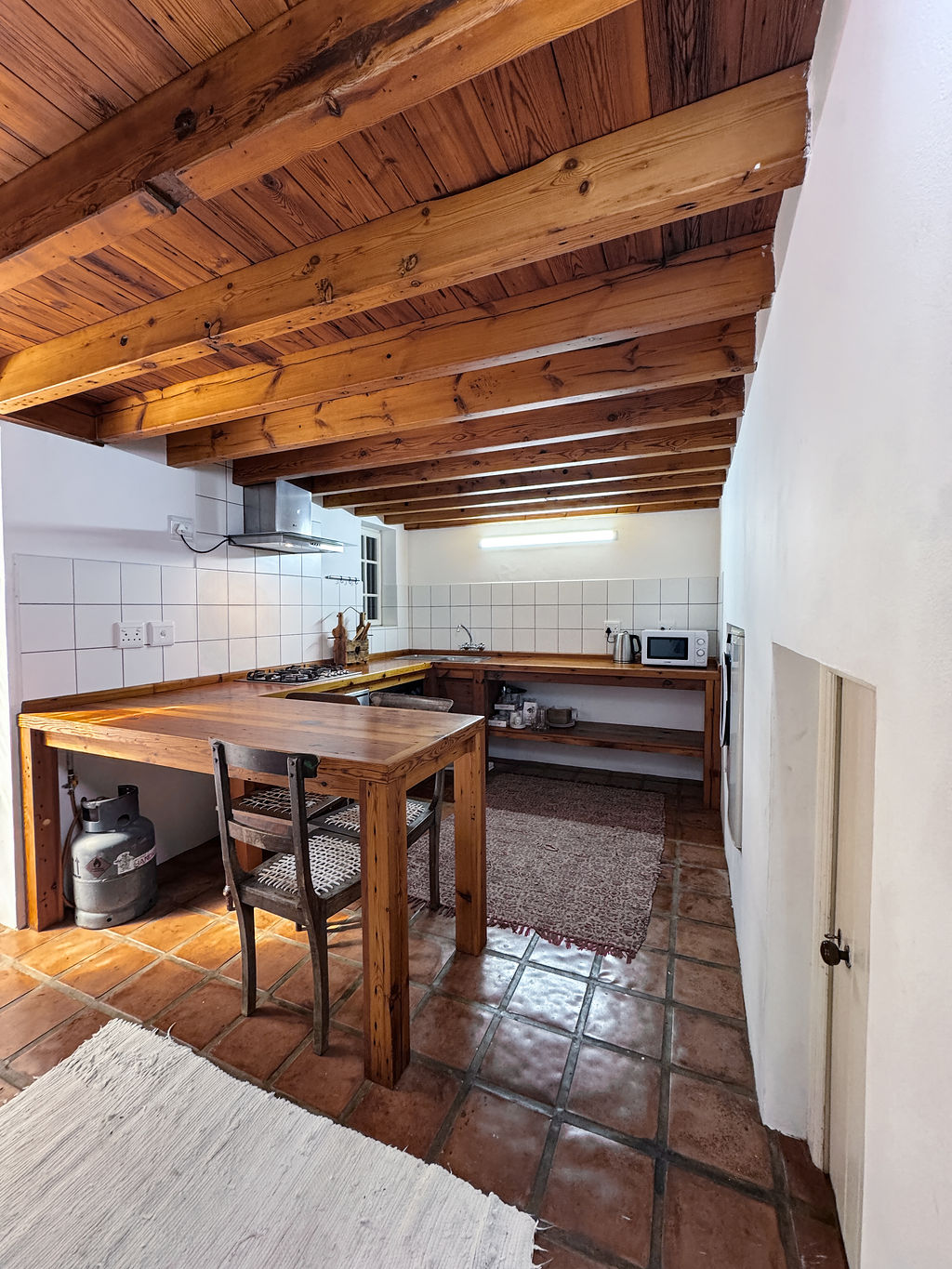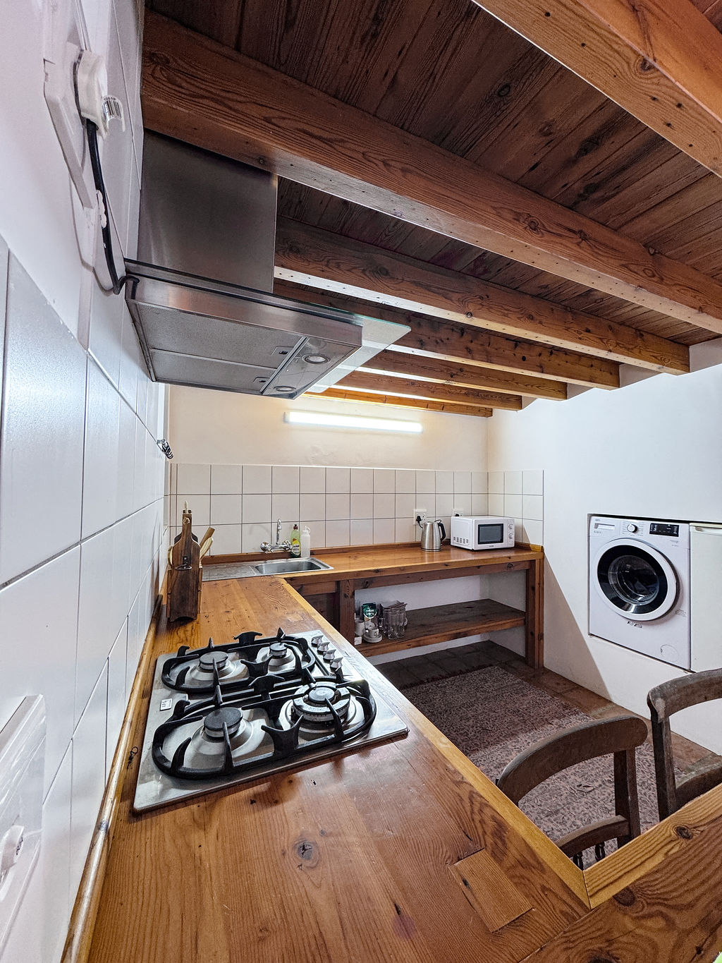 The kitchen is practical and well-appointed, offering ample cupboard space, a stove, gas hob, extractor fan, and pine countertops, seamlessly integrated into the living area for easy entertaining.
