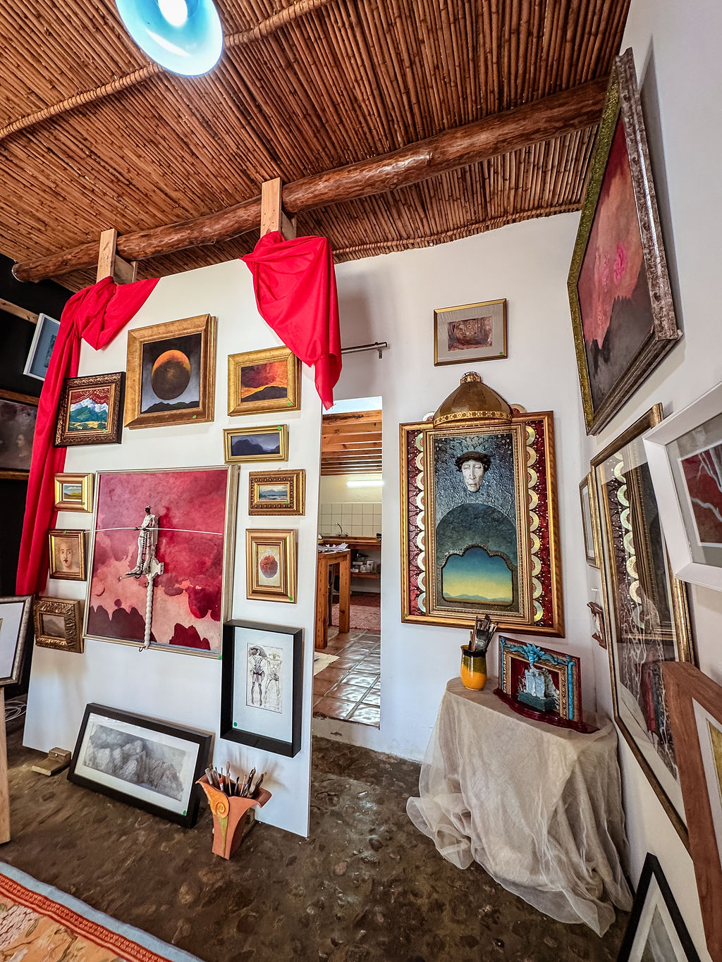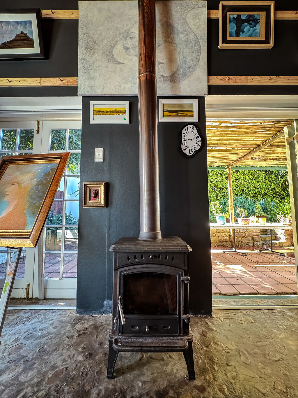The open-plan living area features authentic cobblestone flooring and enjoys abundant natural light with views over the garden, creating a warm European-style atmosphere. A combustion fireplace provides warmth and ambiance during winter months.