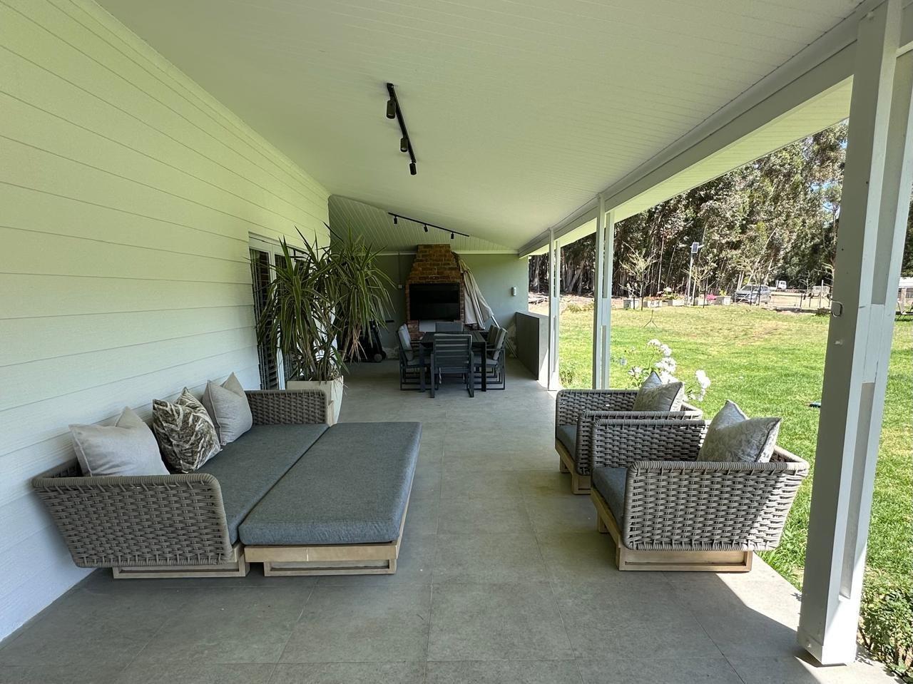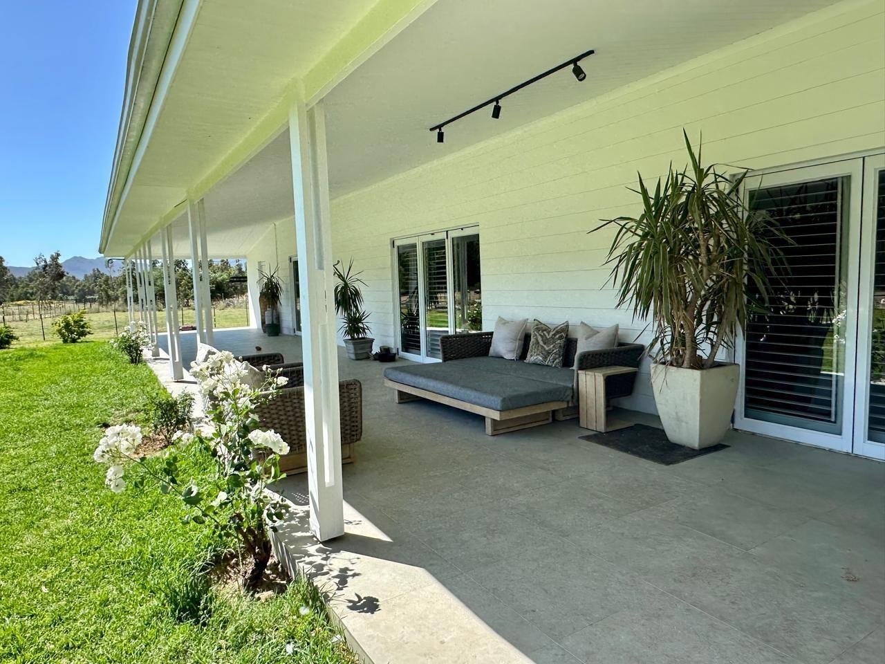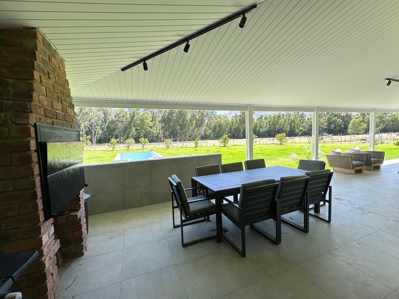 At the heart of the property lies a beautifully modernised farmhouse, where country living meets contemporary design. A vast, roofed veranda welcomes you in, flowing into a double-volume living area flooded with natural light. The kitchen is both stylish and practical, featuring Caesarstone worktops, excellent carpentry, and a separate scullery to keep things running smoothly behind the scenes.