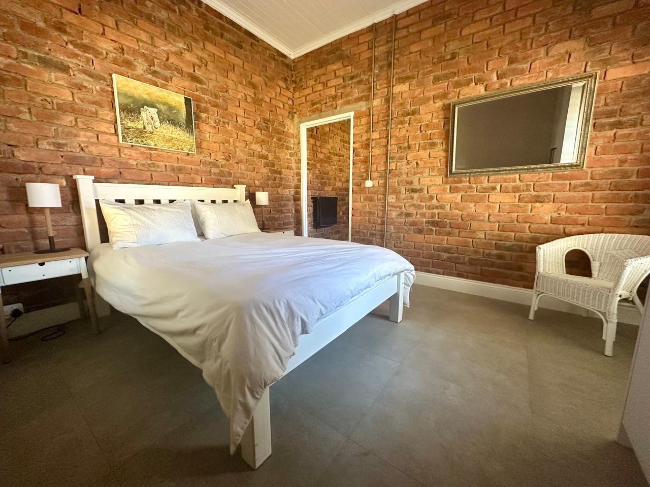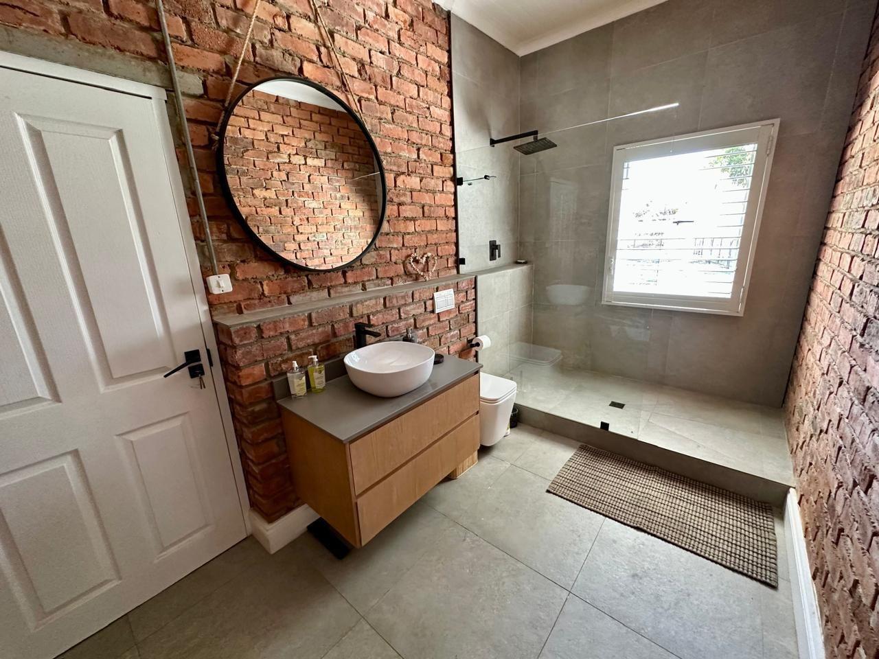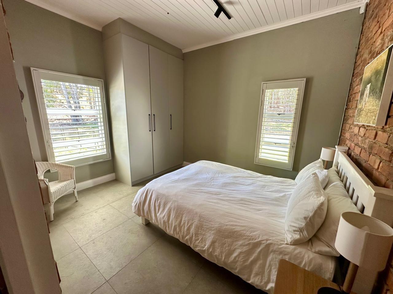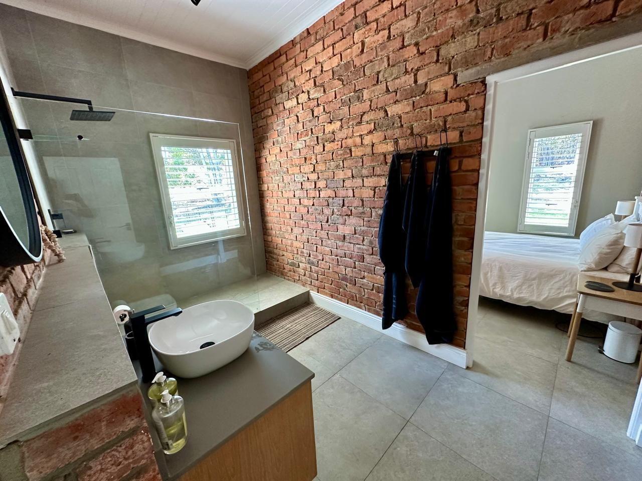 The home includes three generous bedrooms, all with built-in cupboards, and a main en-suite with air conditioning. Throughout the house, thoughtful design details shine—from exposed brickwork and tiled floors to anodised aluminium doors and windows, and American White Security Shutters that offer both peace of mind and classic charm.