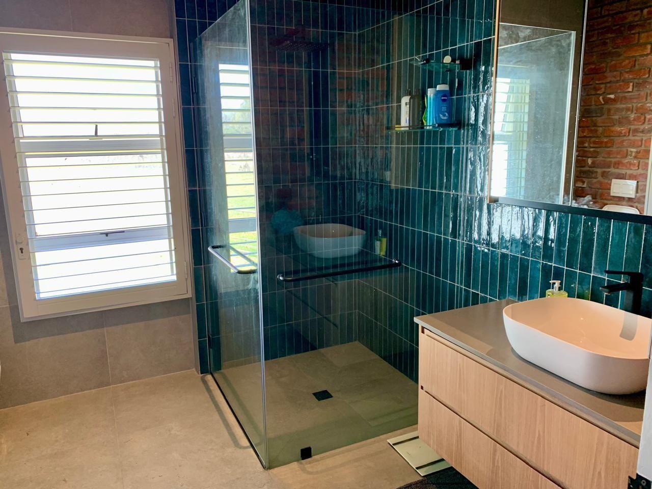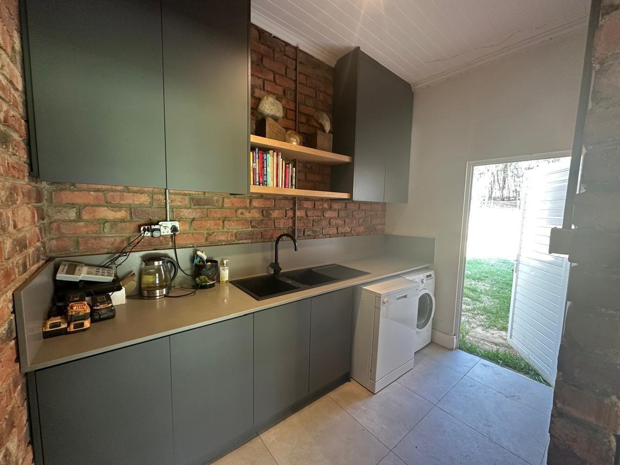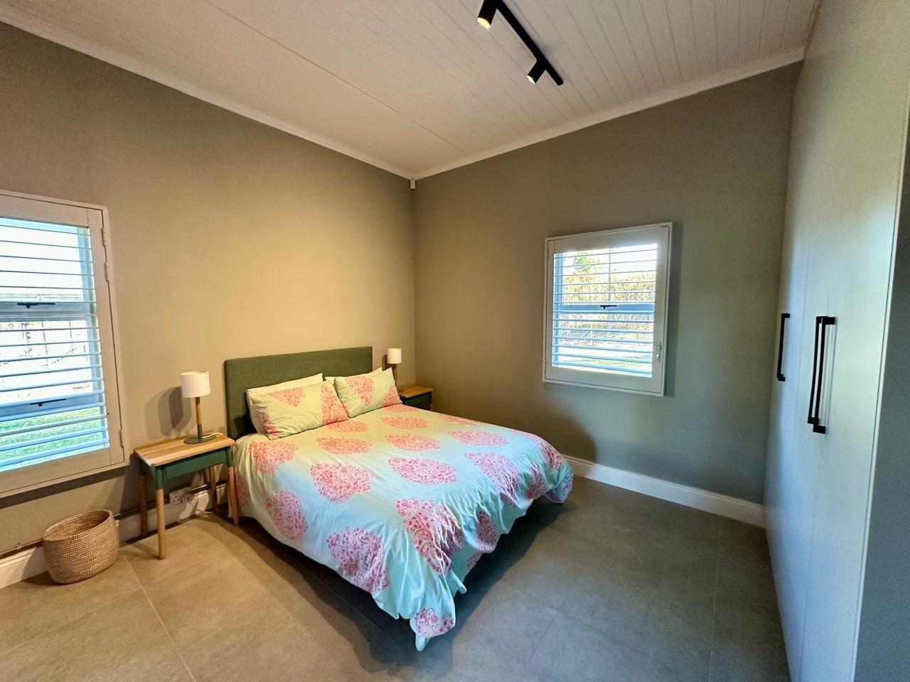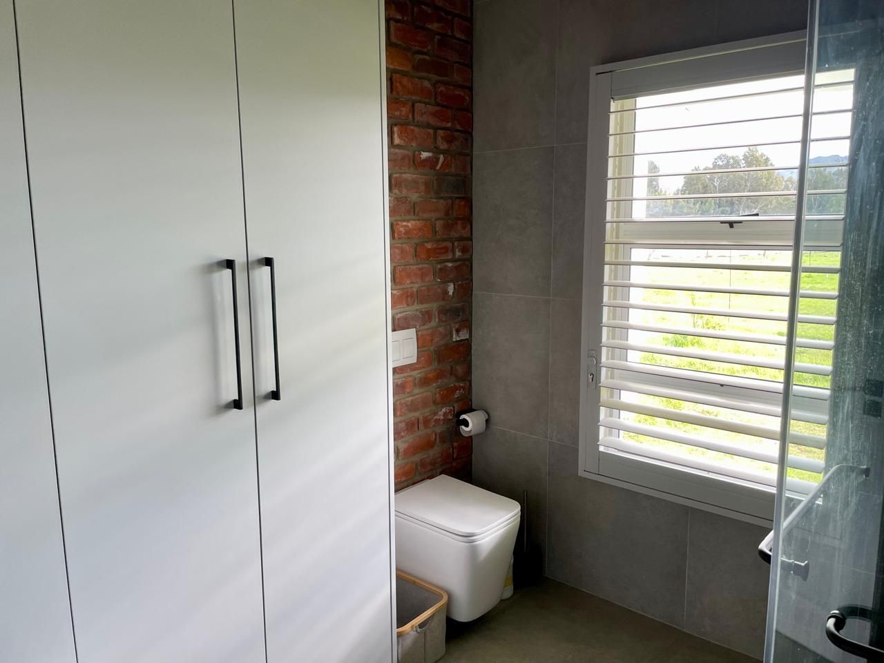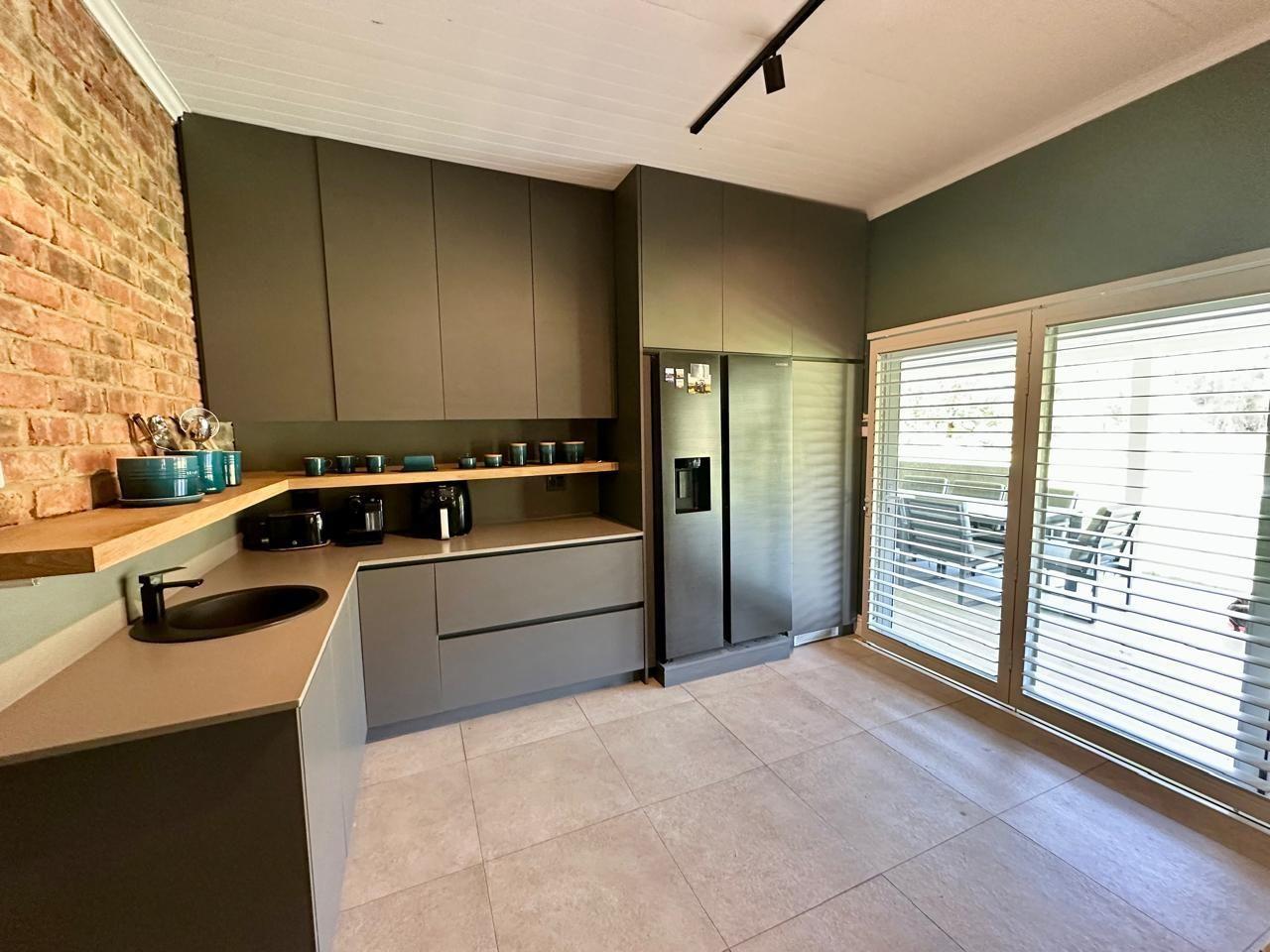 The home includes three generous bedrooms, all with built-in cupboards, and a main en-suite with air conditioning. Throughout the house, thoughtful design details shine—from exposed brickwork and tiled floors to anodised aluminium doors and windows, and American White Security Shutters that offer both peace of mind and classic charm.