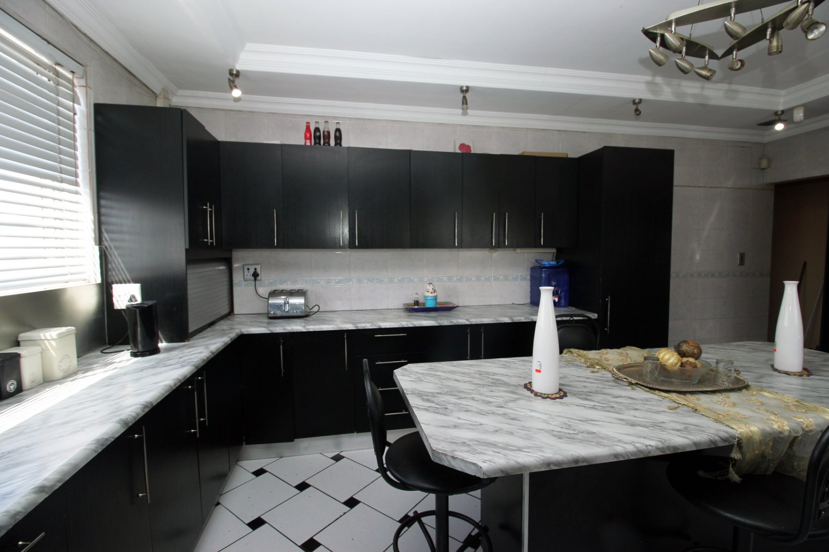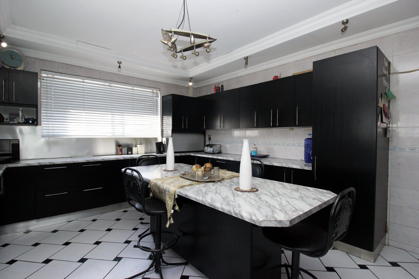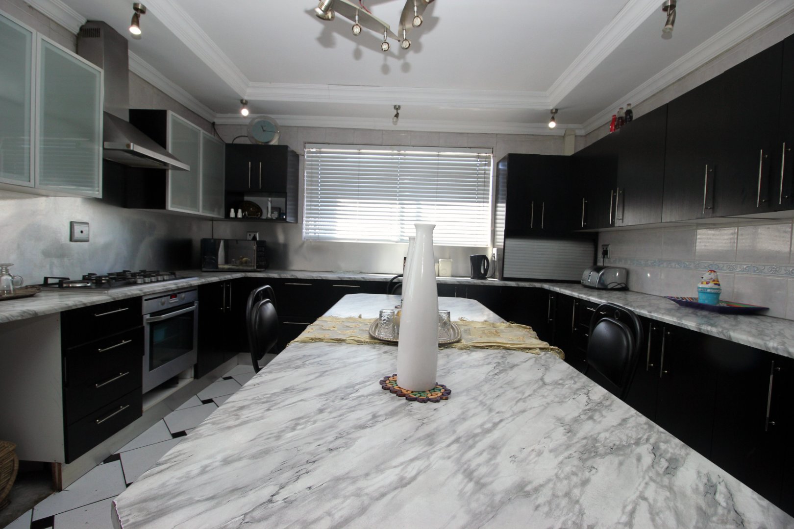 Upstairs has a fully fitted kitchen with built in cupboards place for fridge ,gas stove stove, microwave oven washing machine and centre island table all tastefully coloured in black white.