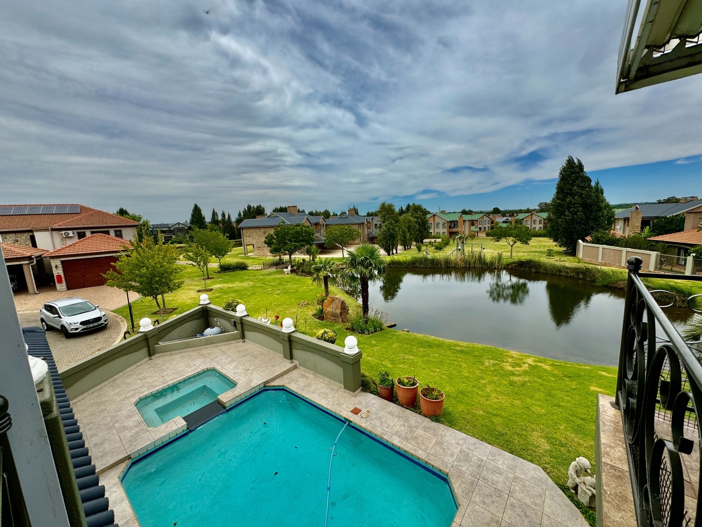 -Covered Patio overlooking the sparkling swimming pool and landscaped garden with scenic dam views.