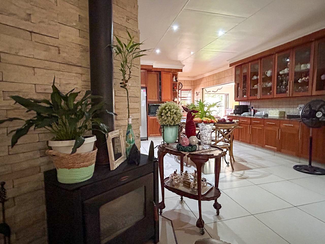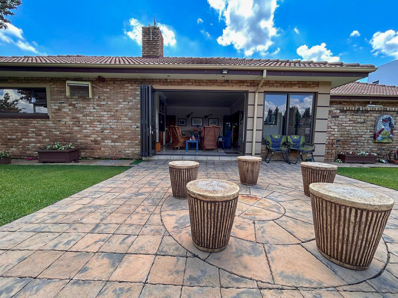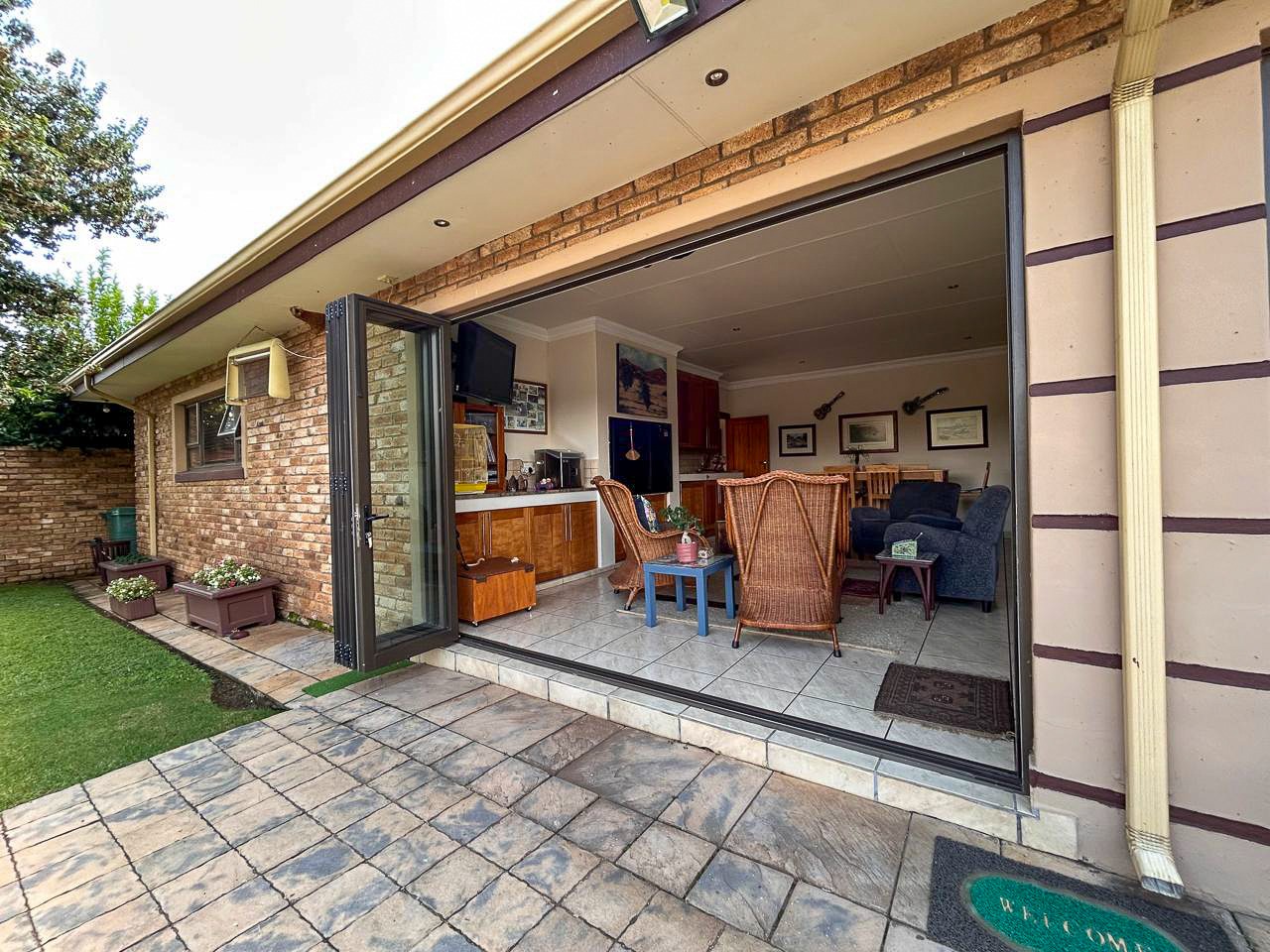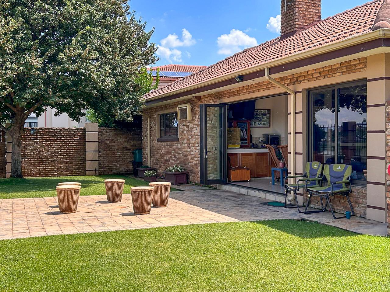 The heart of this home is the spacious and versatile braai room, a true entertainer’s paradise. Featuring a built-in braai and a luxurious jacuzzi, this space is ideal for celebrations or relaxing after a long day. Stacker doors open effortlessly onto the lush garden, creating a seamless transition between indoor and outdoor living.