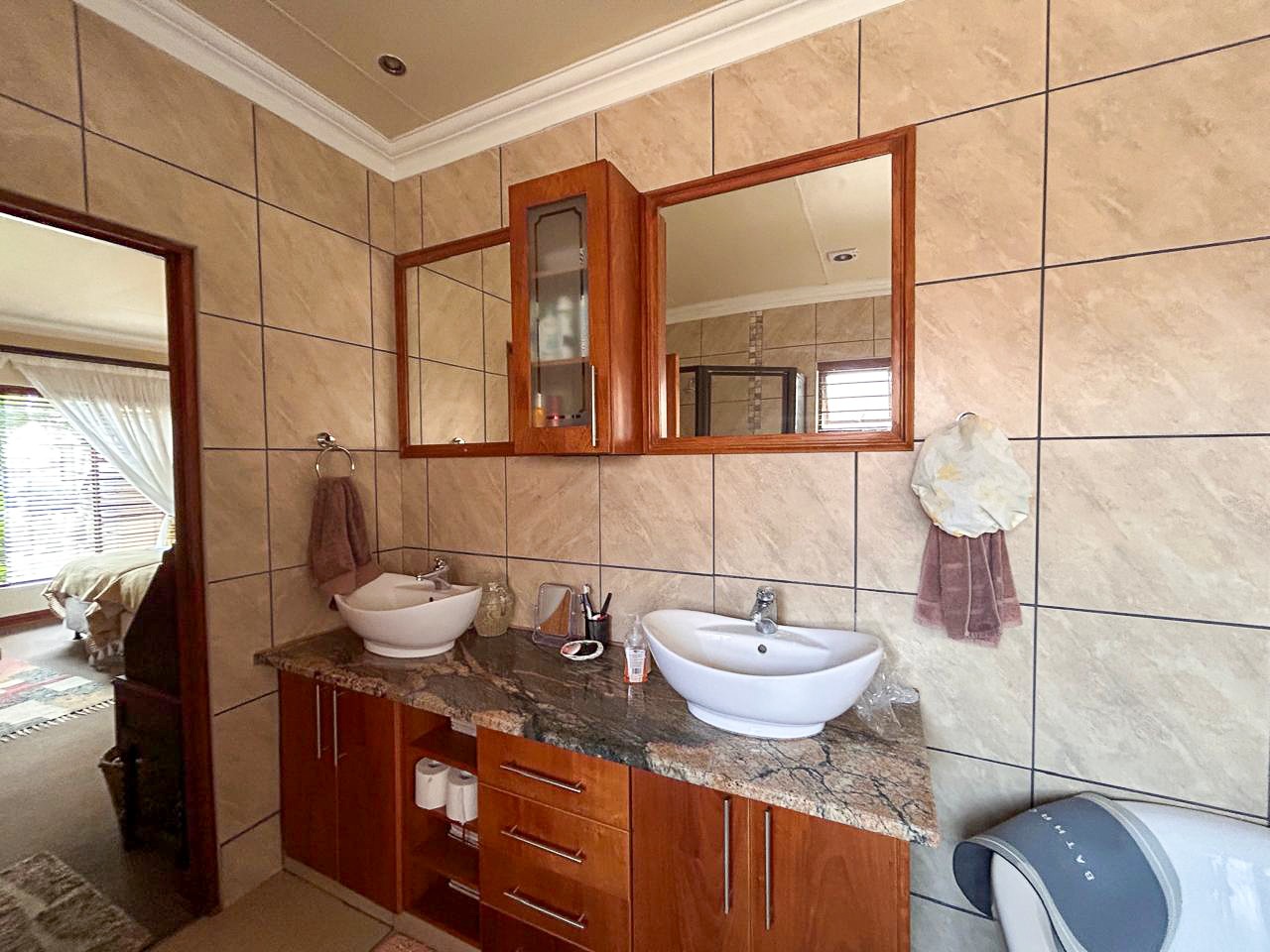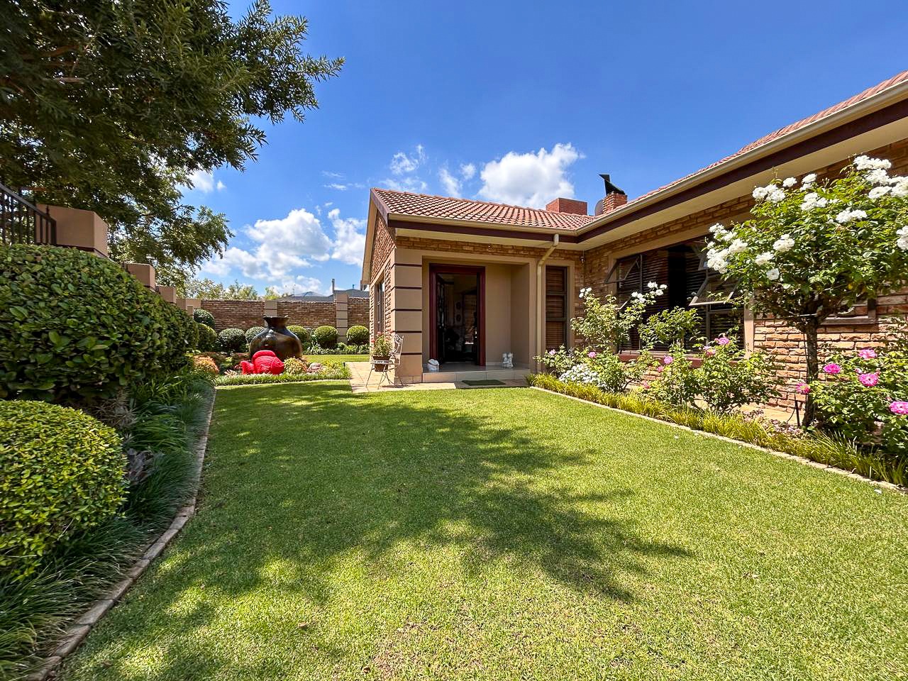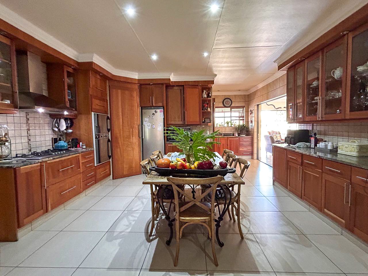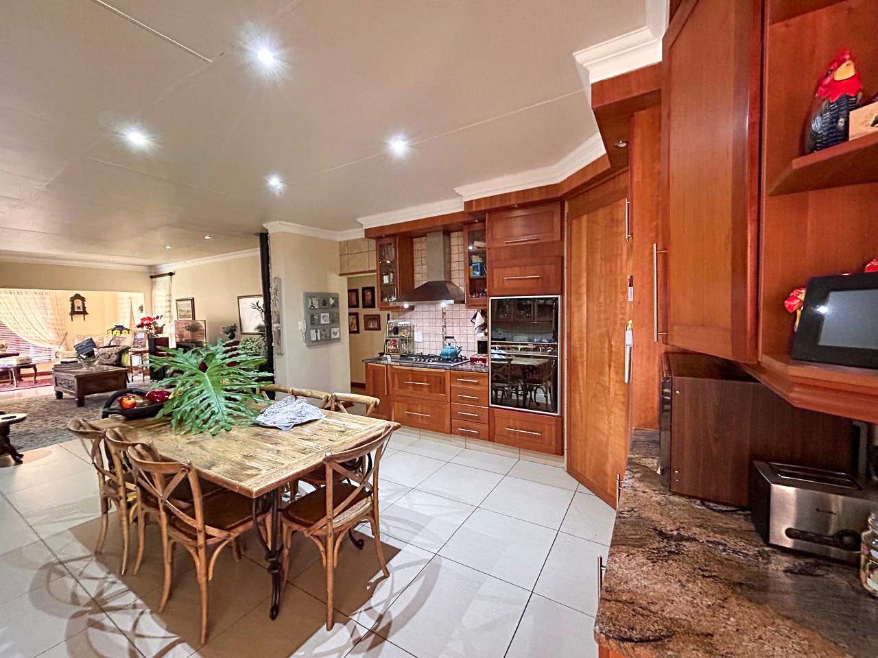 The heart of this home is the spacious and versatile braai room, a true entertainer’s paradise. Featuring a built-in braai and a luxurious jacuzzi, this space is ideal for celebrations or relaxing after a long day. Stacker doors open effortlessly onto the lush garden, creating a seamless transition between indoor and outdoor living.