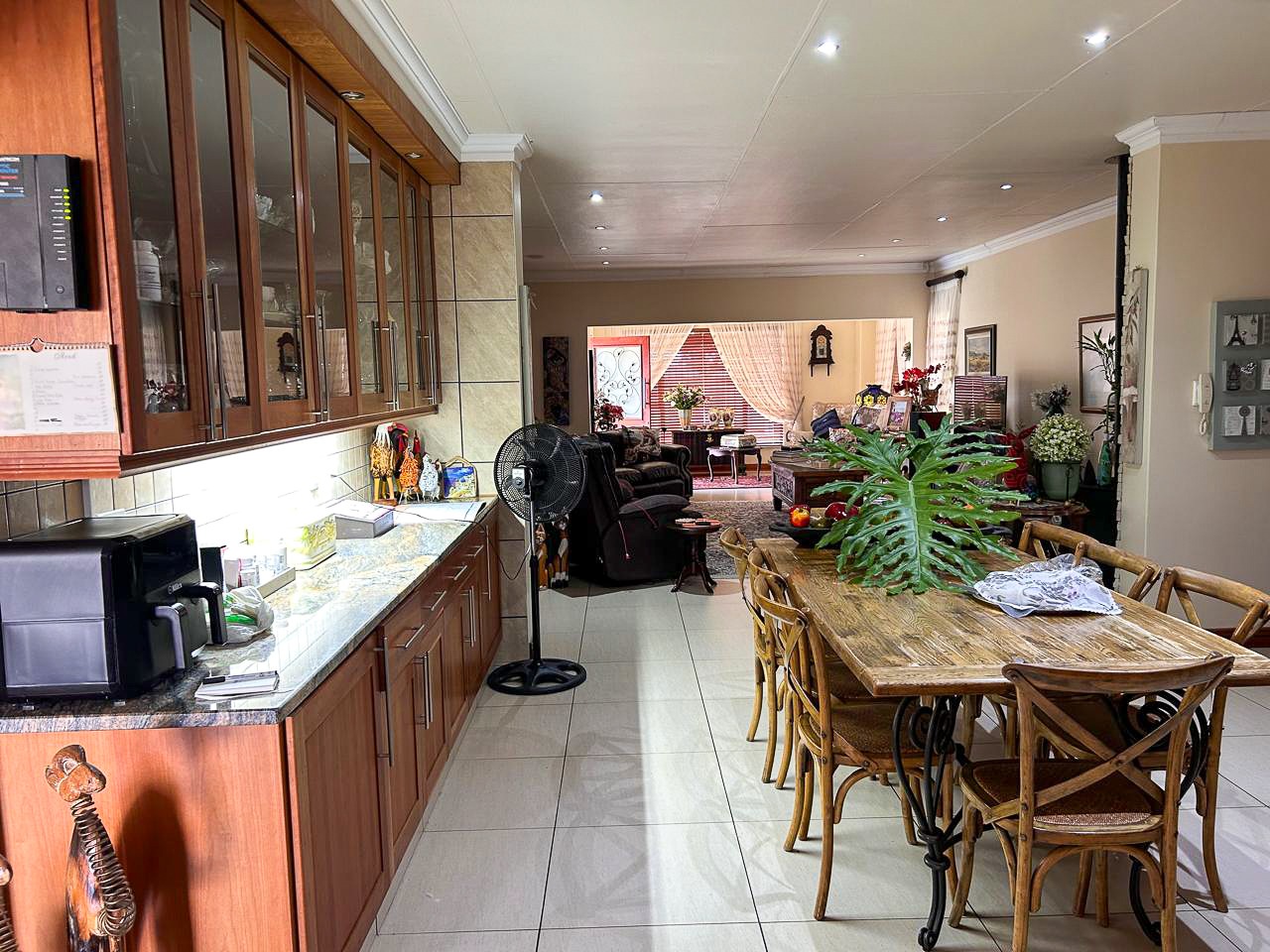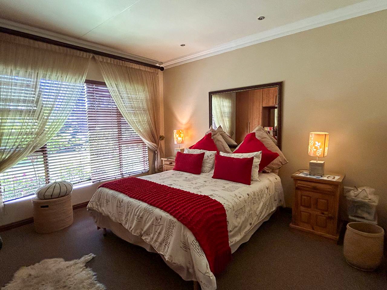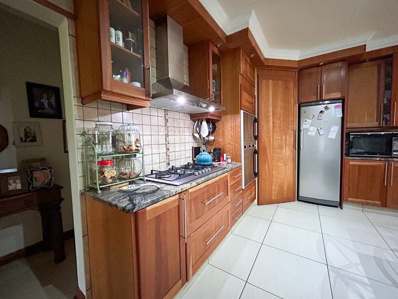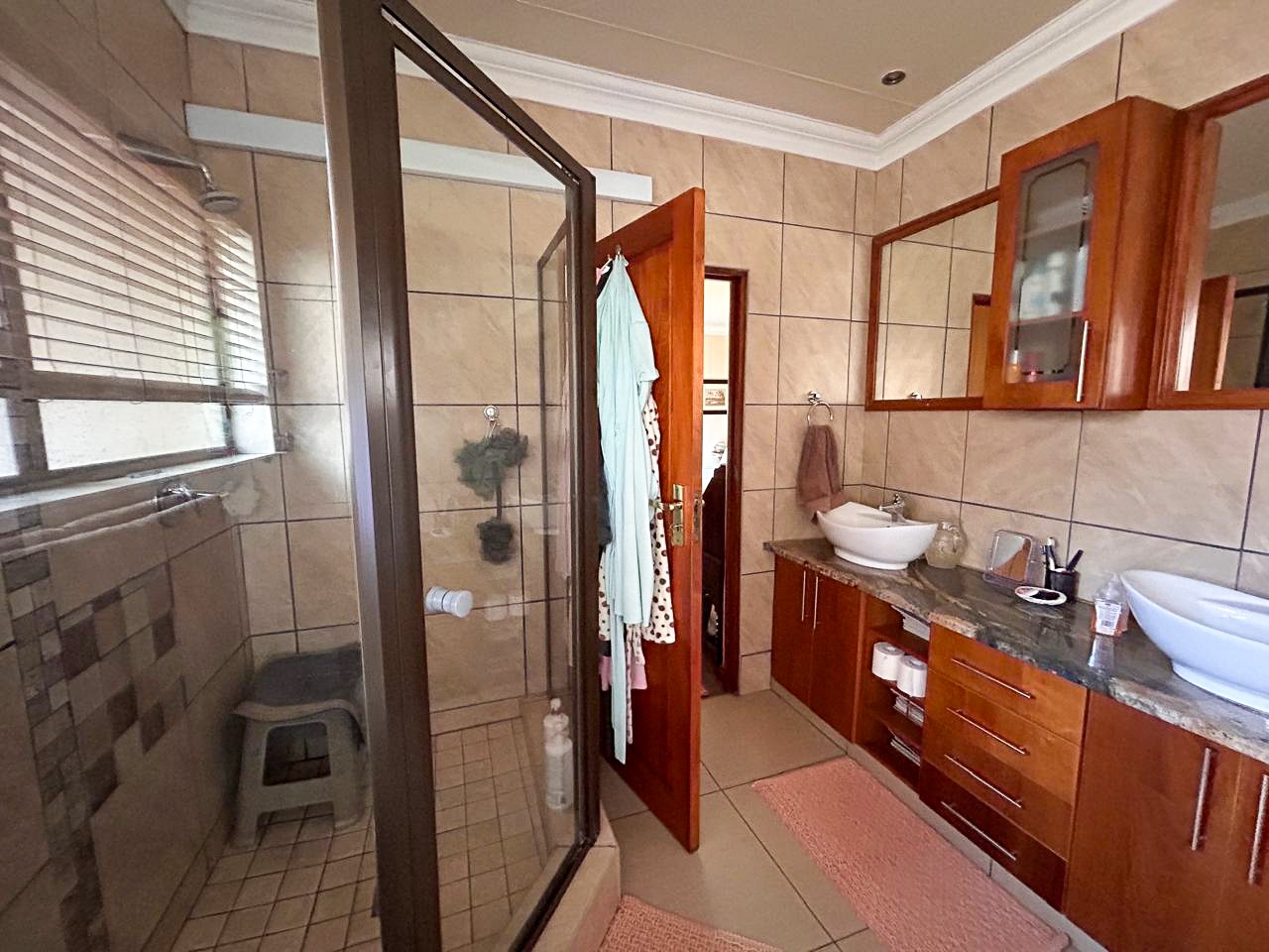 The heart of this home is the spacious and versatile braai room, a true entertainer’s paradise. Featuring a built-in braai and a luxurious jacuzzi, this space is ideal for celebrations or relaxing after a long day. Stacker doors open effortlessly onto the lush garden, creating a seamless transition between indoor and outdoor living.