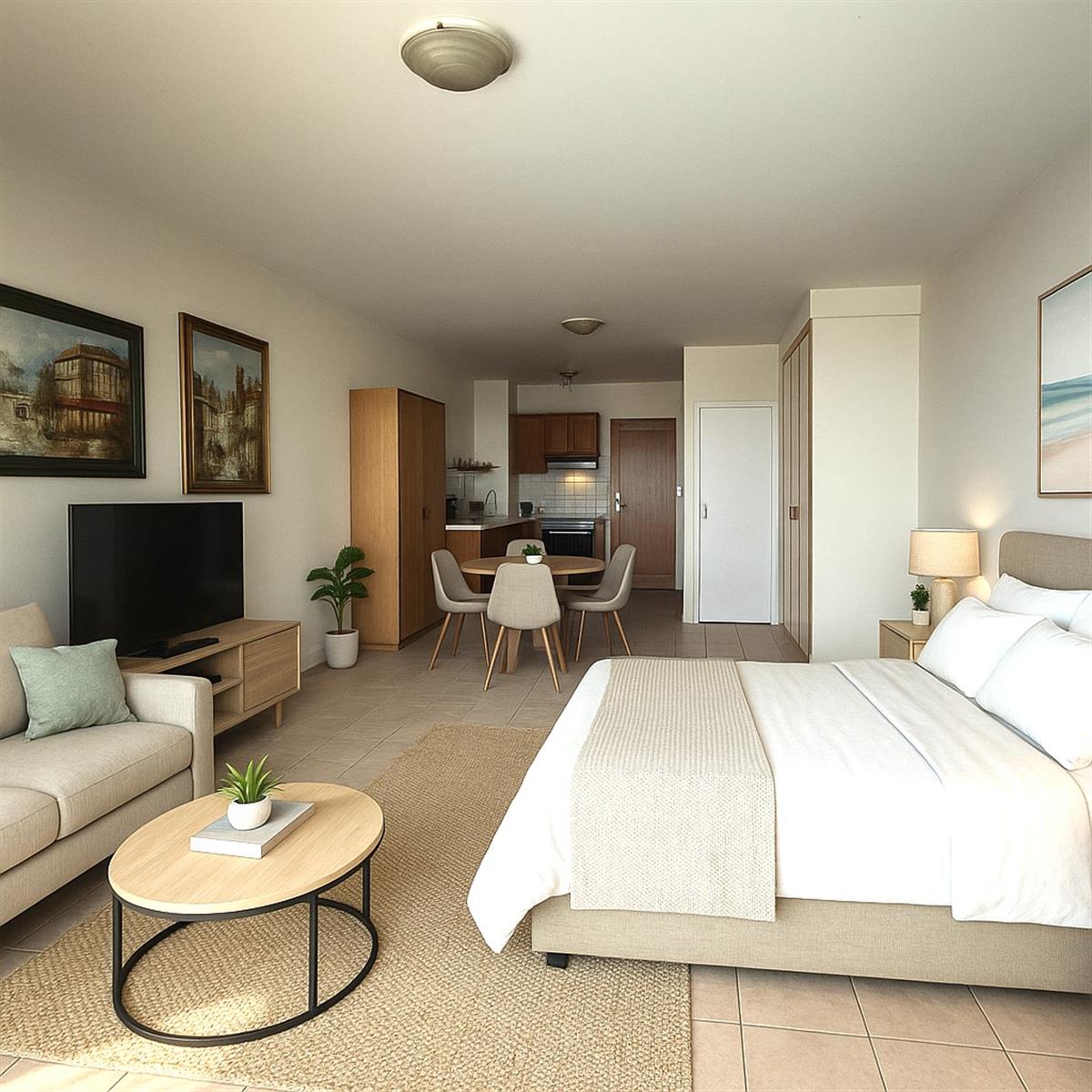 The open plan layout of the apartment creates a sense of spaciousness and allows for natural light to flow through, making it a warm and inviting space to call home.