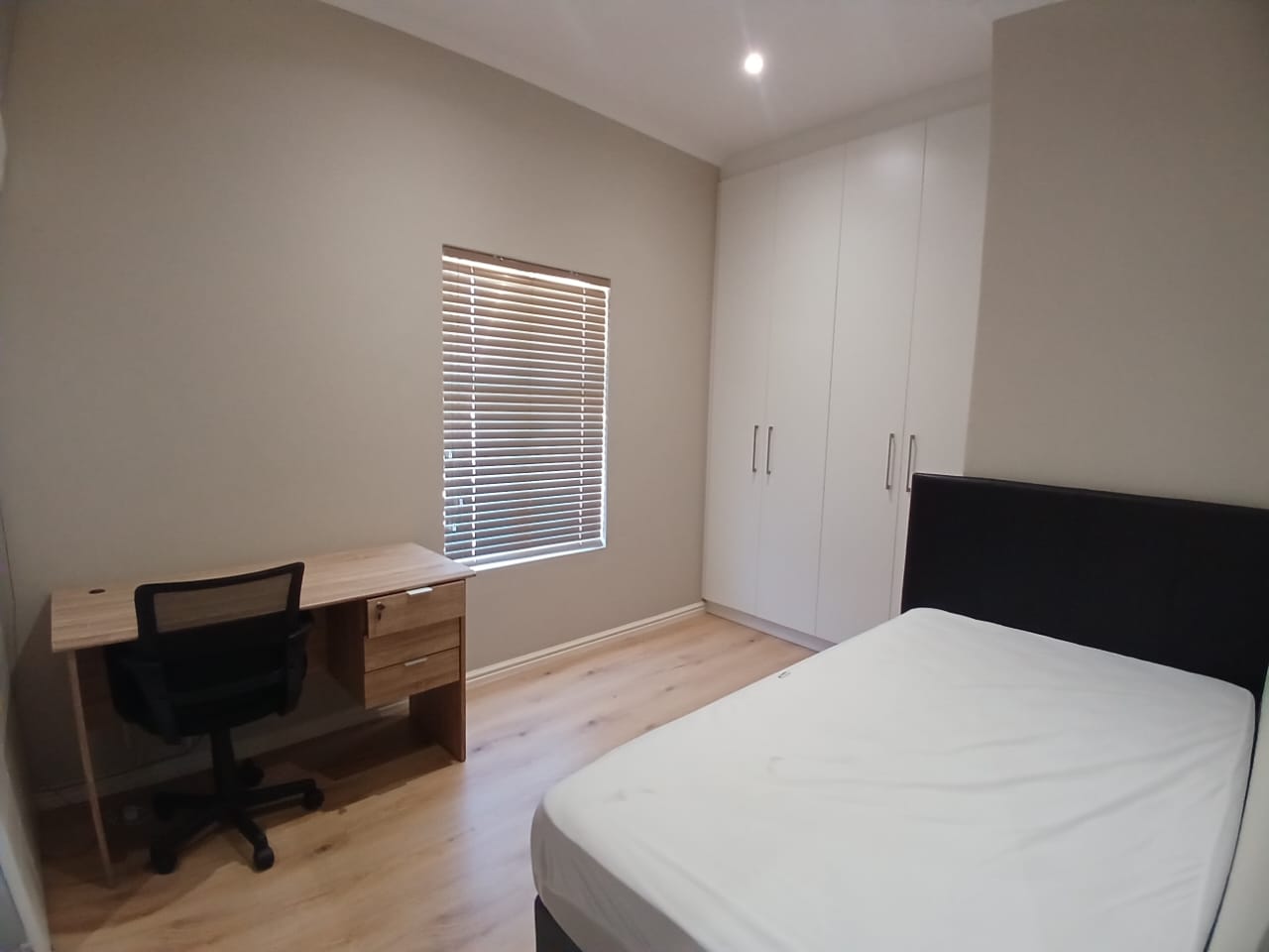 Leading out from the lounge is a lovely braai area, perfect for relaxing or entertaining. All bedrooms are en suite, offering privacy and comfort. Each room includes a single bed, desk, chair, and built-in cupboards. The rooms are spacious, fitted with blinds on all windows. Just bring your own bedding.