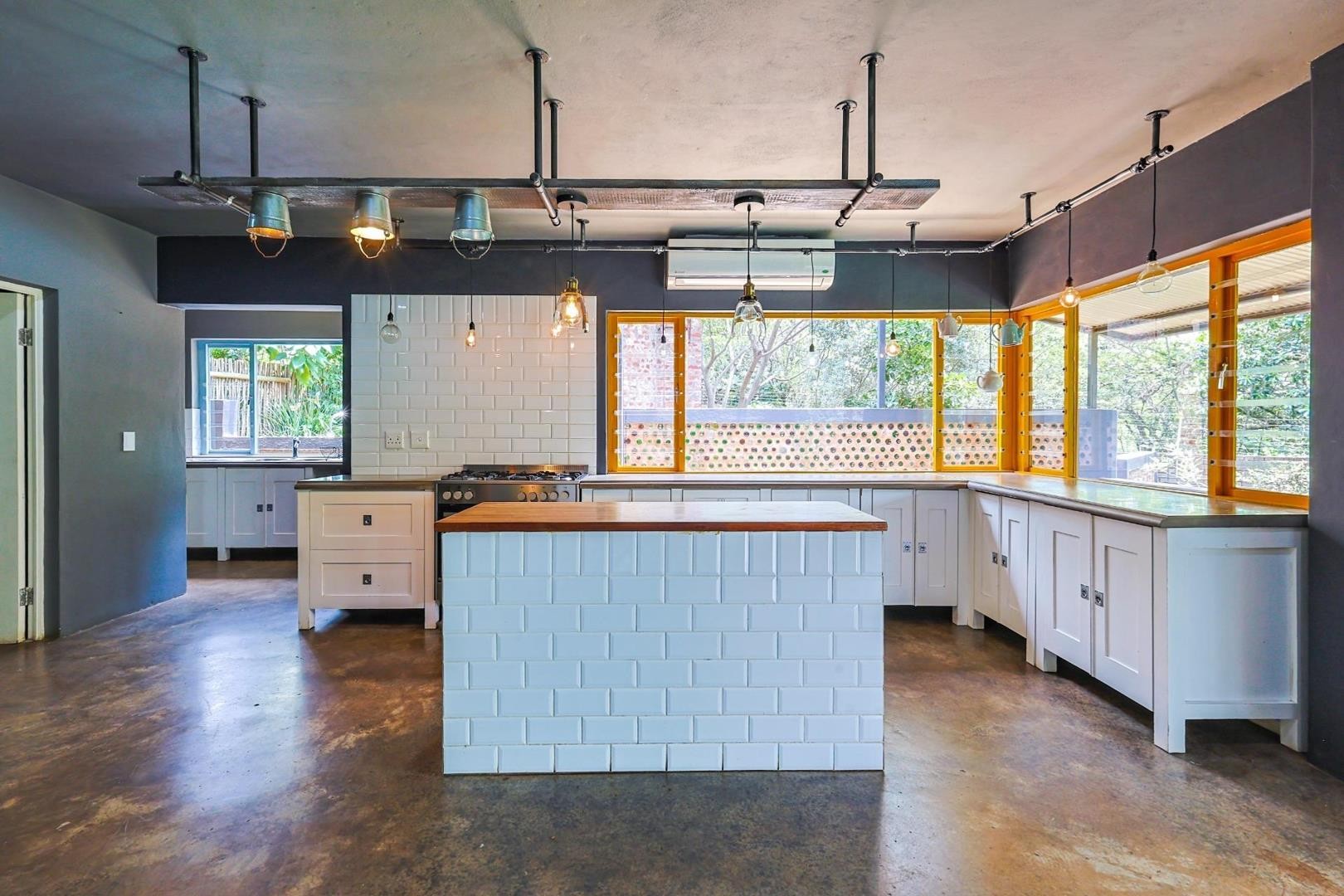 The kitchen is both stylish and functional, boasting wooden and cement countertops, a 5-plate gas oven and stove, two walk-in pantries, and a separate scullery with space for four appliances.