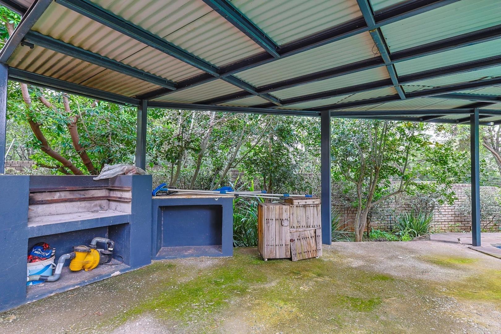 The heart of the home features an open-plan TV/family room, dining area, and kitchen, all flowing seamlessly onto a covered patio with a built-in braai, perfect for entertaining while enjoying views of the pool and garden. The garden also includes a jungle gym and a boma area, making it ideal for family living.