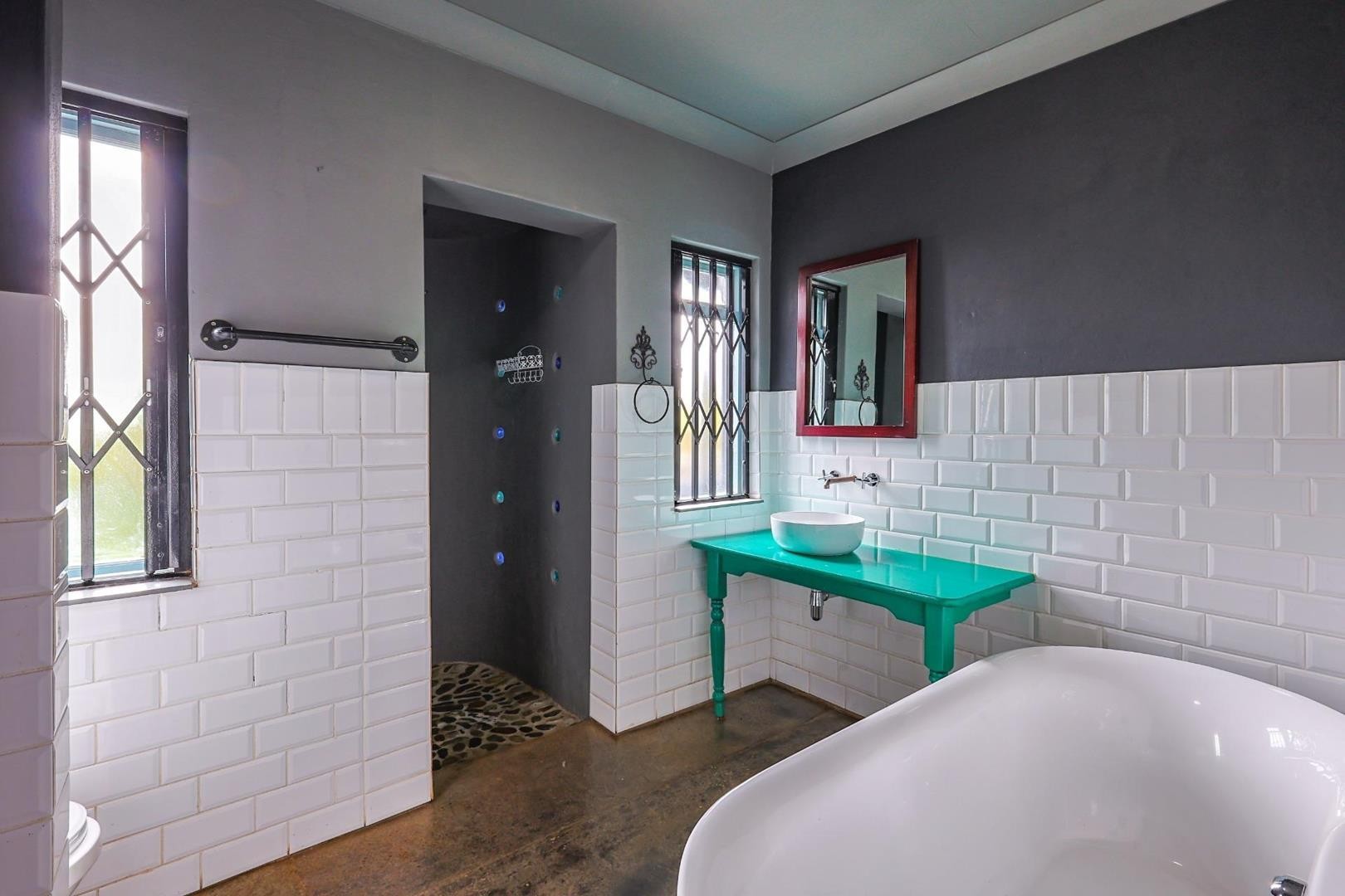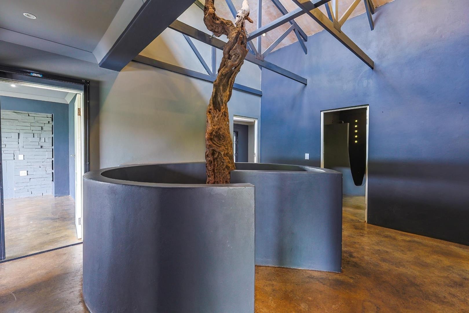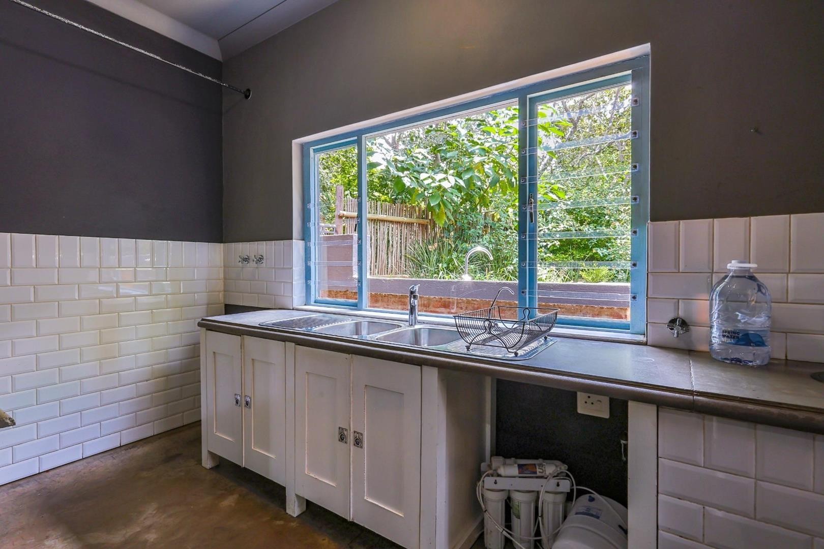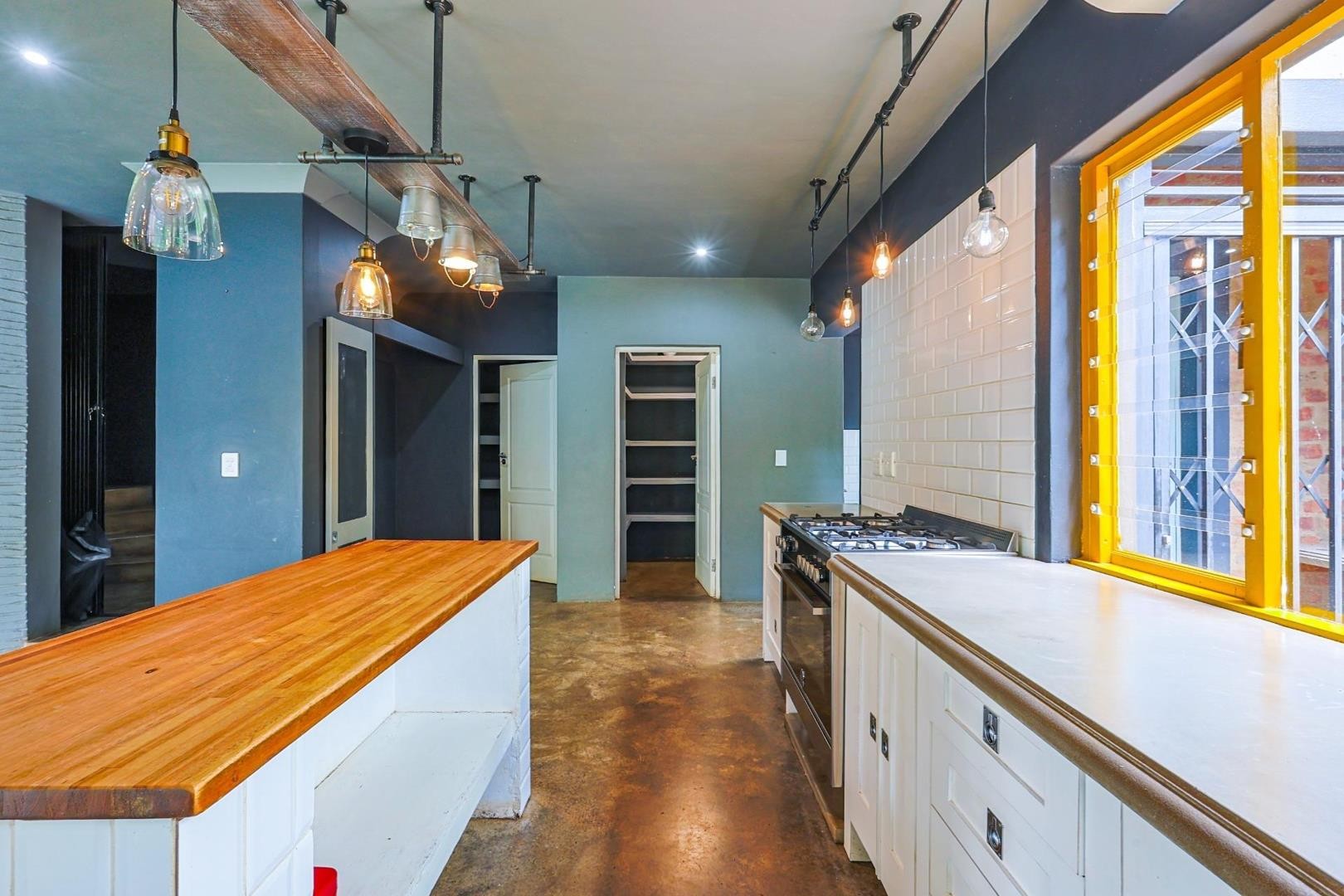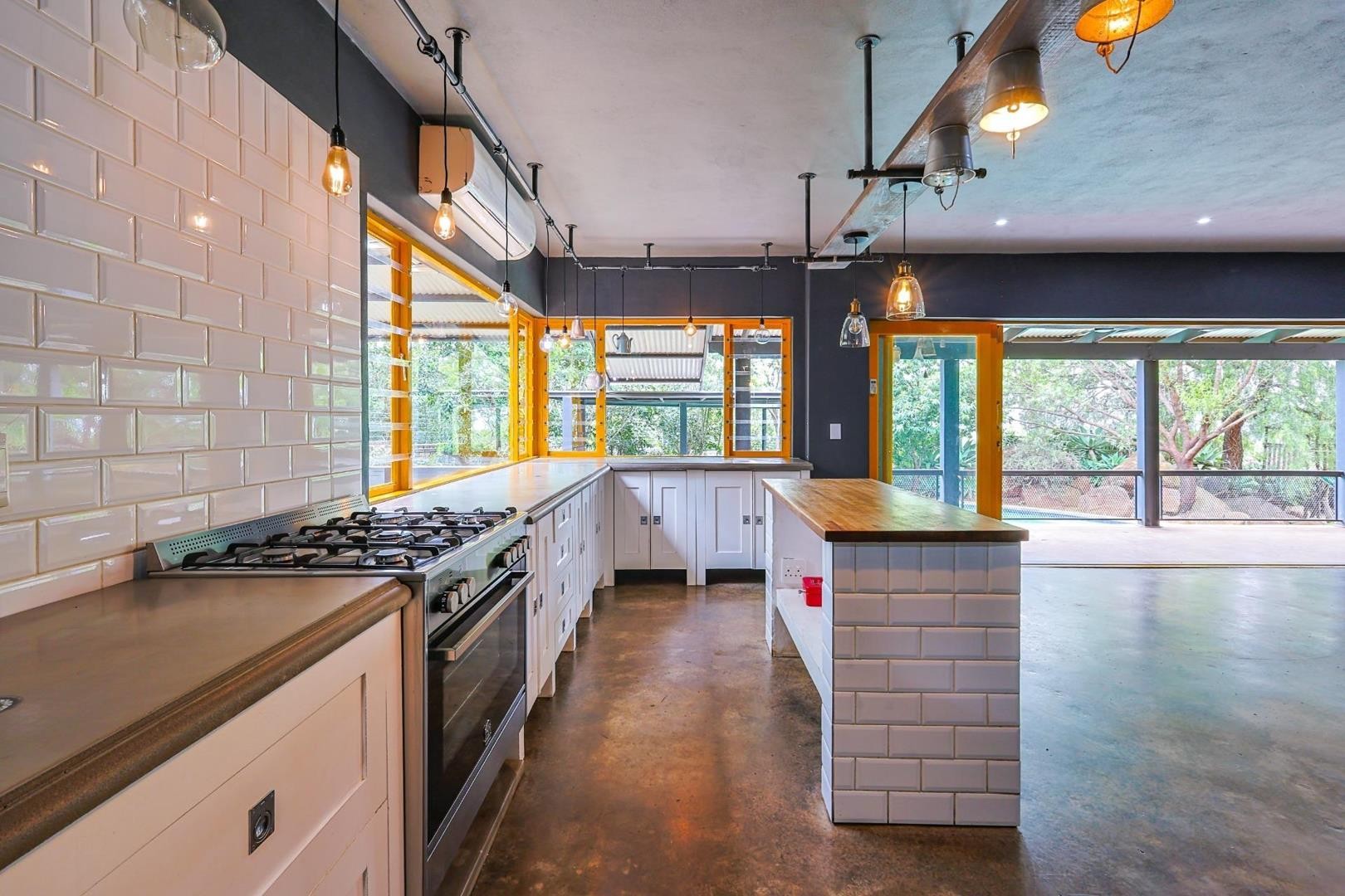 The kitchen is both stylish and functional, boasting wooden and cement countertops, a 5-plate gas oven and stove, two walk-in pantries, and a separate scullery with space for four appliances.