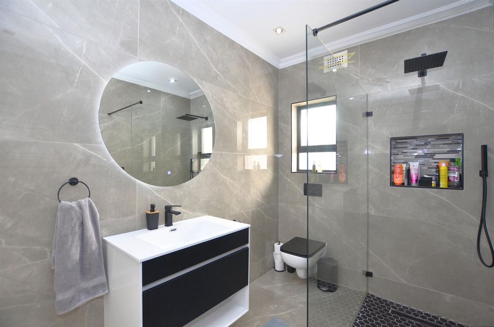 The main bedroom features an en-suite bathroom with shower, built-in cupboards and air-conditioning. The two additional bedrooms include modern laminate flooring and are serviced by a beautifully modernized family bathroom offering full-height marble-look tiles, a frameless walk-in shower with rainfall head, a floating vanity, LED backlit mirror, wall-hung toilet, and sleek matte black fittings for a stylish, luxurious feel.