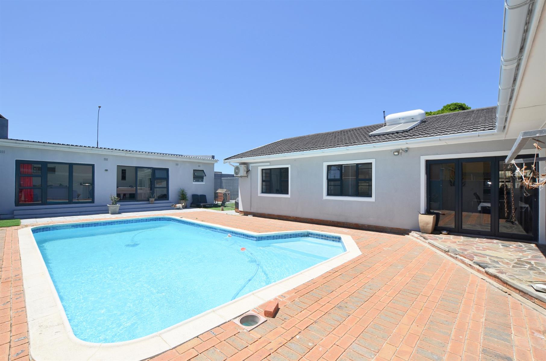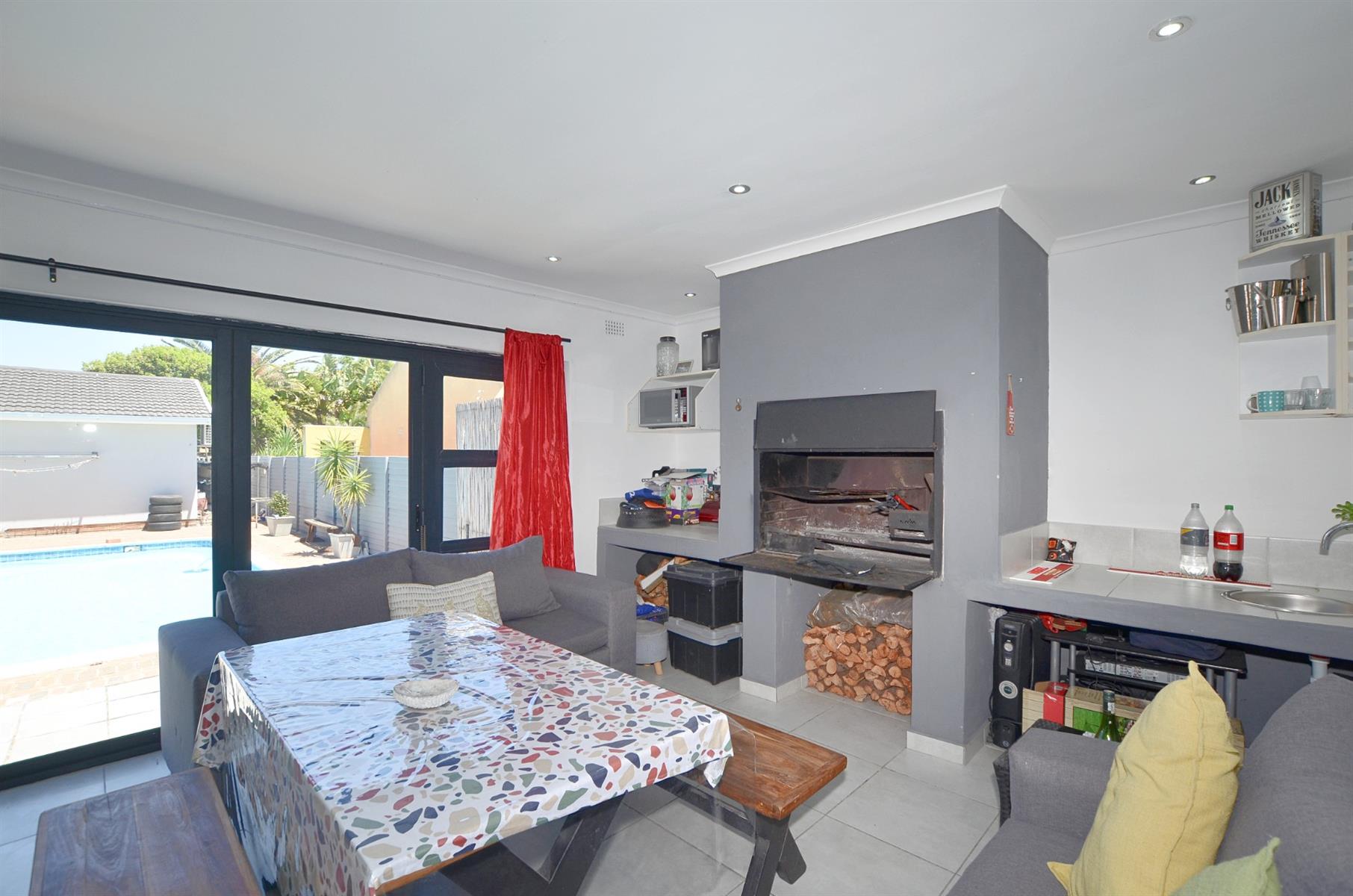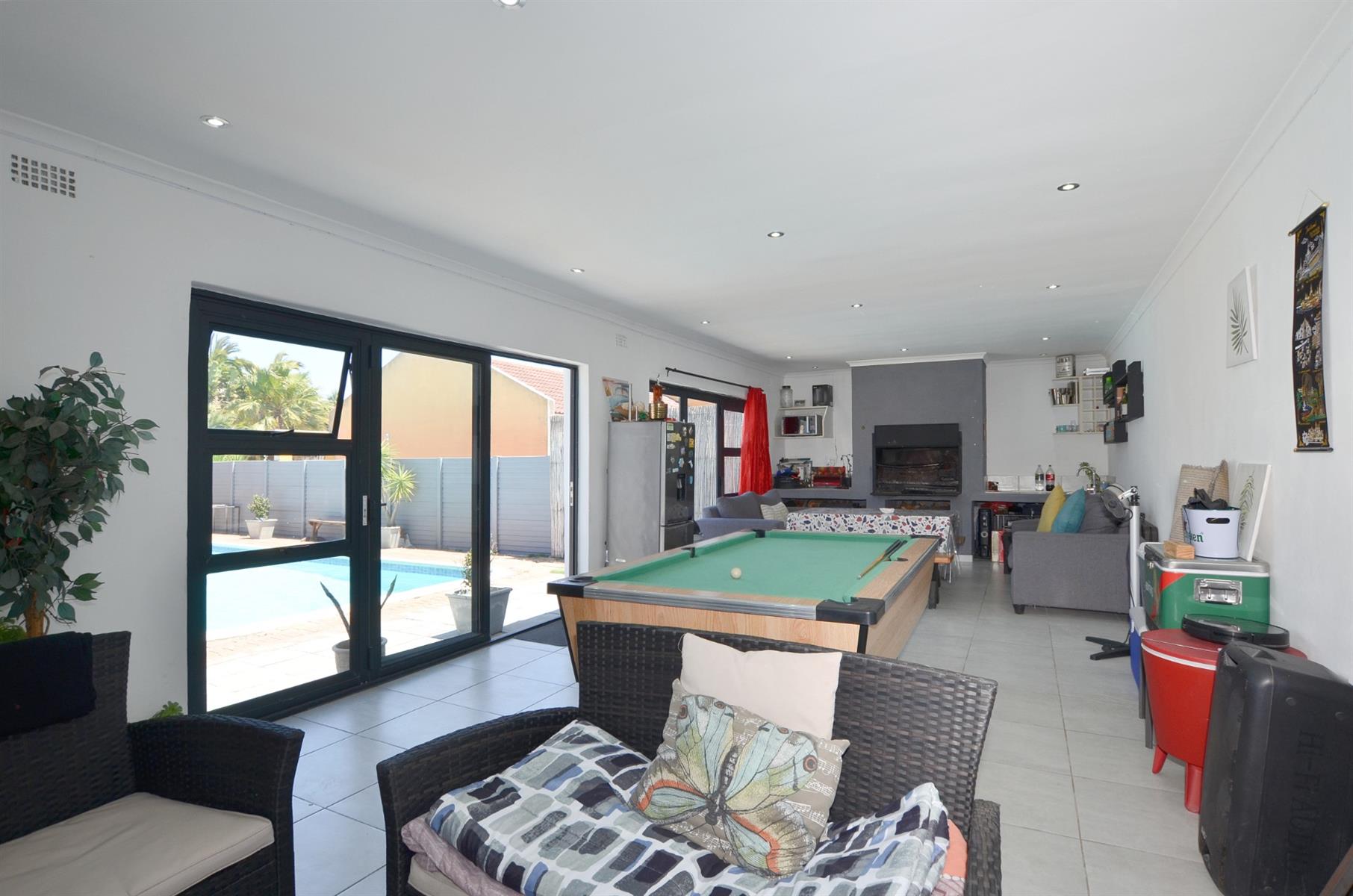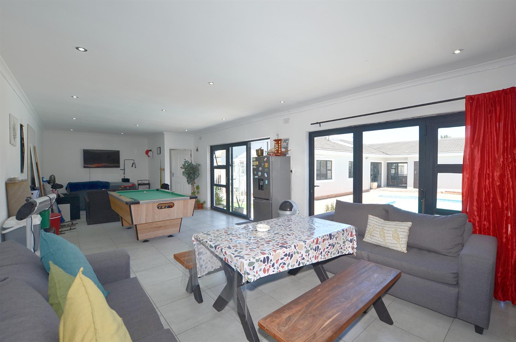 The entertainment continues into the large indoor braai and entertainment room. This spacious area is perfect for year-round hosting, offering multiple seating zones, space for a pool table or games area, a dining setup, recessed lighting and modern floor tiles. Large aluminium sliding doors open directly to the swimming pool, creating effortless indoor-outdoor living. The built-in braai sits against a feature wall with extra shelving, and the space enjoys excellent natural light. The backyard further enhances this lifestyle with a large pool and a versatile outbuilding currently used as a pool room with its own toilet — ideal for converting into a fourth bedroom, guest suite or work-from-home office.