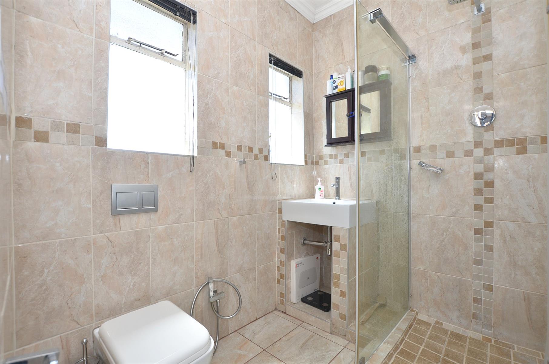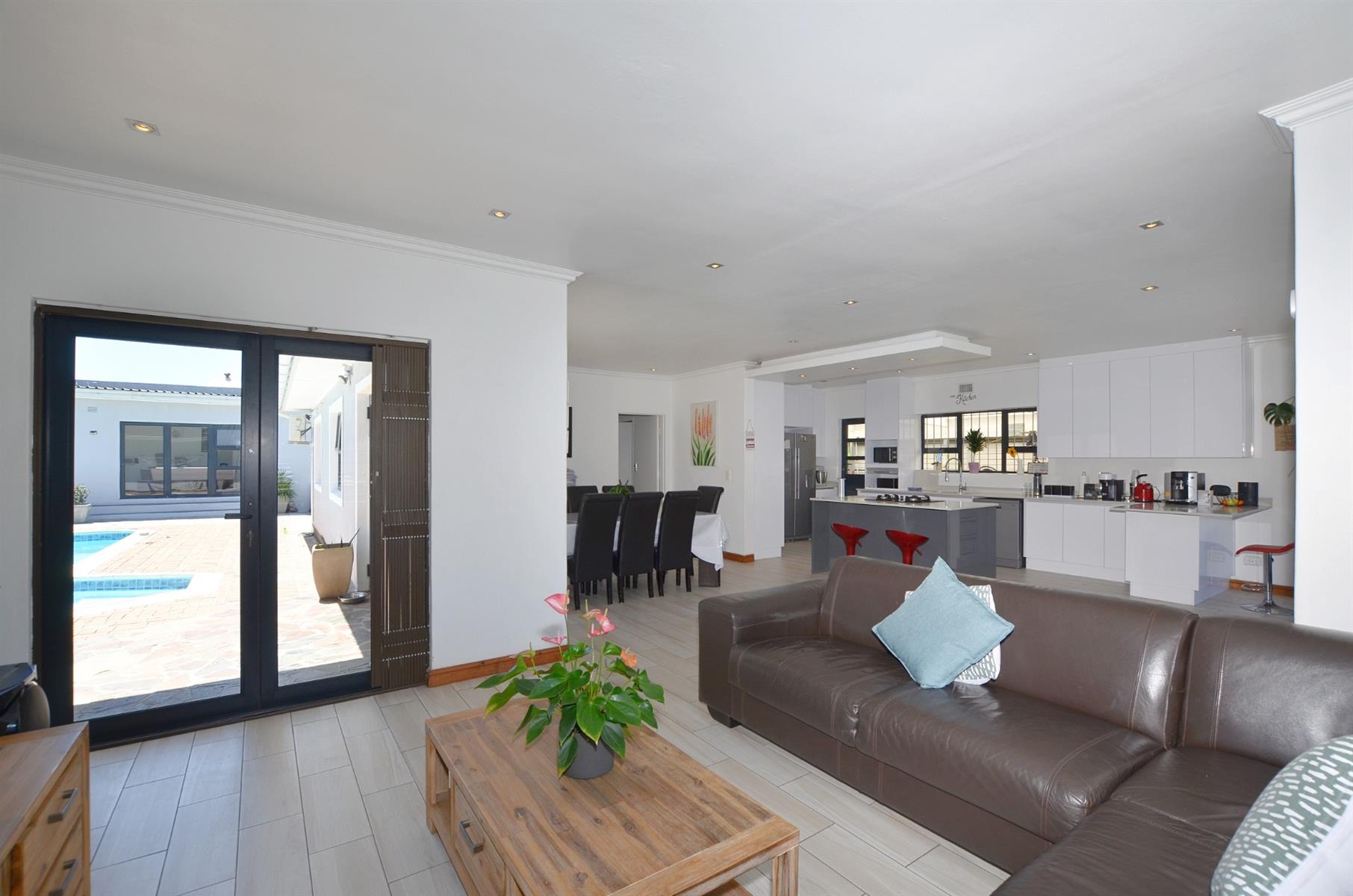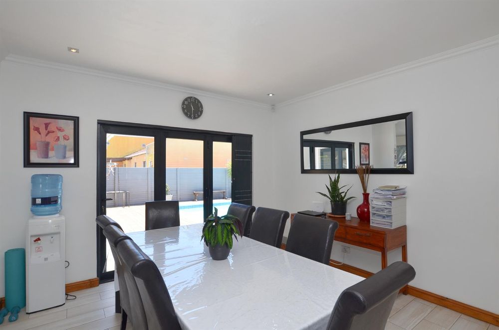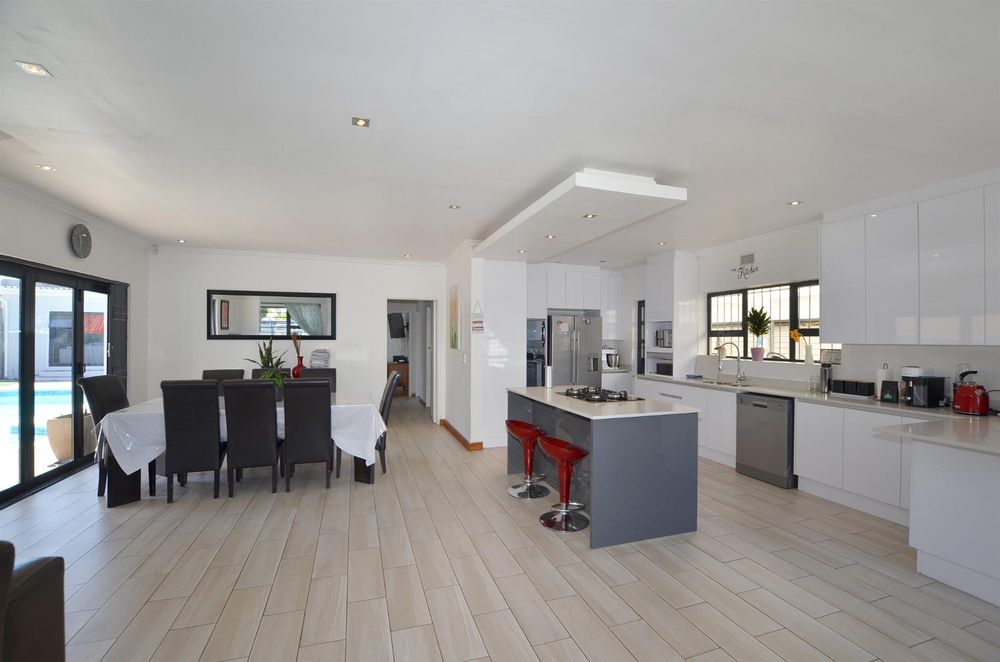 The entertainment continues into the large indoor braai and entertainment room. This spacious area is perfect for year-round hosting, offering multiple seating zones, space for a pool table or games area, a dining setup, recessed lighting and modern floor tiles. Large aluminium sliding doors open directly to the swimming pool, creating effortless indoor-outdoor living. The built-in braai sits against a feature wall with extra shelving, and the space enjoys excellent natural light. The backyard further enhances this lifestyle with a large pool and a versatile outbuilding currently used as a pool room with its own toilet — ideal for converting into a fourth bedroom, guest suite or work-from-home office.