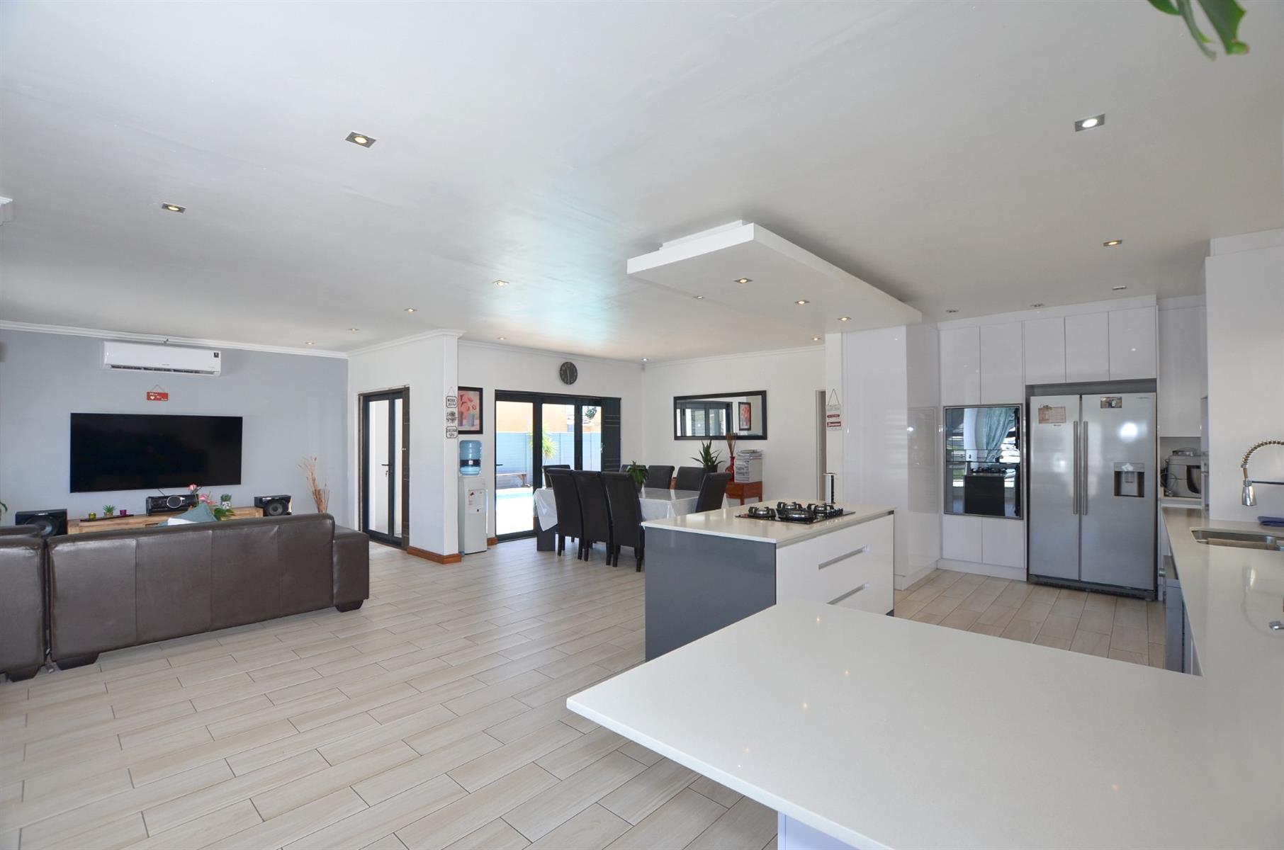 The open-plan living and entertainment areas are a highlight of the home, filled with natural light and offering seamless indoor-outdoor flow. The kitchen is modern and spacious, featuring Caesarstone countertops, a centre cooking island with built-in gas hob, high-gloss cabinetry, soft-close cupboards, double-door fridge cavity, built-in microwave and oven space, large prep counters, dishwasher space and LED downlighting. It’s the perfect space for cooking and entertaining.