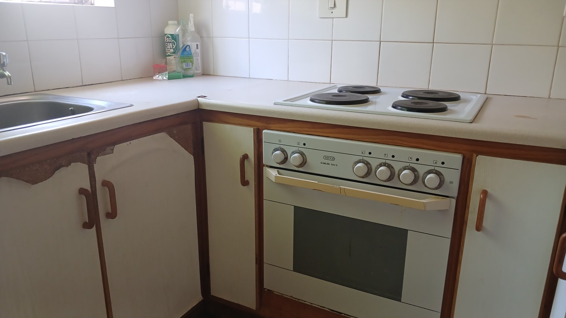 This ground-floor apartment offers a functional open-plan living area and a kitchen equipped with a built-in under-counter oven and hob, plus built-in cupboards. The apartment has one bedroom and one bathroom, both recently updated with new tiles, The bedroom still needs lot of TLC.