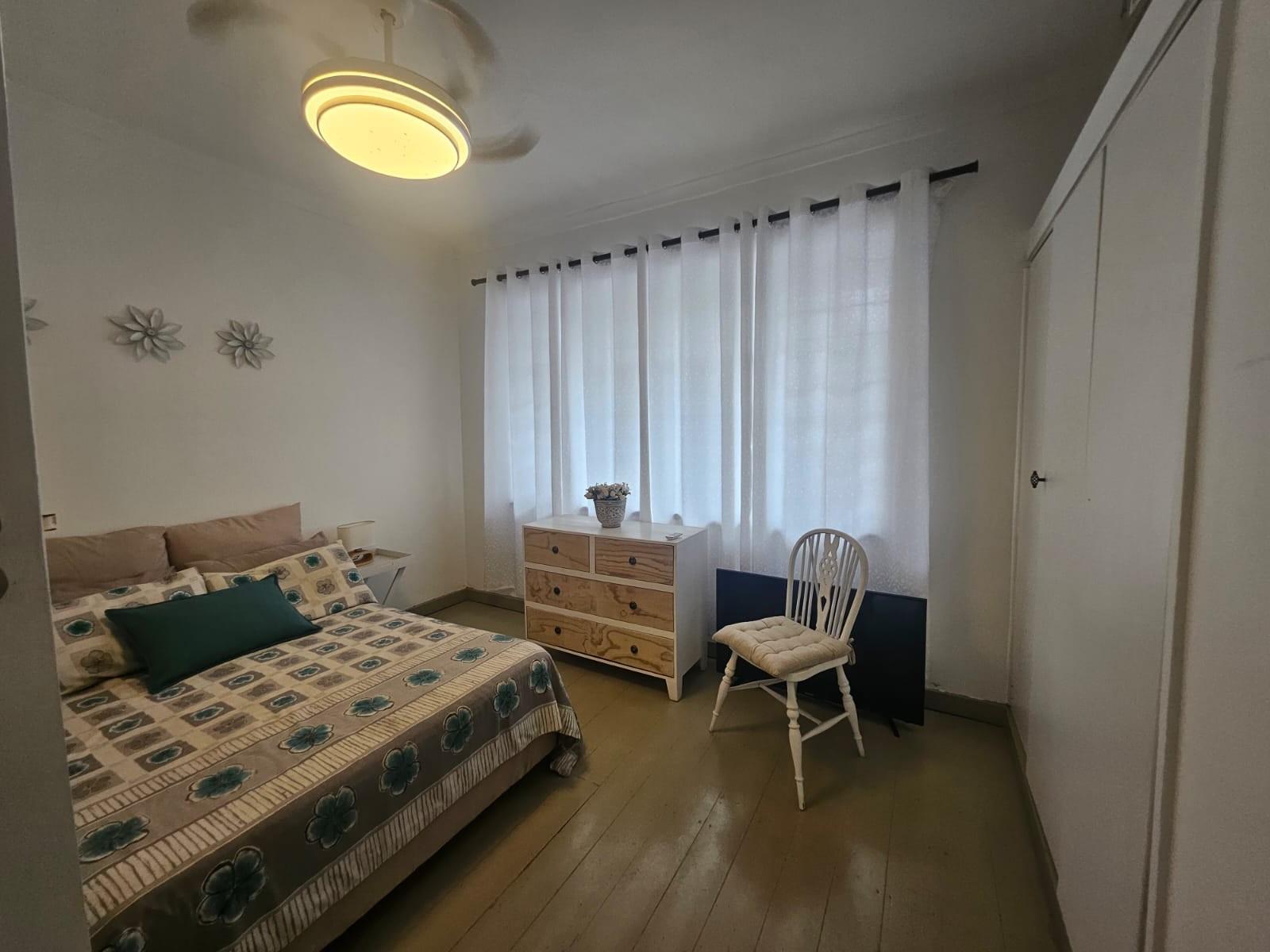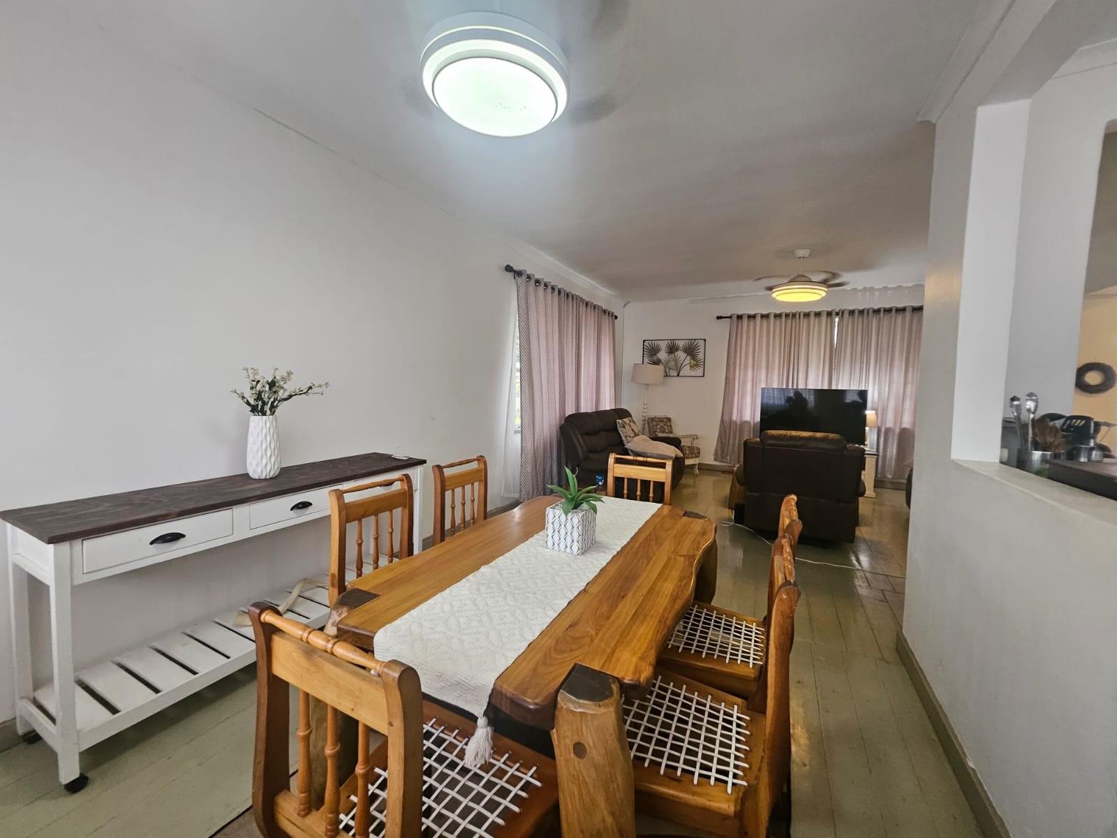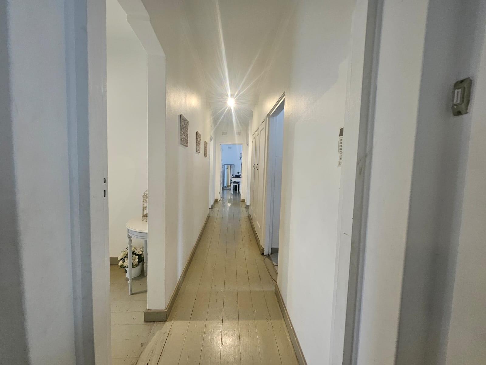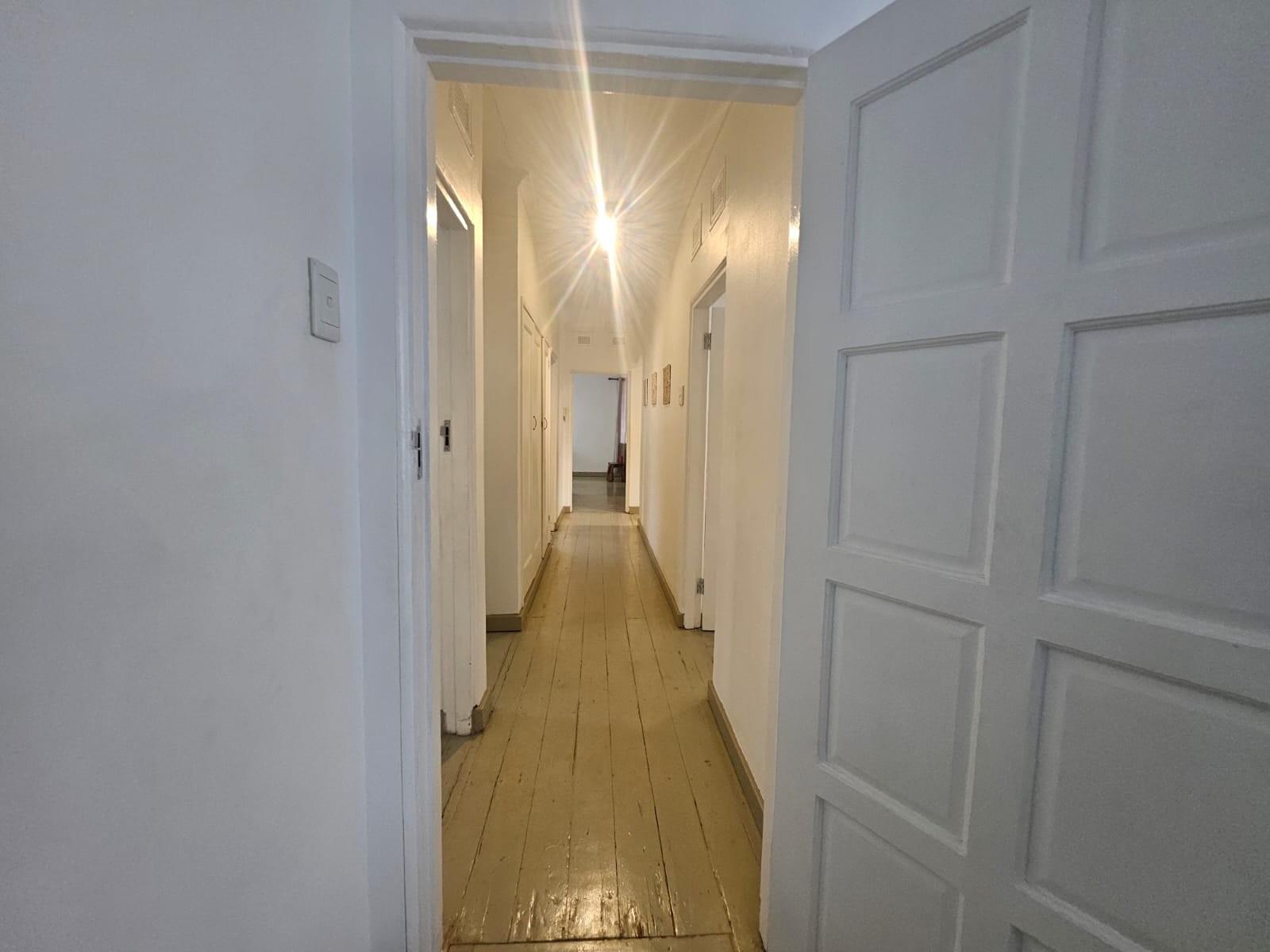 The property features three generously sized bedrooms with beautiful painted wooden floors, complemented by a neatly finished full bathroom. The kitchen is spacious and functional, fitted with ample built-in cupboards and tiled flooring, and flows seamlessly into the living areas.