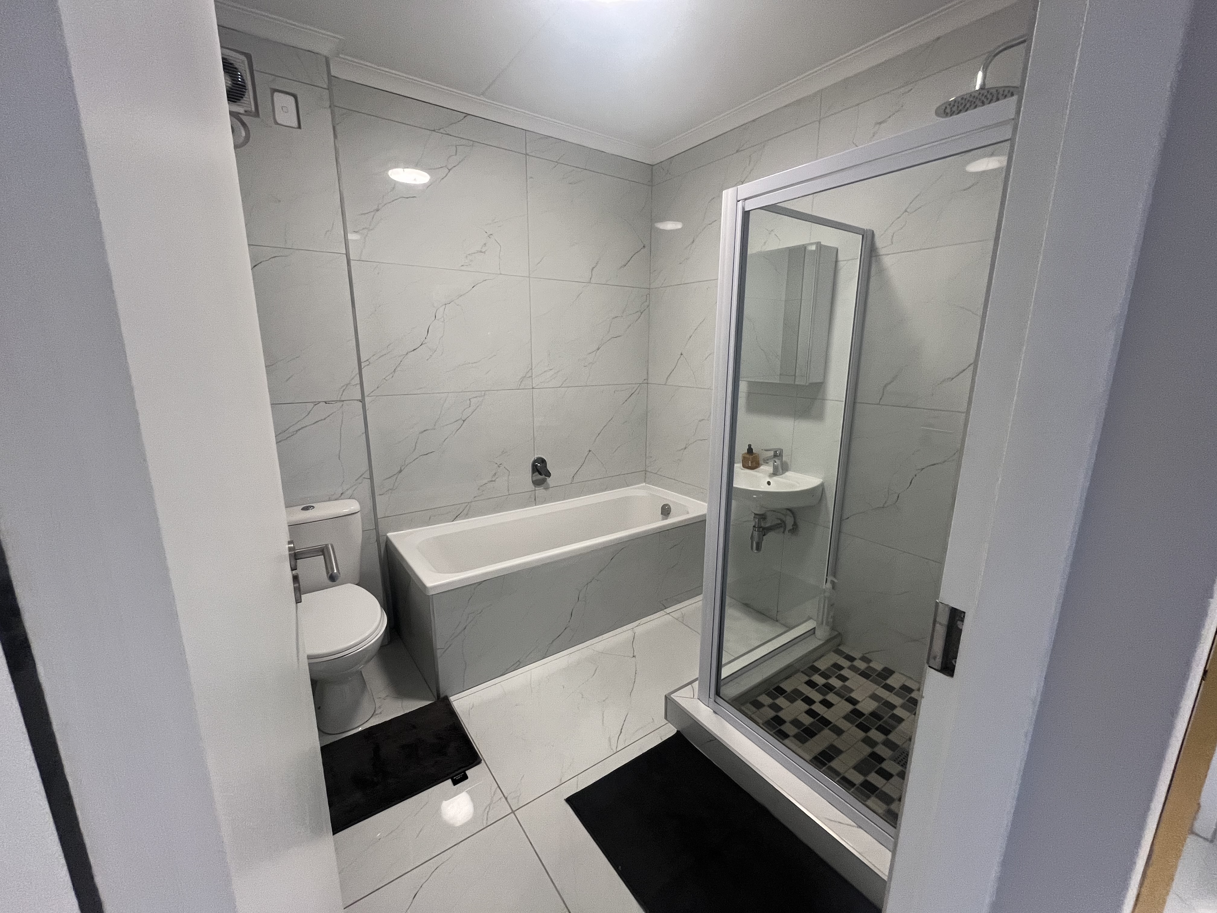 The bathroom is beautifully finished, featuring both a bath and a shower. Both bedrooms are well sized and include built in cupboards.