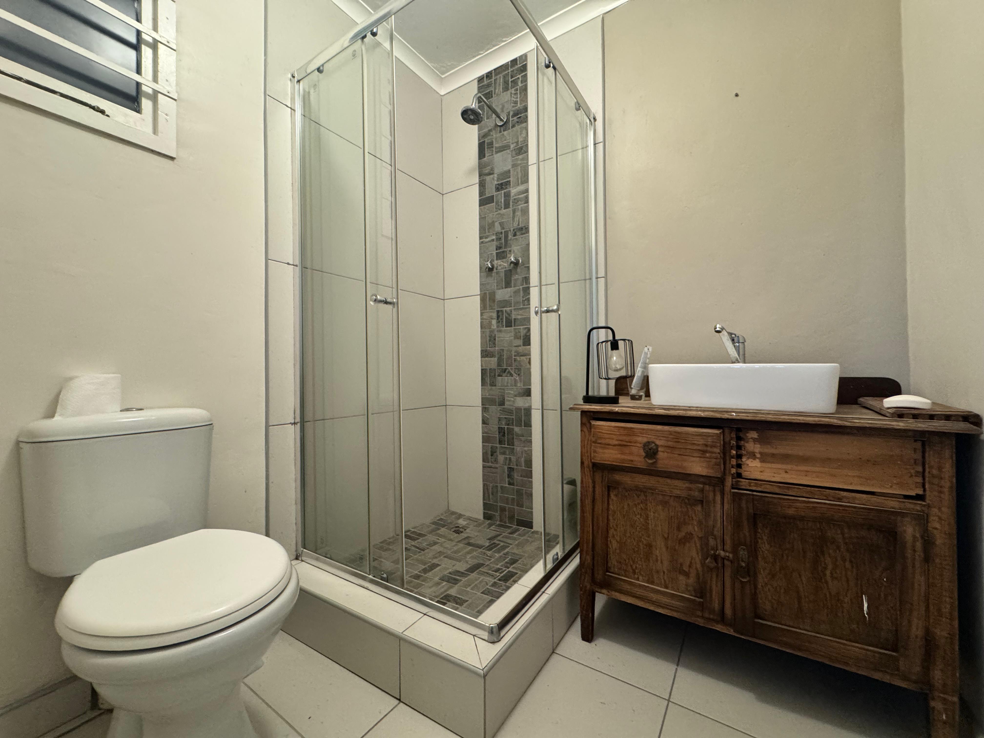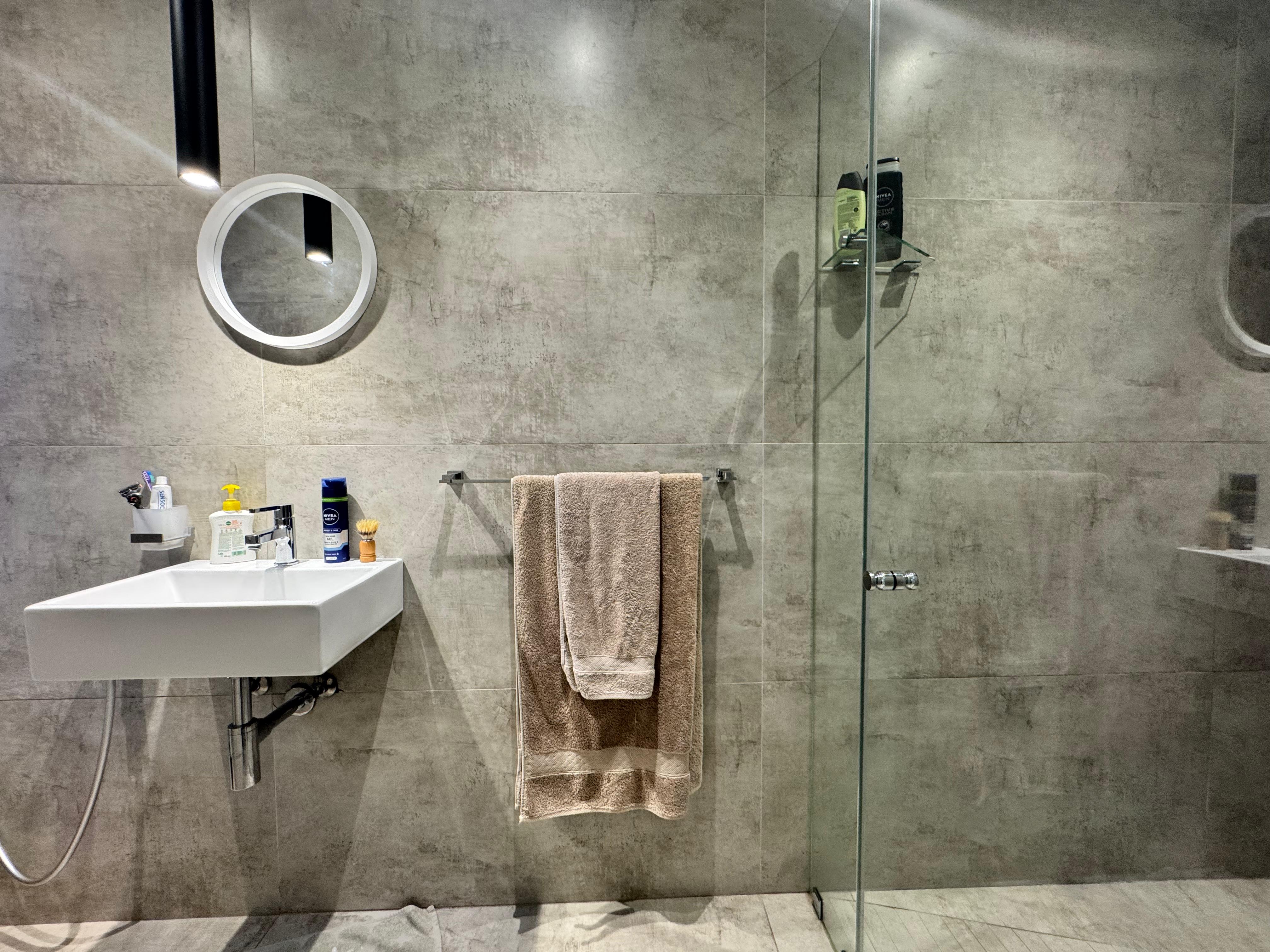 Modern bathroom with glass-enclosed shower and stylish vanity