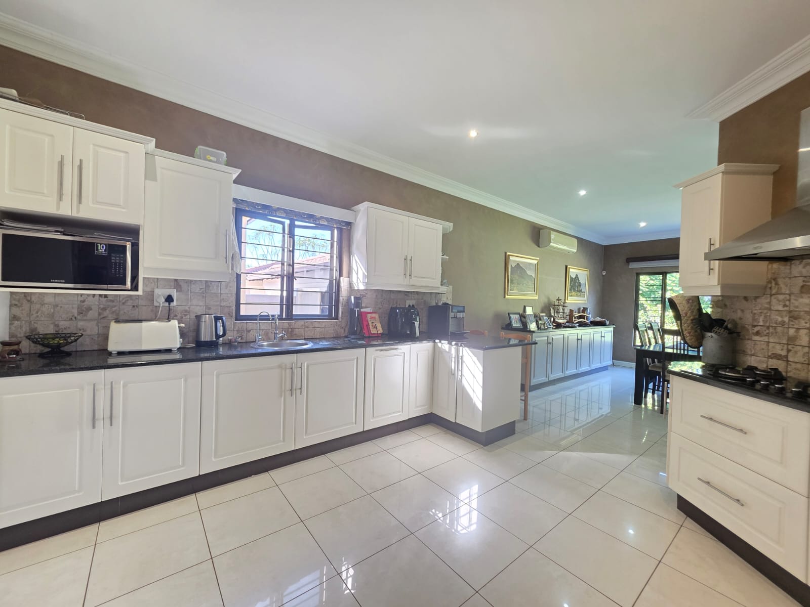 The home features three generously sized bedrooms, all en-suite, thoughtfully designed to provide privacy and comfort for every family member. The main bedroom is located upstairs and is a true sanctuary, boasting scenic views over the lush garden, sparkling swimming pool, and the 7th fairway of the Umhlali Golf Course. Spacious proportions throughout the home enhance the sense of luxury and ease, with air-conditioning installed in all rooms to ensure year-round comfort.