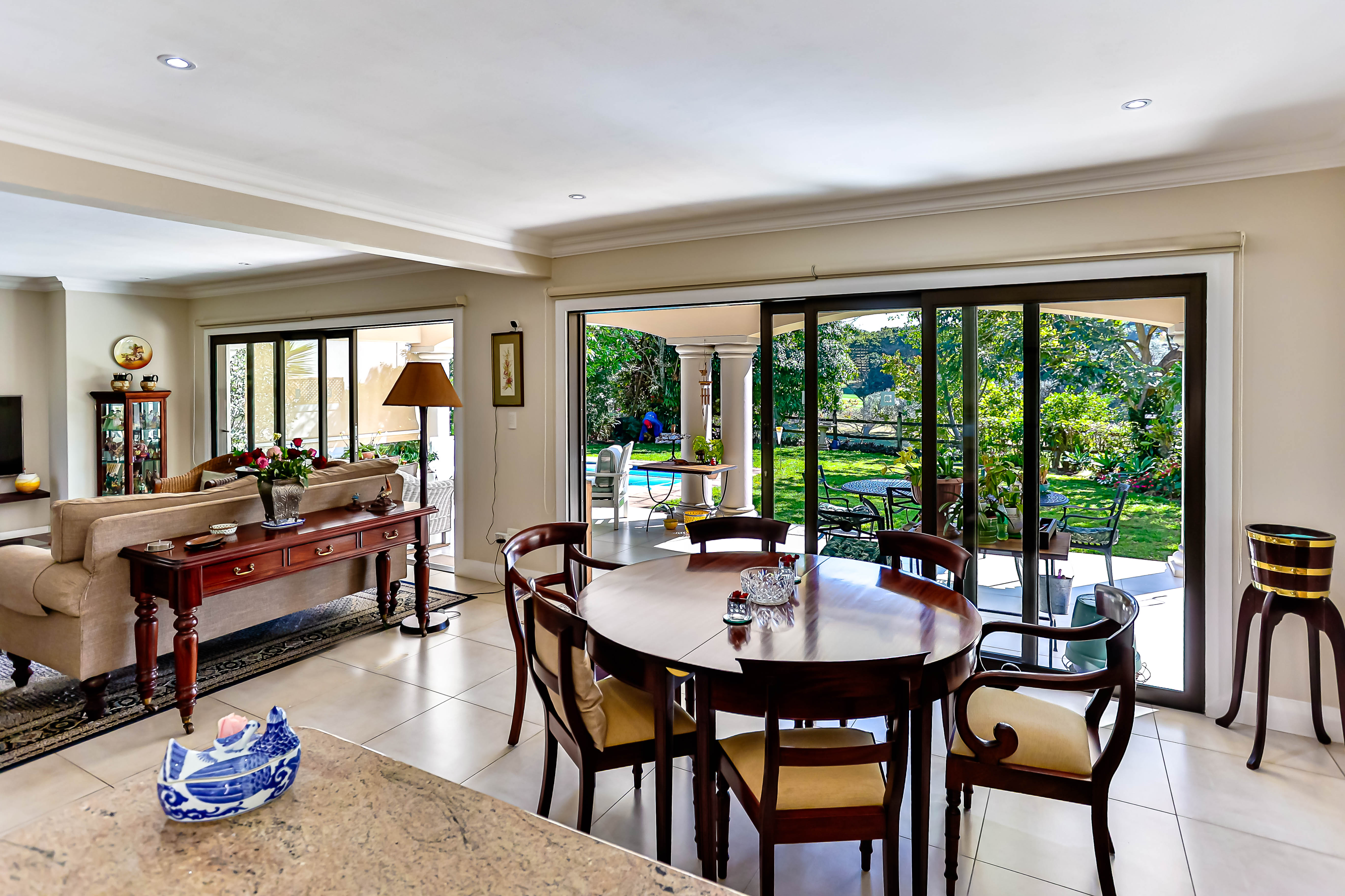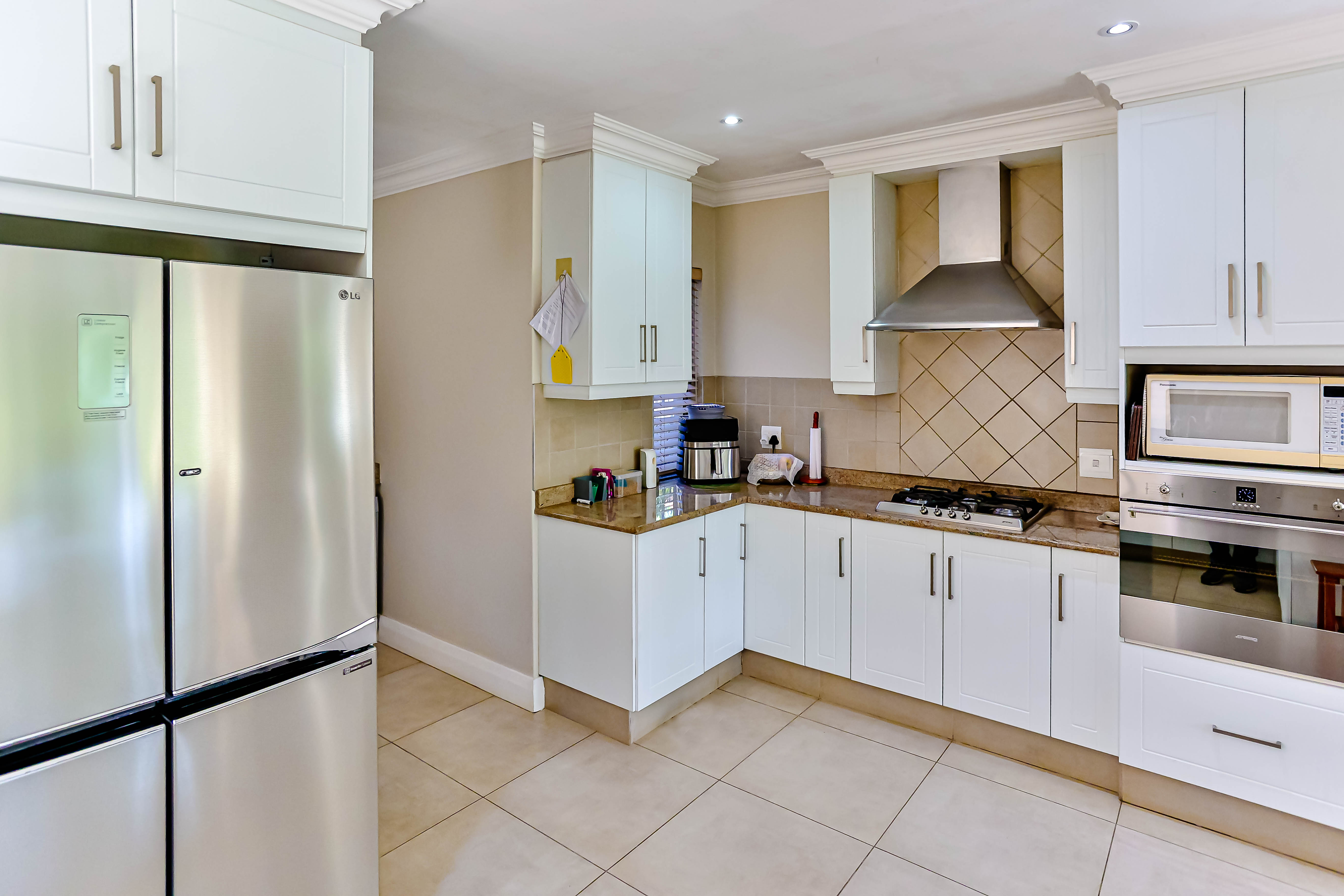 The kitchen is well-appointed with ample cupboard space and includes a convenient scullery. A stylish bar countertop overlooks the dining area, making it an ideal space for entertaining guests or for culinary enthusiasts to serve their creations. A paved courtyard and domestic quarters serve as an ideal laundry area.