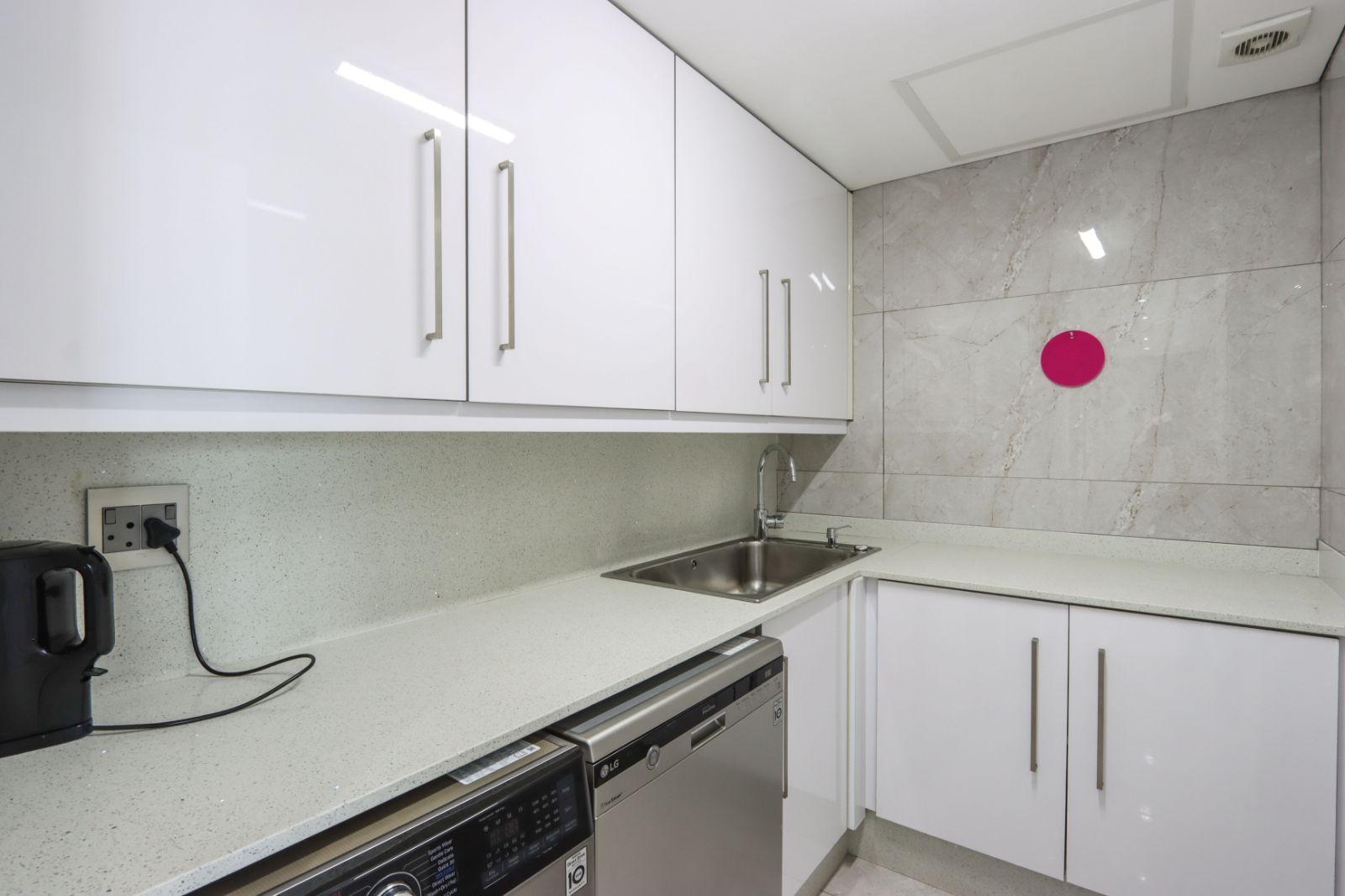 The kitchen is fully fitted with stylish finishes and plenty of storage. Additional benefits include a separate store room, air-conditioning, and double secure parking.,