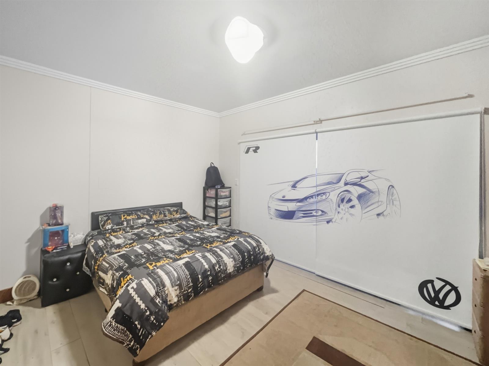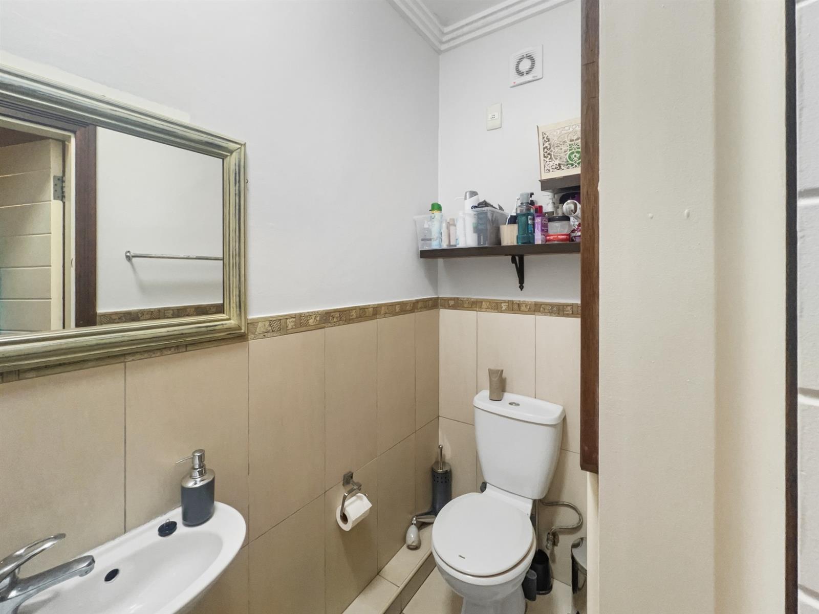 The bedroom is a tranquil retreat, with built-in cupboards and an en-suite bathroom featuring a shower, toilet, and basin.