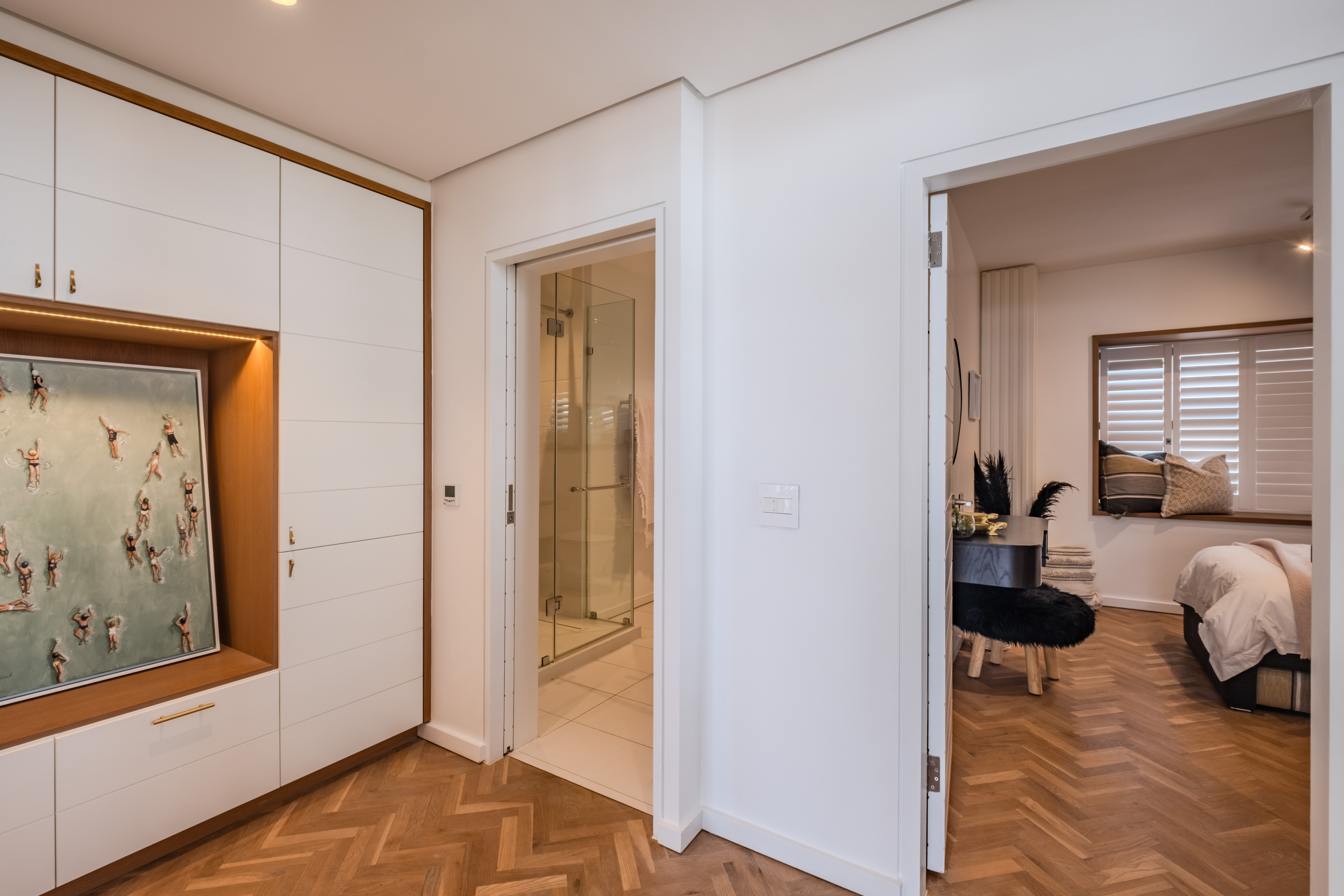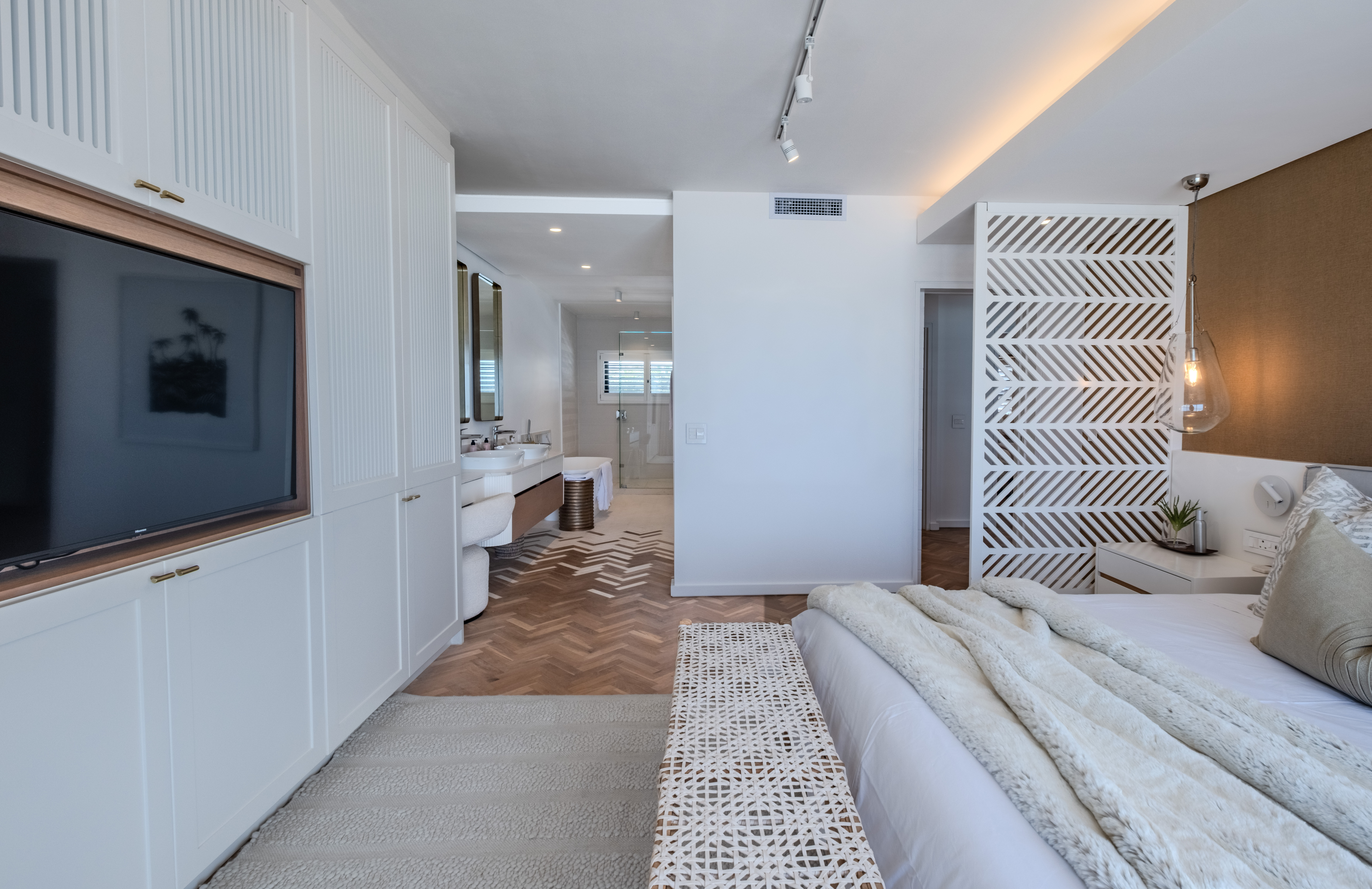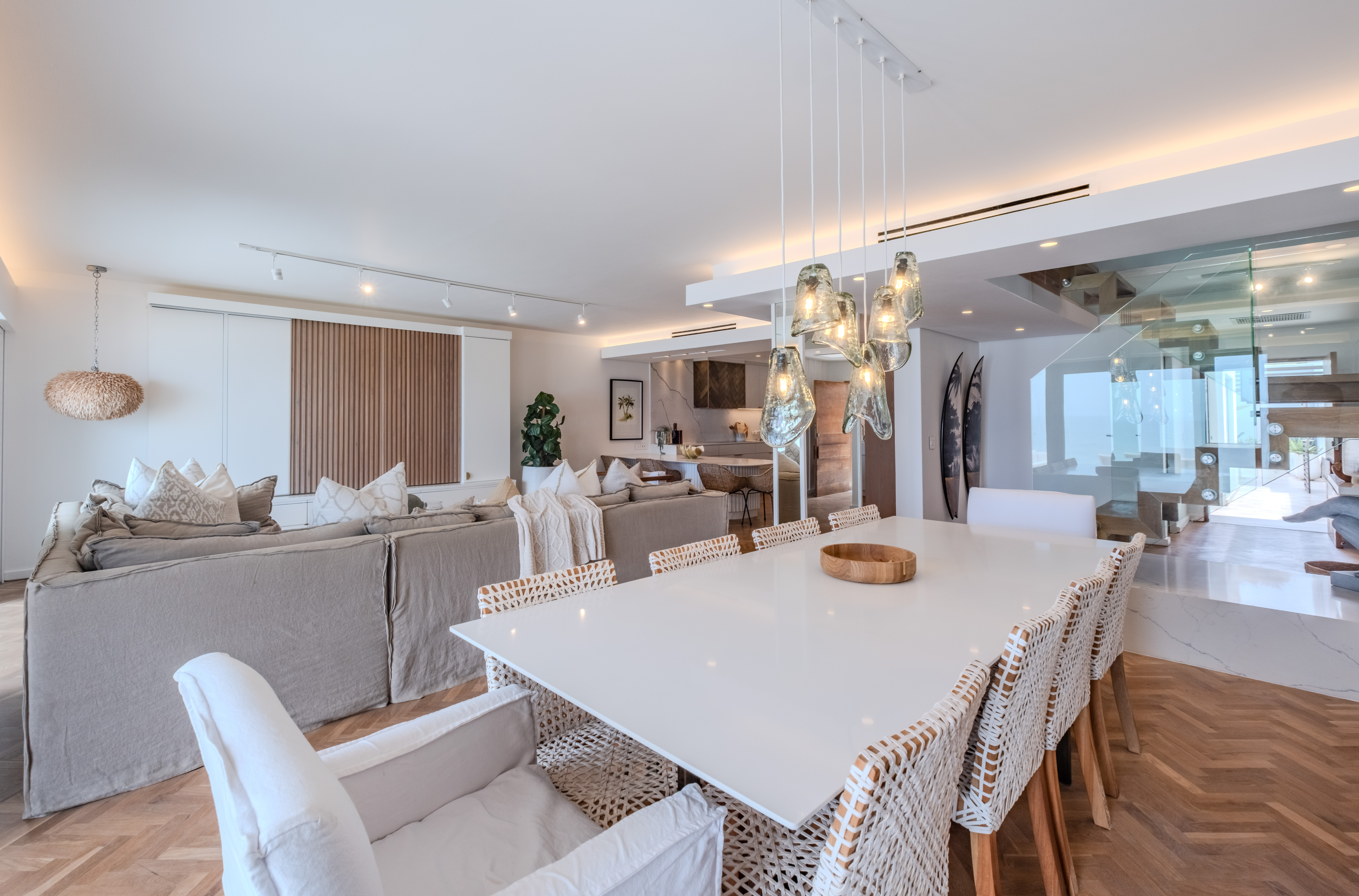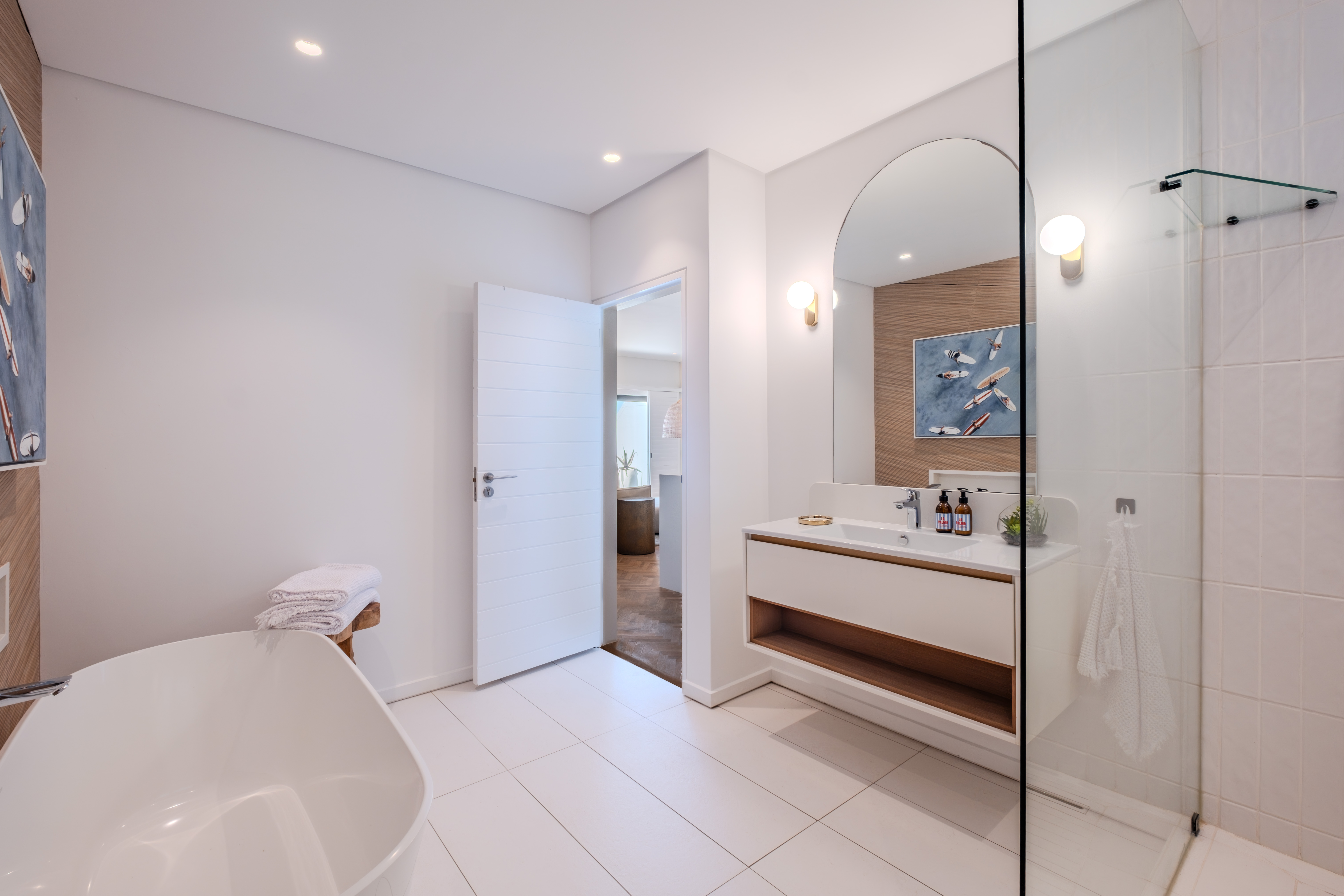 A stepless entrance leads directly from the double automated garage into the home. From the moment you enter, the panoramic Indian Ocean views take centre stage. The welcoming entrance hall flows effortlessly into expansive, open-plan living areas that transition seamlessly onto the spacious patio — ideal for entertaining or simply relaxing to the sound of the sea. The rich wooden herringbone floors enhance the home’s timeless elegance, while a discreetly positioned guest cloakroom offers convenience and refinement. A guest suite is also situated on this level, featuring an en-suite bathroom with an extra-length shower, vanity, and WC.