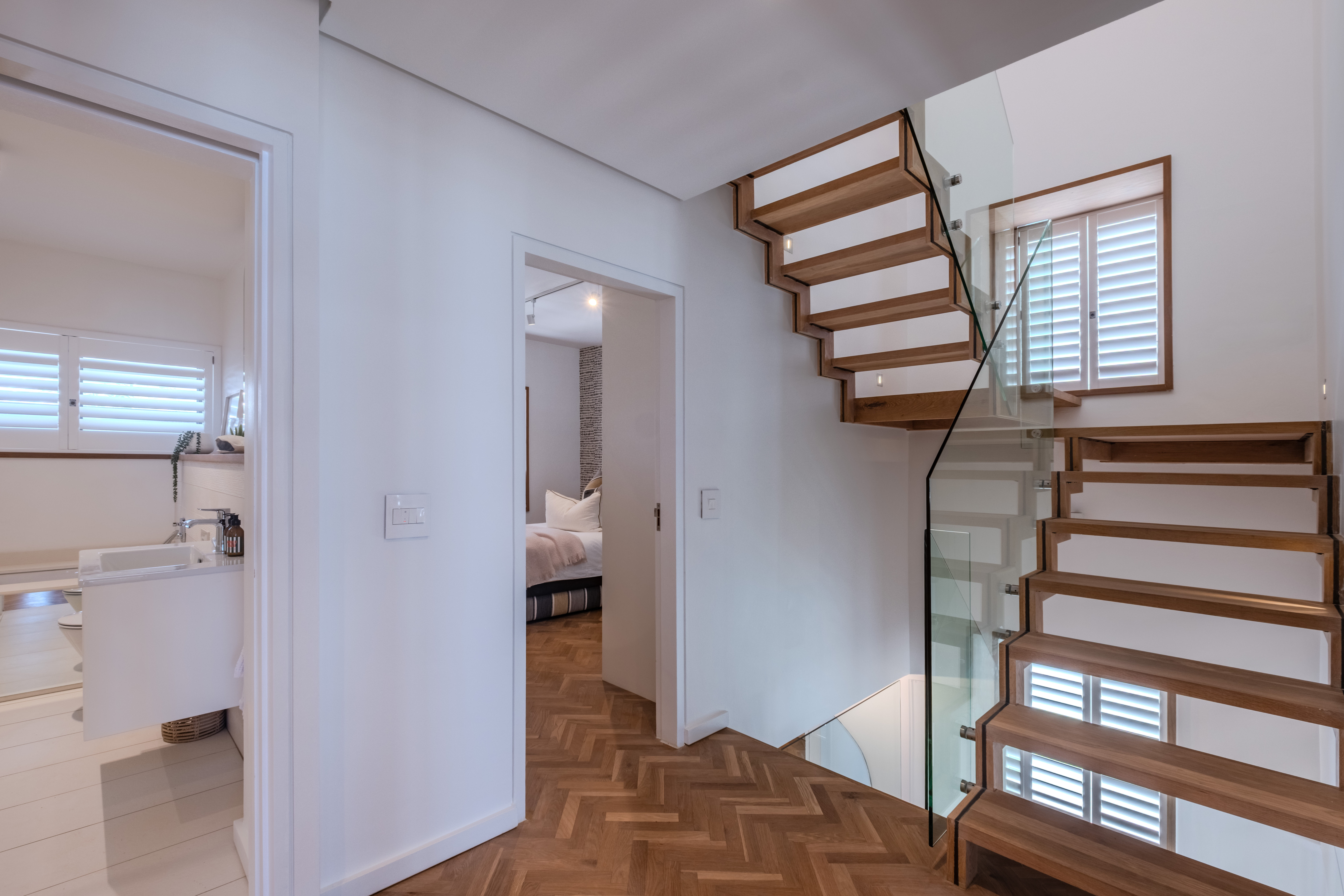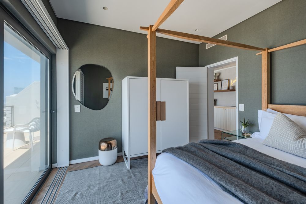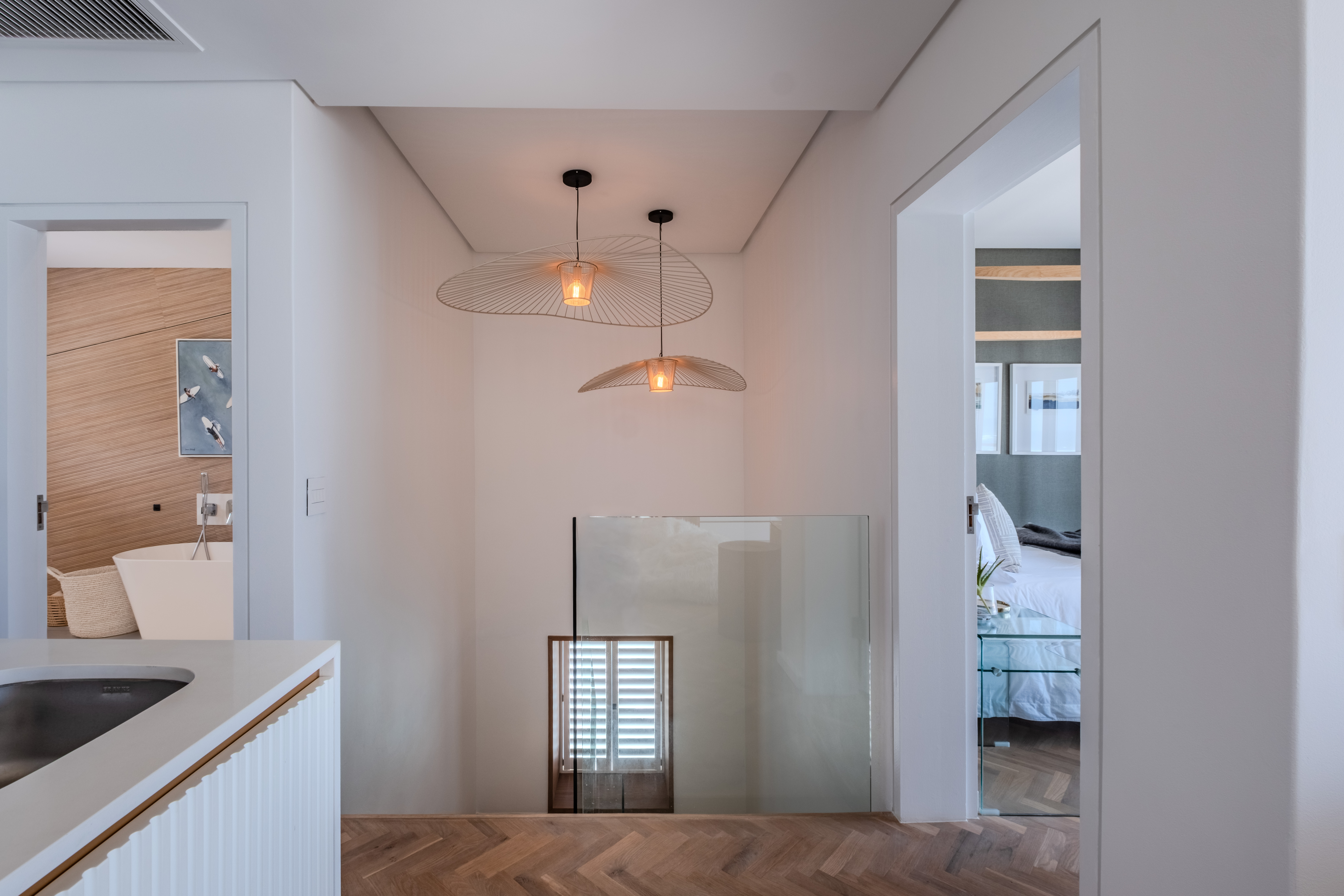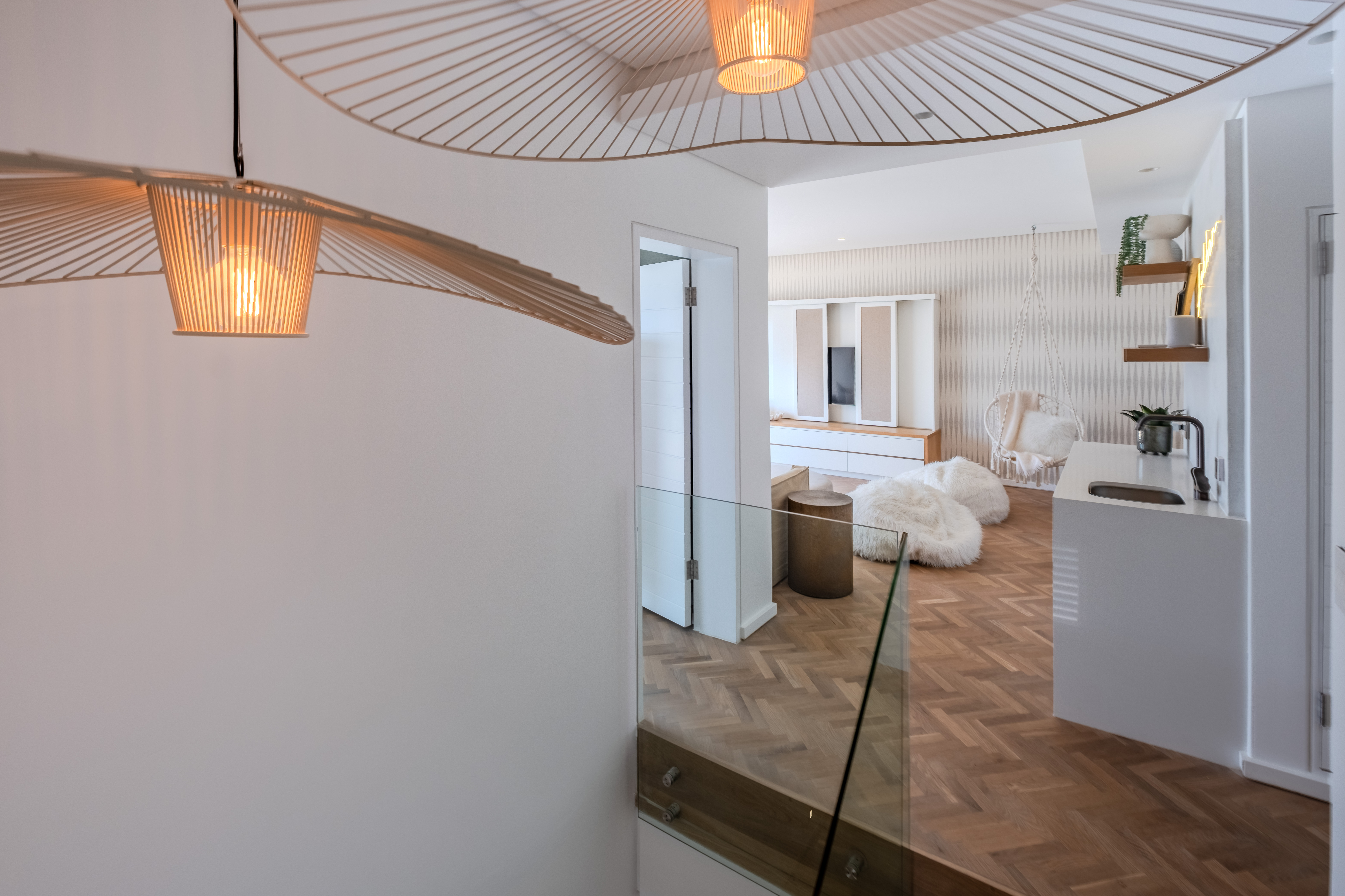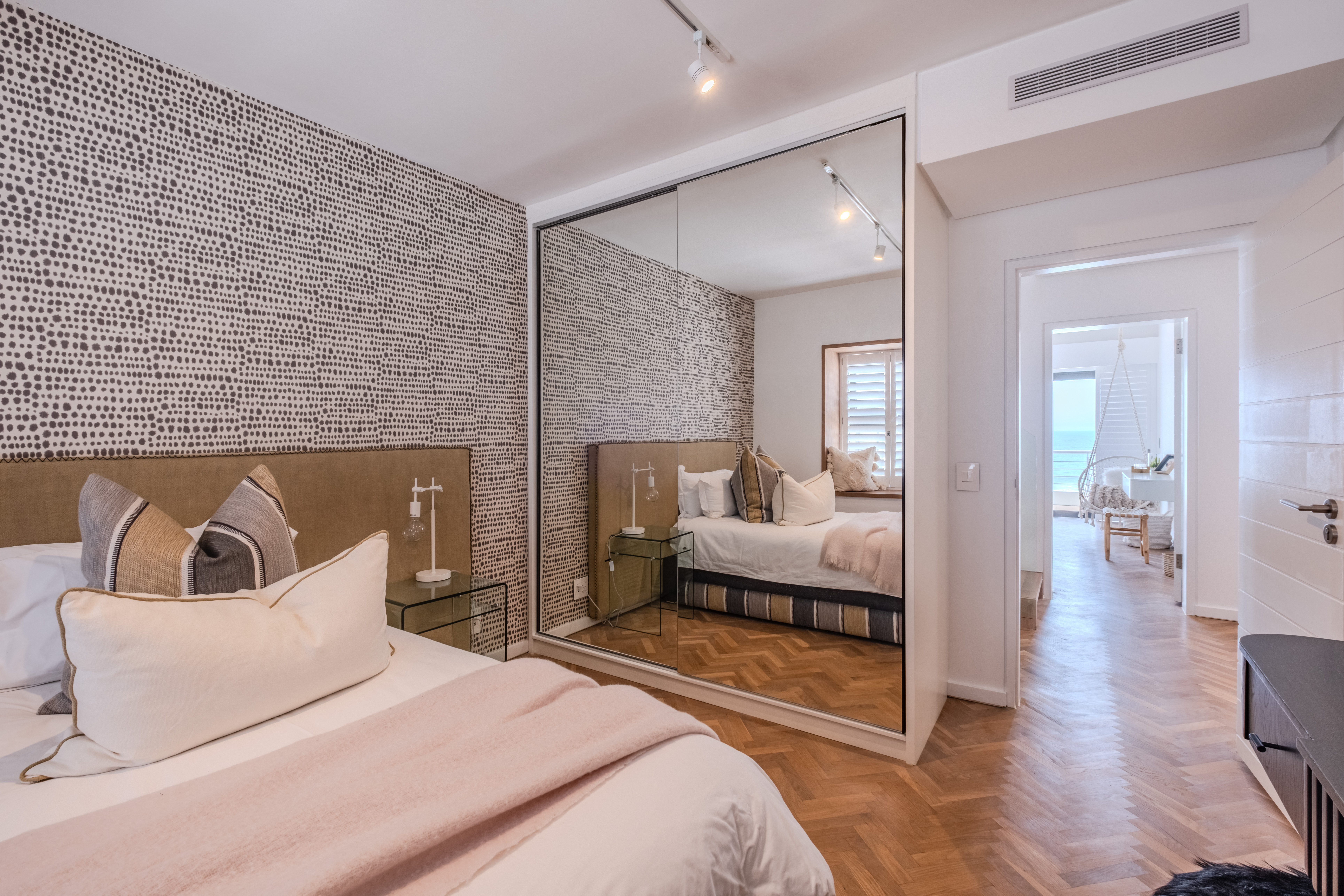 A stepless entrance leads directly from the double automated garage into the home. From the moment you enter, the panoramic Indian Ocean views take centre stage. The welcoming entrance hall flows effortlessly into expansive, open-plan living areas that transition seamlessly onto the spacious patio — ideal for entertaining or simply relaxing to the sound of the sea. The rich wooden herringbone floors enhance the home’s timeless elegance, while a discreetly positioned guest cloakroom offers convenience and refinement. A guest suite is also situated on this level, featuring an en-suite bathroom with an extra-length shower, vanity, and WC.