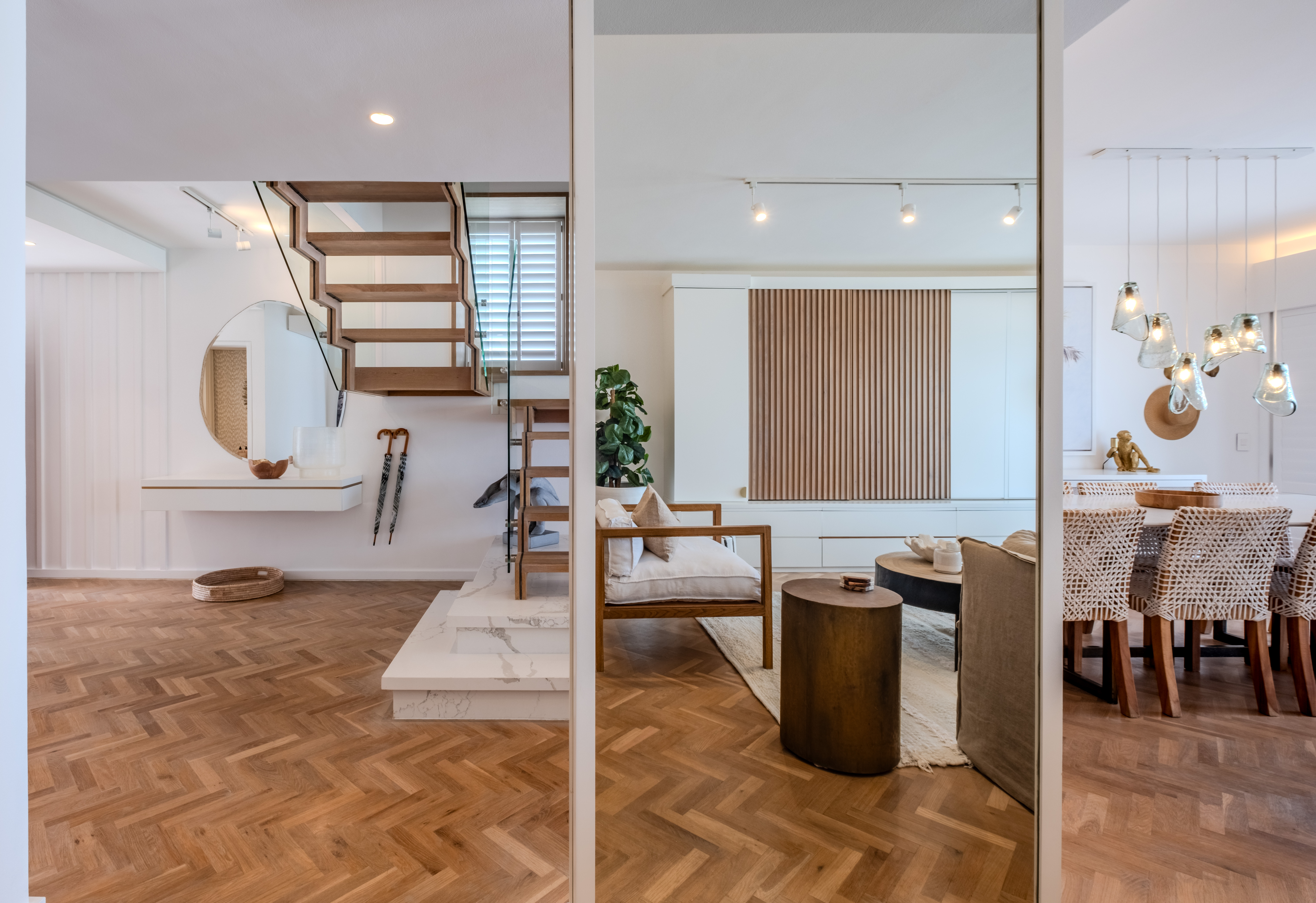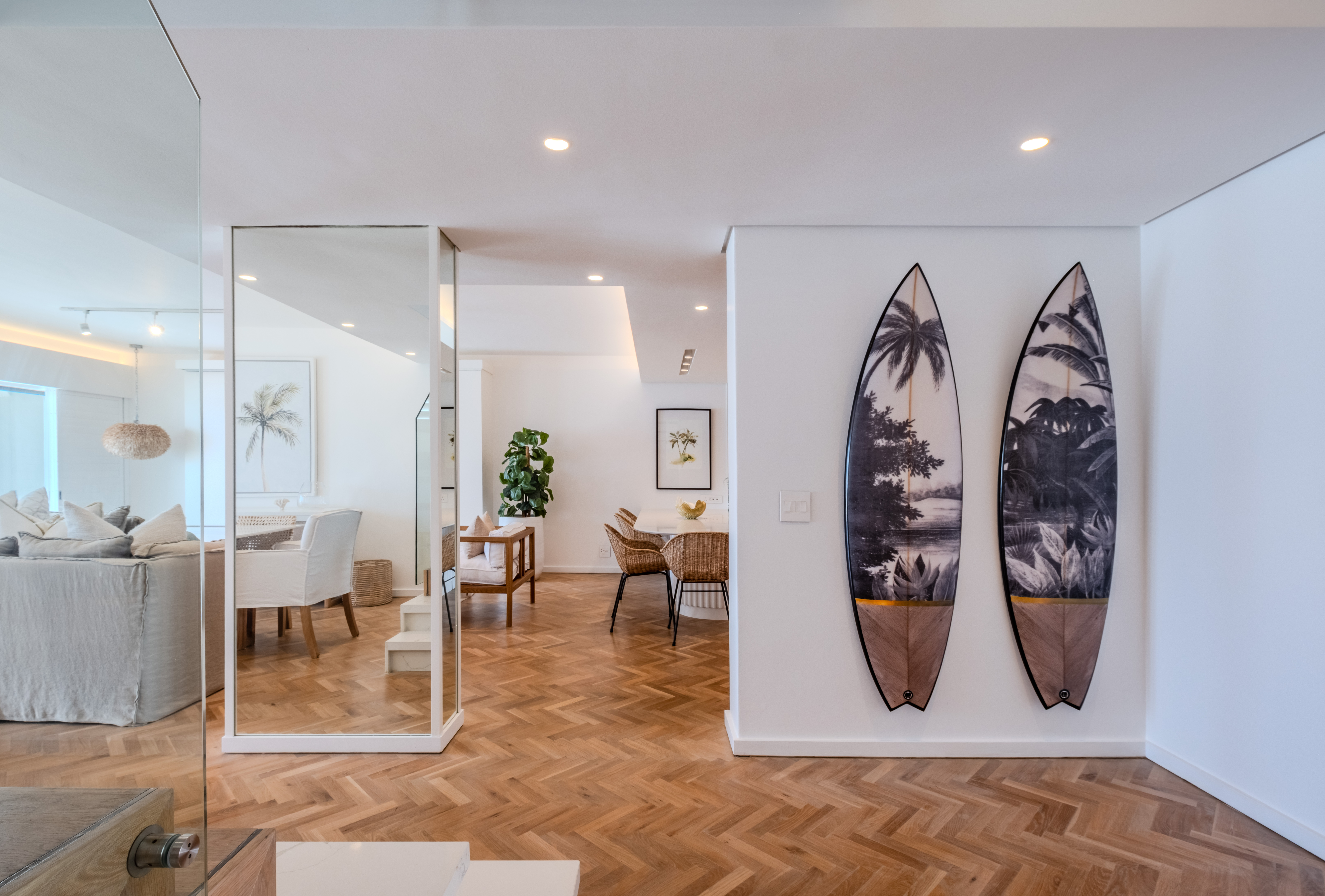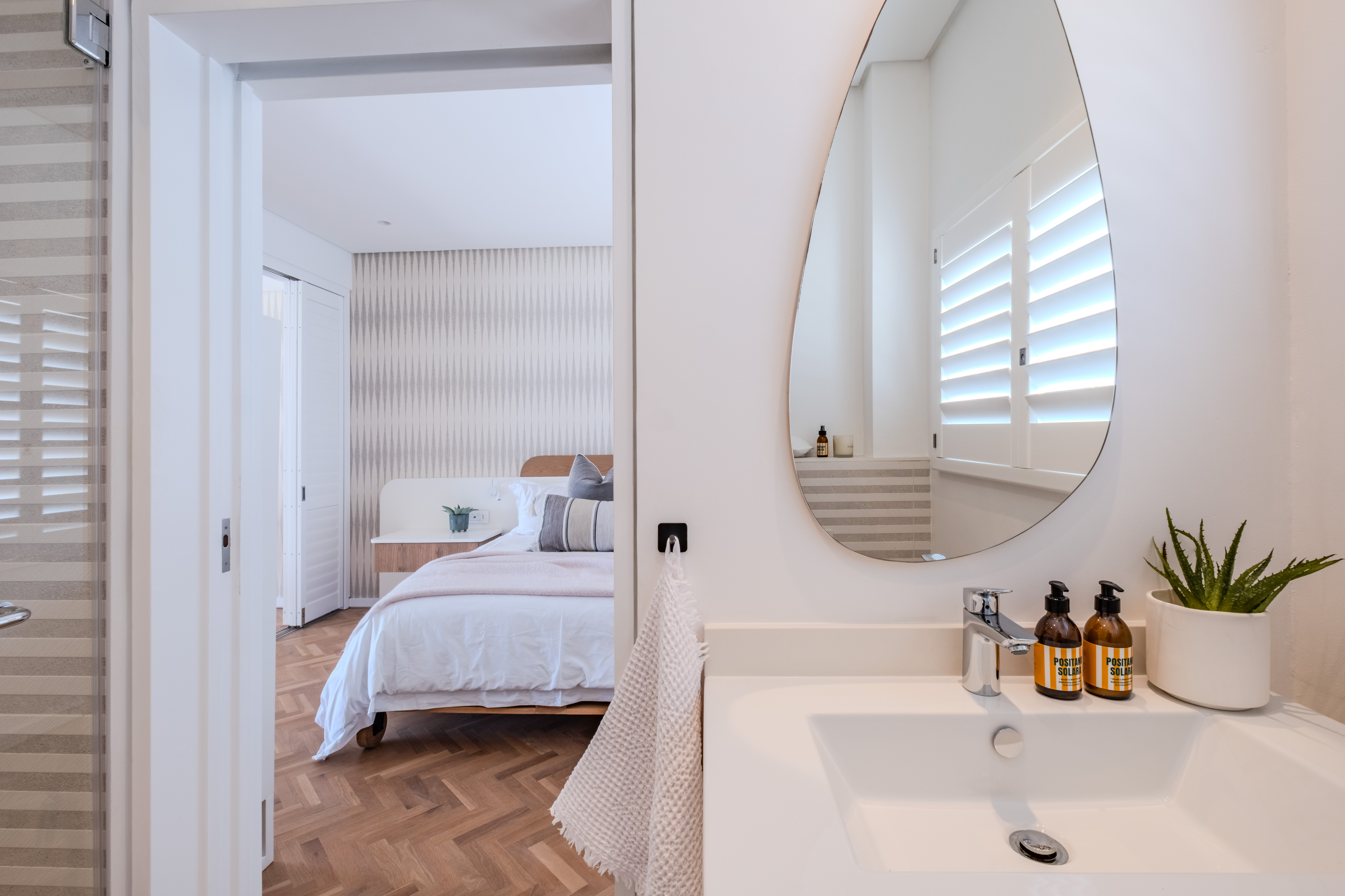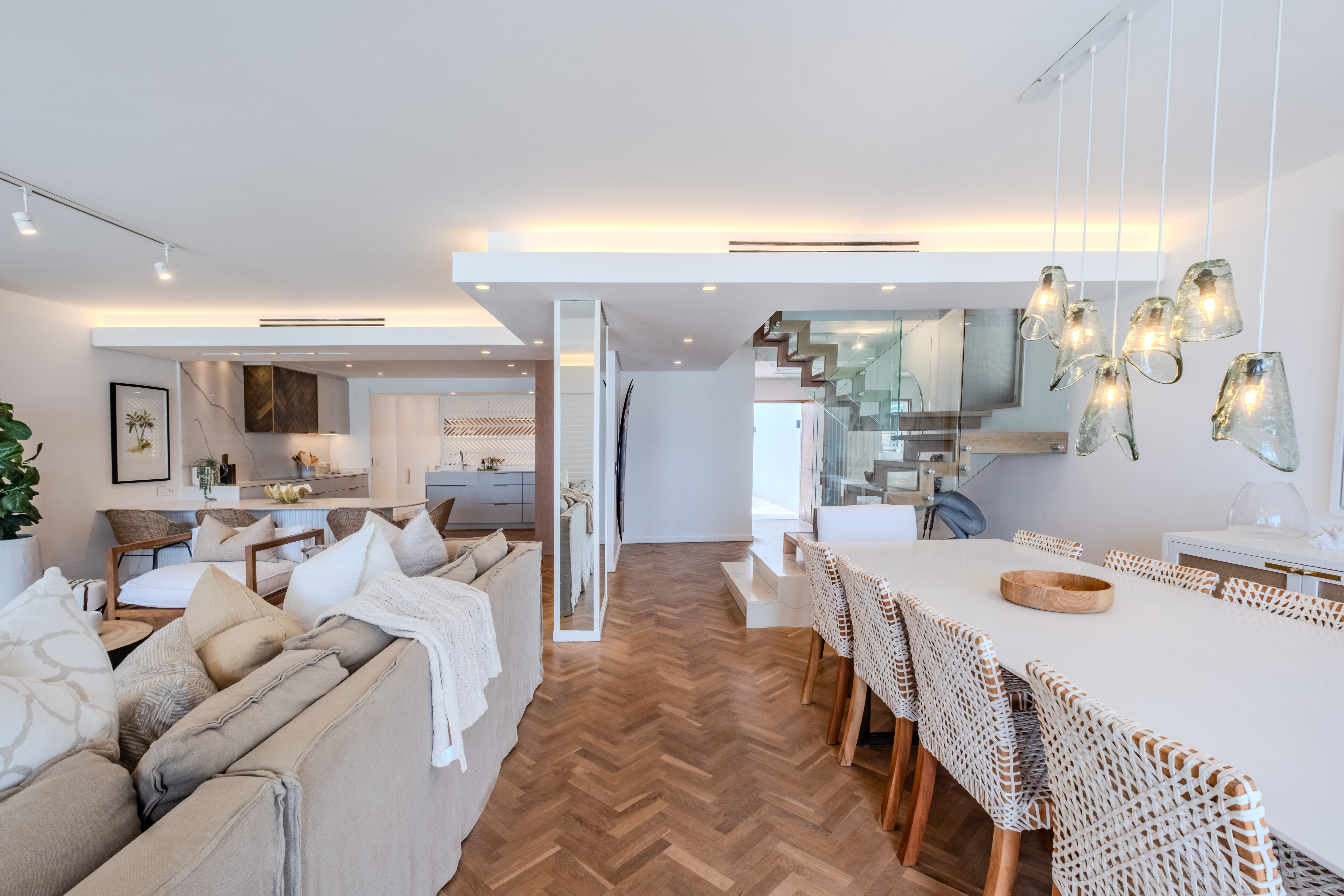 A stepless entrance leads directly from the double automated garage into the home. From the moment you enter, the panoramic Indian Ocean views take centre stage. The welcoming entrance hall flows effortlessly into expansive, open-plan living areas that transition seamlessly onto the spacious patio — ideal for entertaining or simply relaxing to the sound of the sea. The rich wooden herringbone floors enhance the home’s timeless elegance, while a discreetly positioned guest cloakroom offers convenience and refinement. A guest suite is also situated on this level, featuring an en-suite bathroom with an extra-length shower, vanity, and WC.