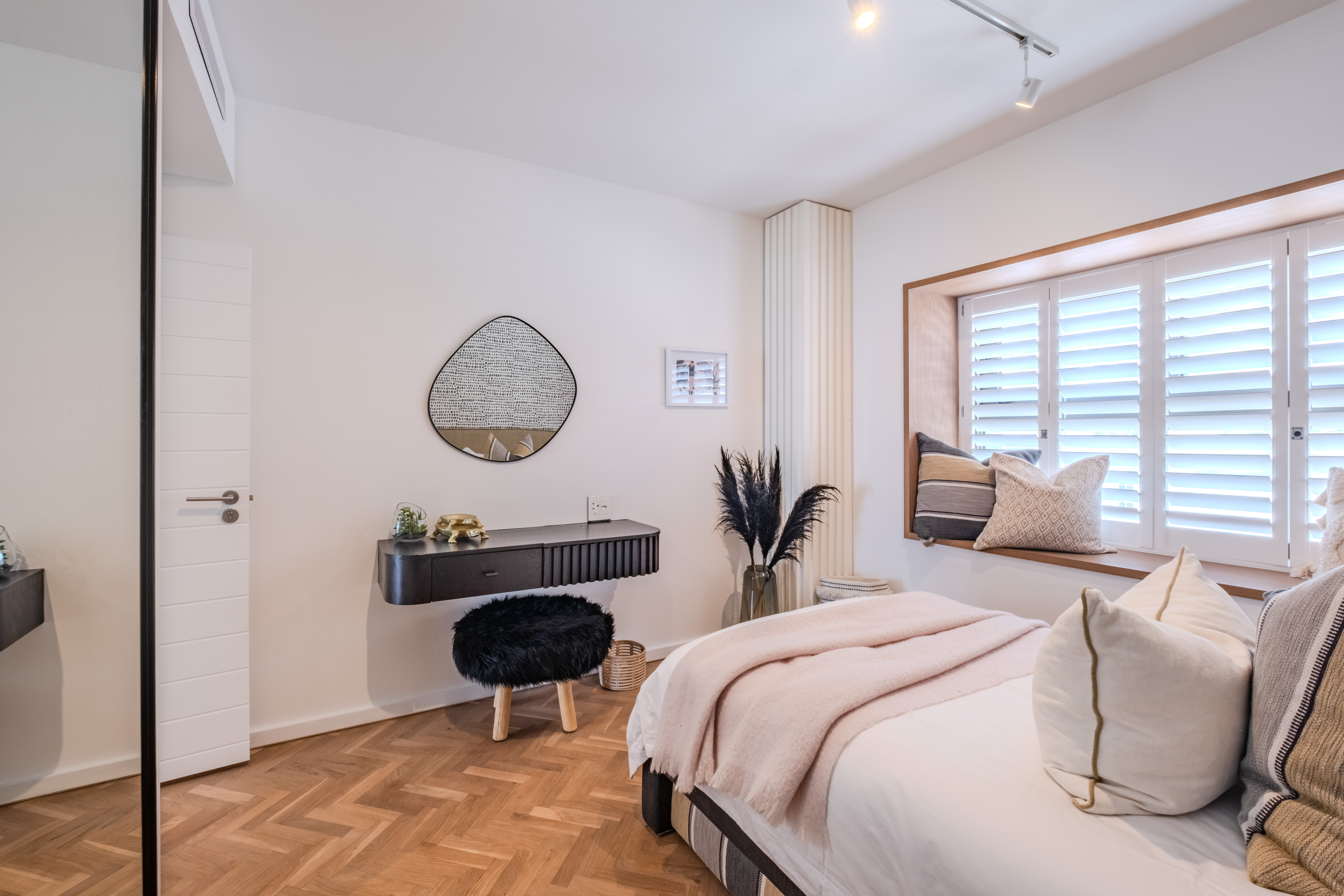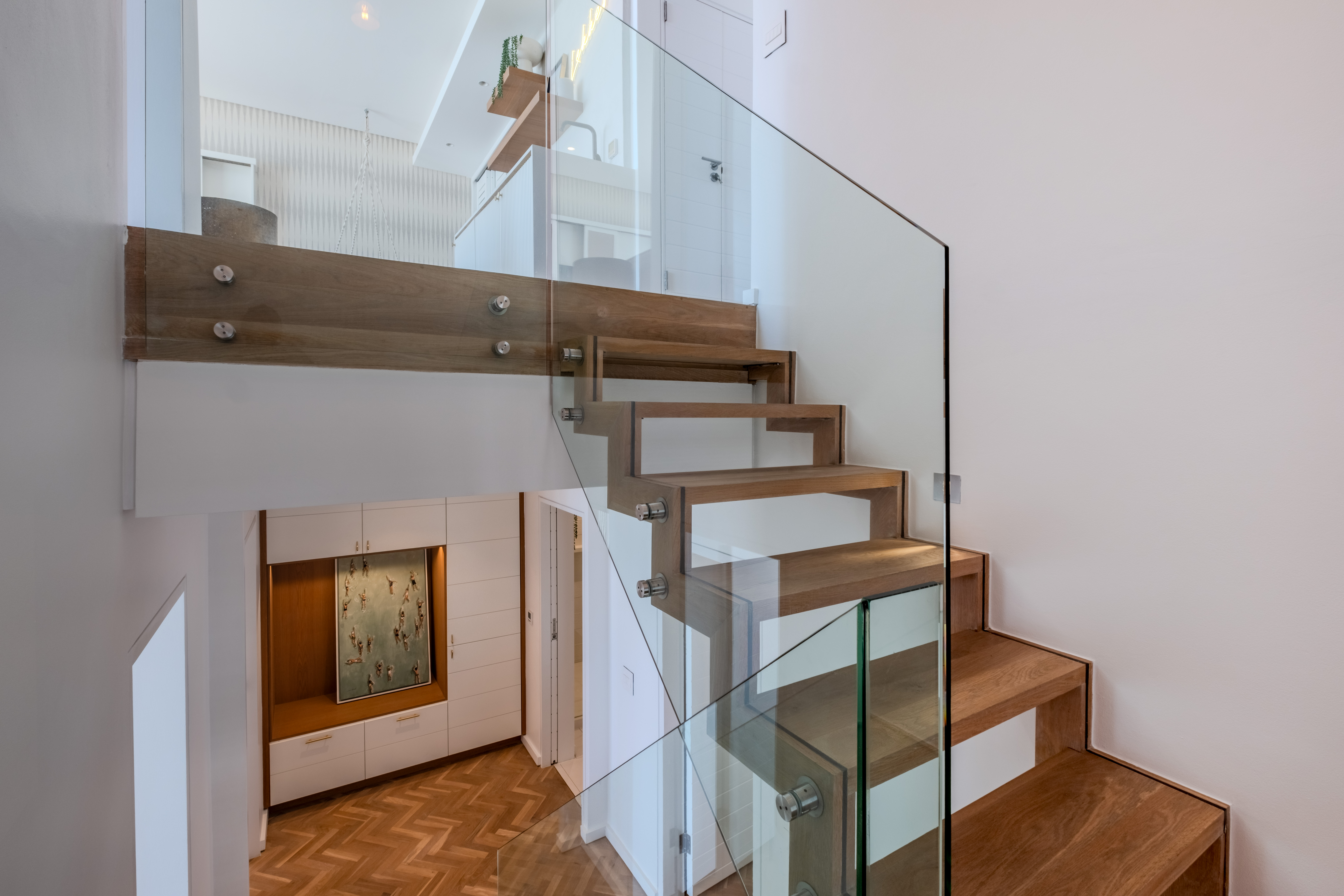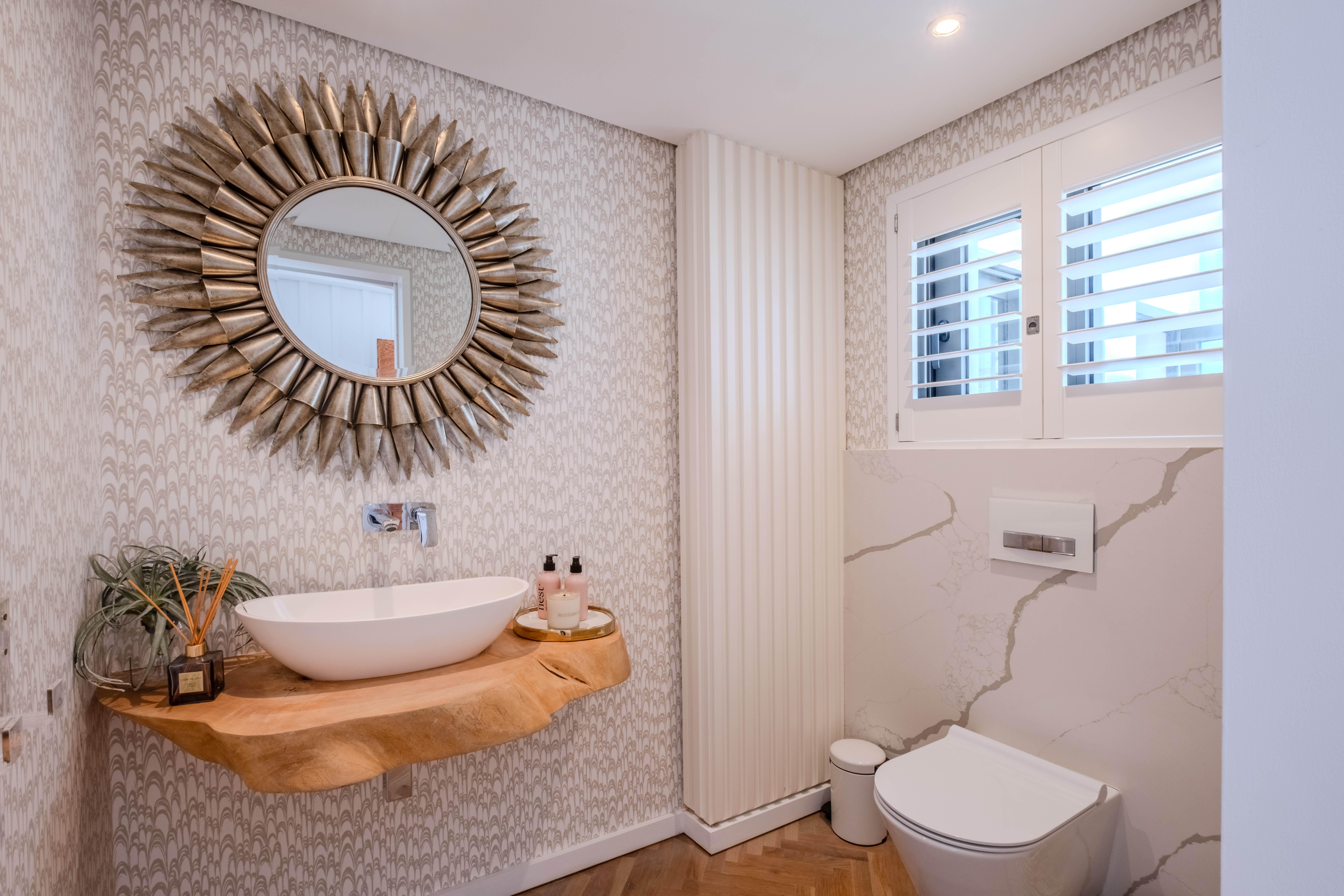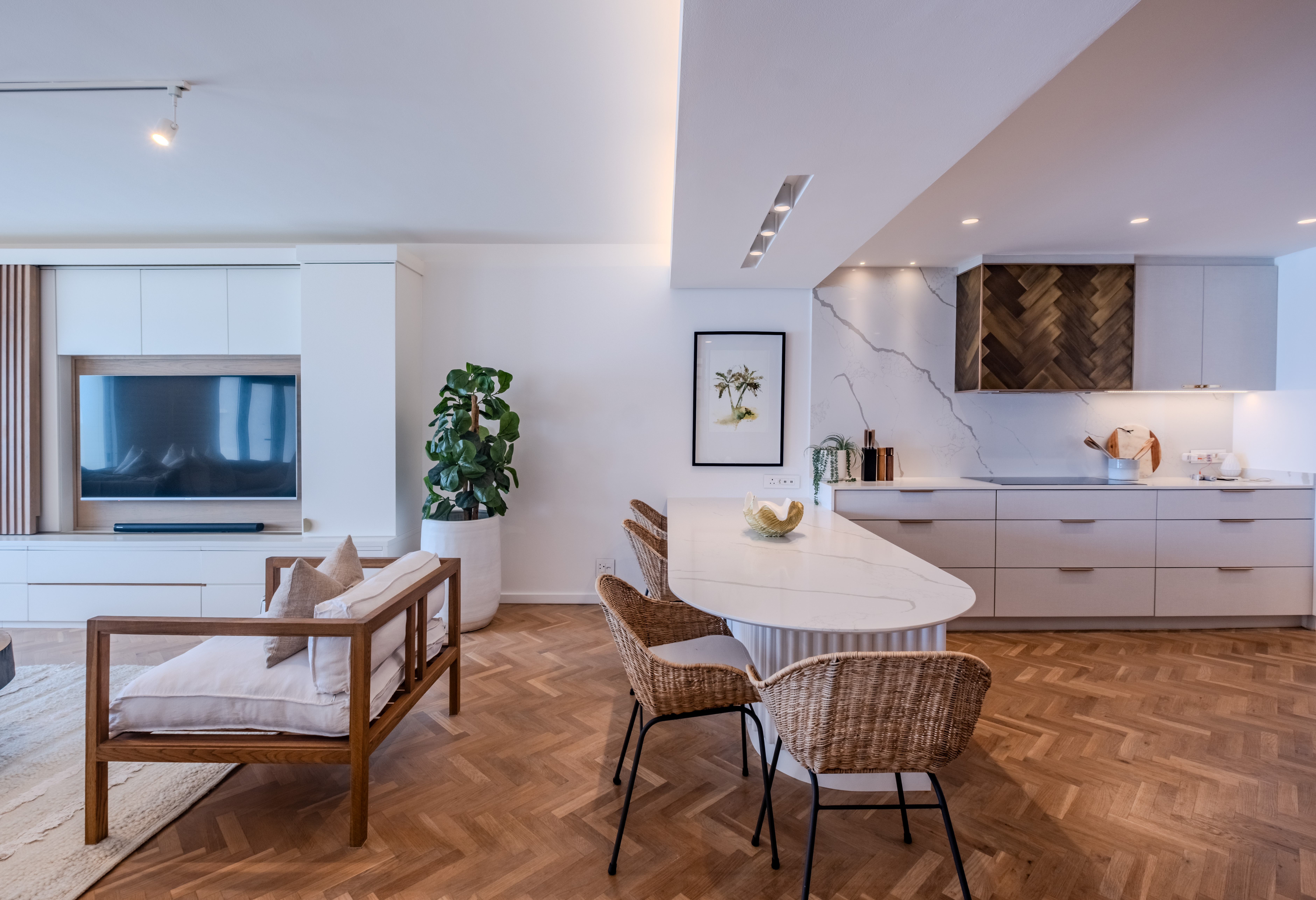 A stepless entrance leads directly from the double automated garage into the home. From the moment you enter, the panoramic Indian Ocean views take centre stage. The welcoming entrance hall flows effortlessly into expansive, open-plan living areas that transition seamlessly onto the spacious patio — ideal for entertaining or simply relaxing to the sound of the sea. The rich wooden herringbone floors enhance the home’s timeless elegance, while a discreetly positioned guest cloakroom offers convenience and refinement. A guest suite is also situated on this level, featuring an en-suite bathroom with an extra-length shower, vanity, and WC.