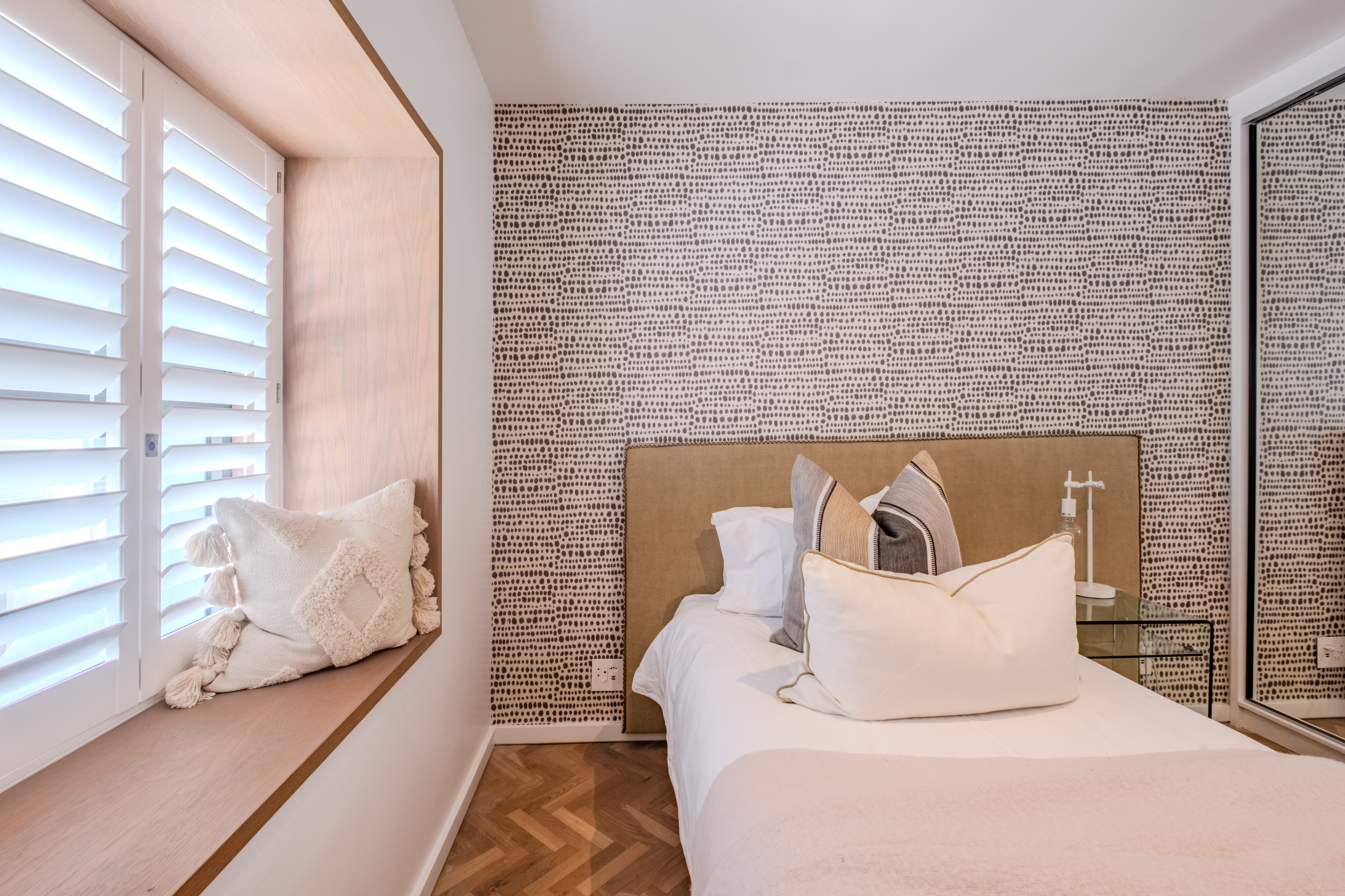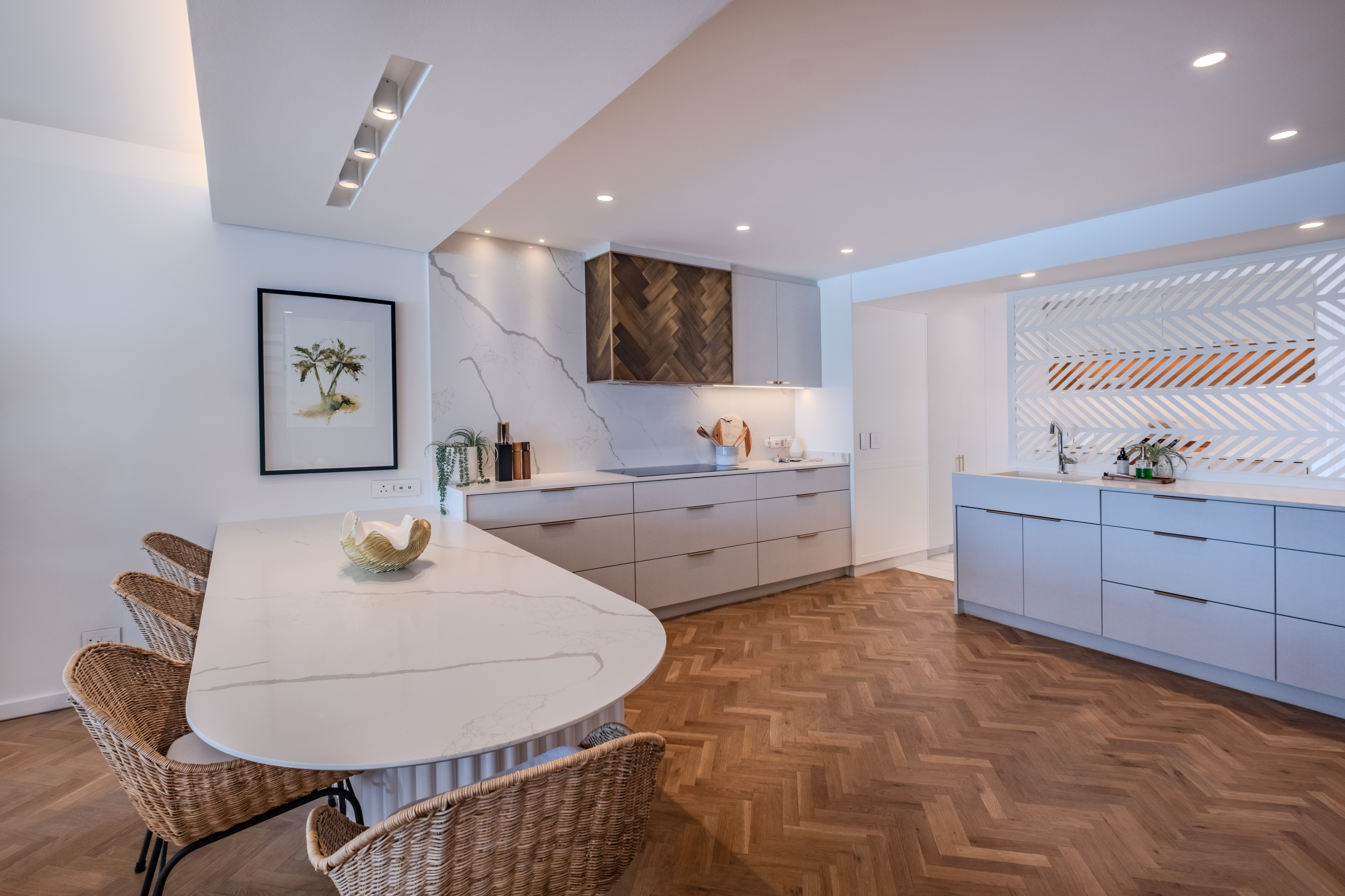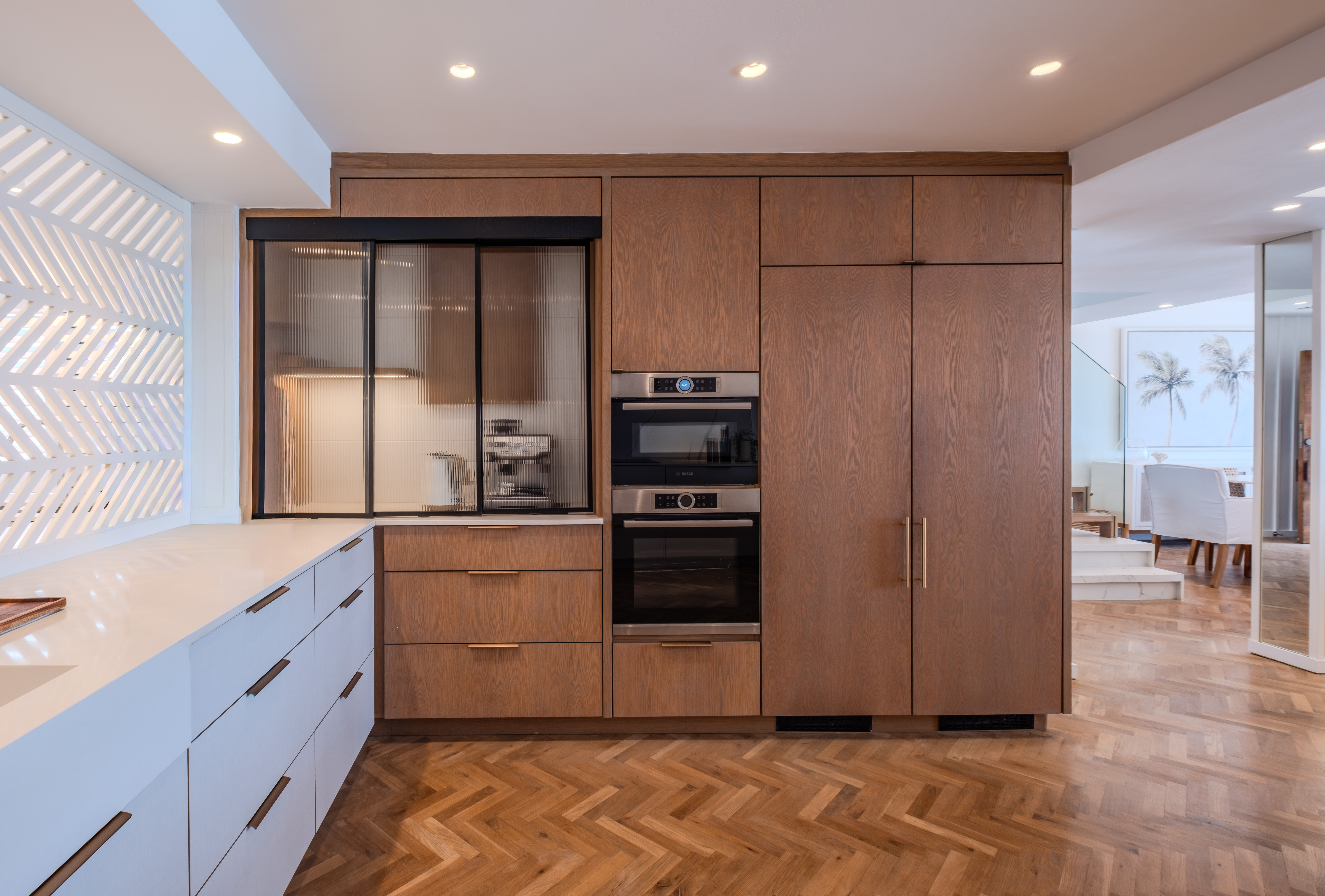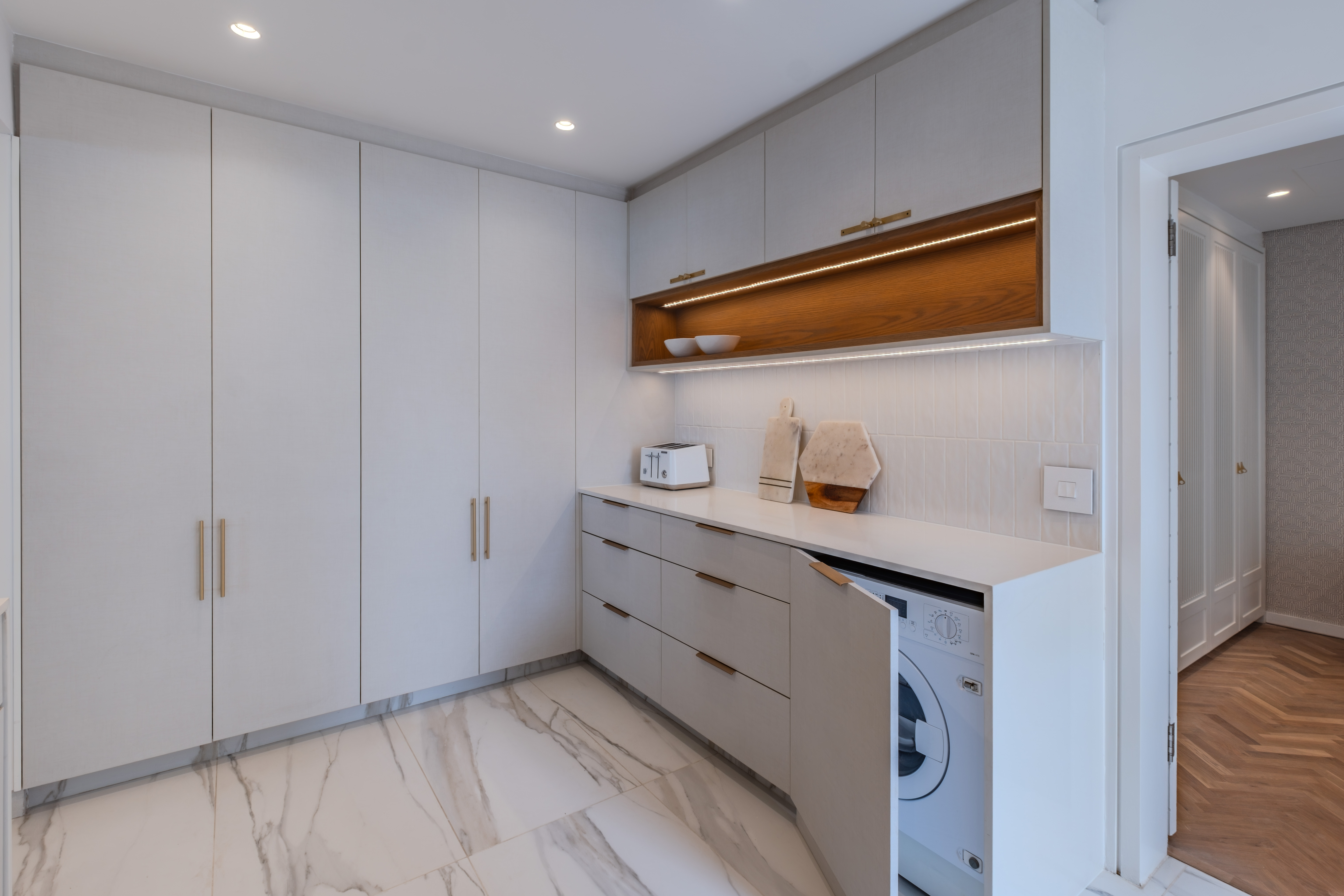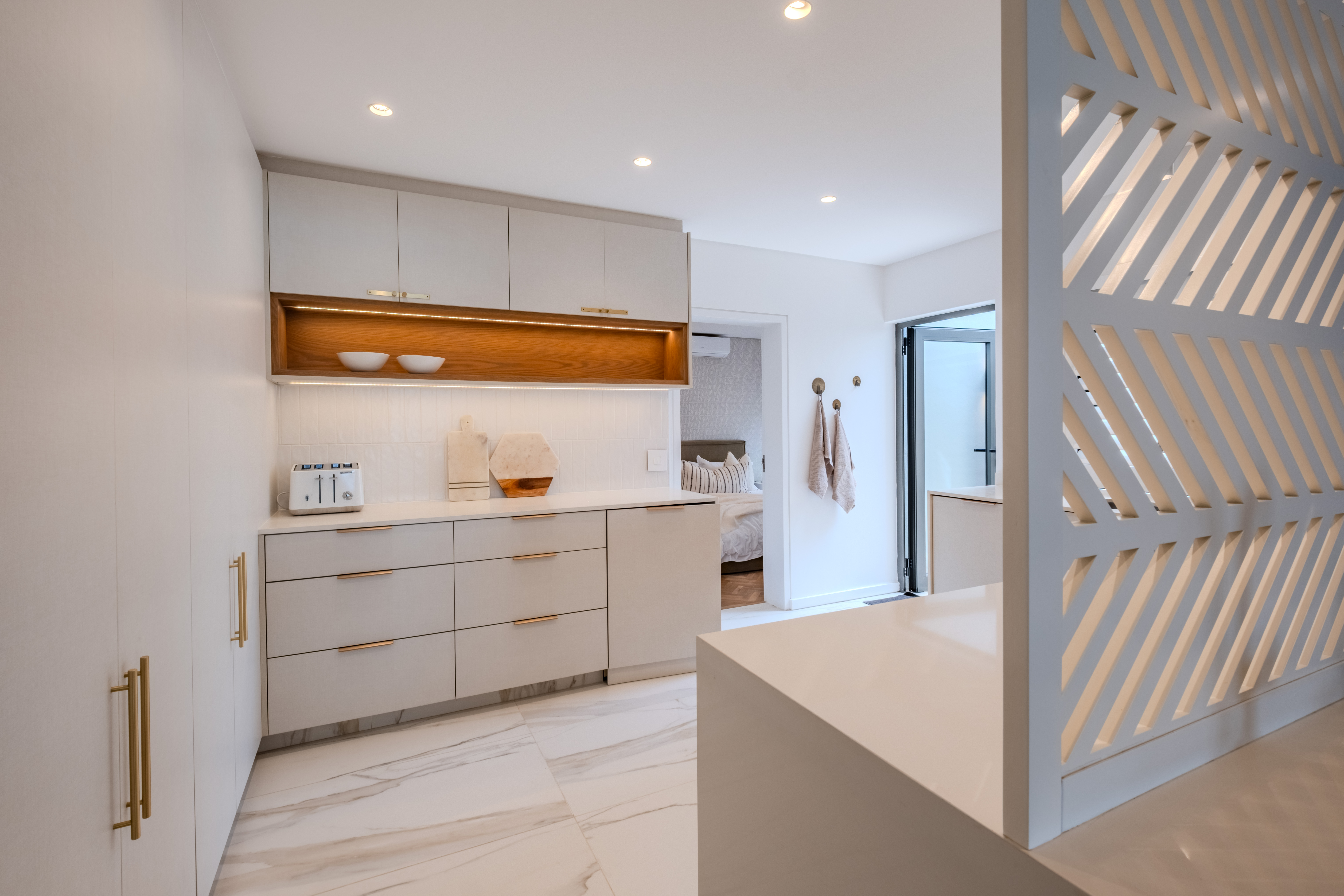 The designer kitchen is beautifully appointed with soft-close cabinetry, a separate scullery, and fully integrated appliances including fridge, freezer, dishwasher, washing machine, electric stovetop with integrated extractor, and eye-level oven with convection microwave. An enclosed courtyard lies just beyond the kitchen door.